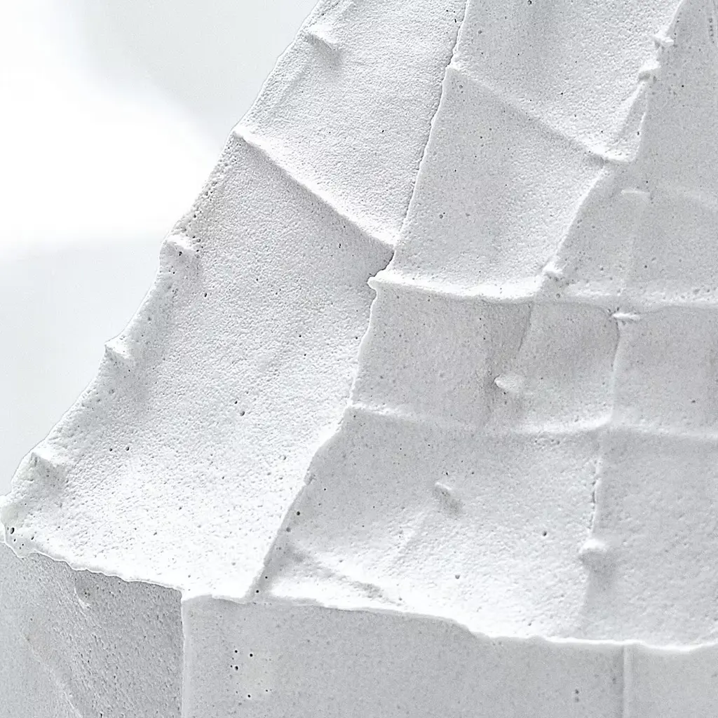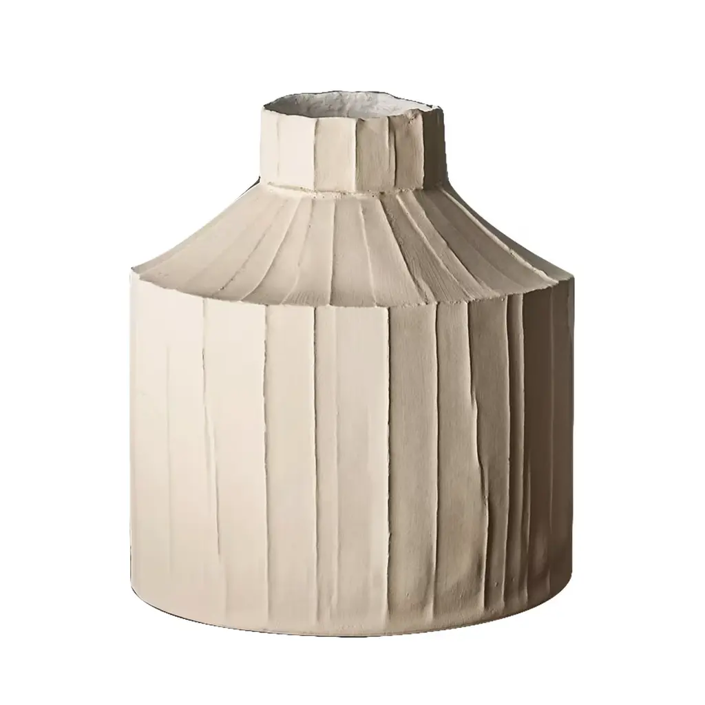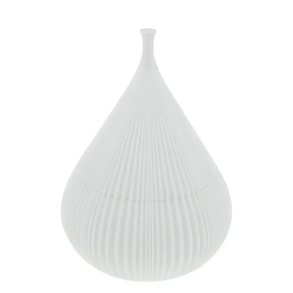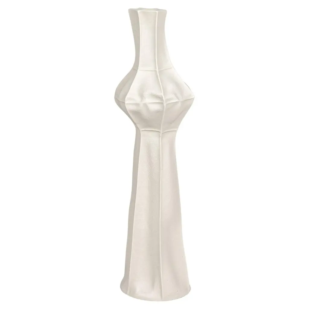 Part of the Fide series of sculptures, inspired by the majestic architecture of the cathedrals, this bottle-shaped piece is handcrafted in Paronetto’s signature paper clay, a clay base with paper pulp and natural fibers. The silhouette rises from three tiers of round shapes in decreasing size, with a textured surface of vertical segments. The bright white color adds an ethereal flair to this unique still-life object that can be displayed with other pieces from the same designer for a refined look.. Every one of Paola Paronetto’s creations is unique. Slight variations in shape, colour and size are to be considered a guarantee of authenticity and value. They are finished with non-toxic satin-finish enamels. Although very rarely, it is possible for them to leak after long periods of exposure to water. It is therefore advisable to test their water resistance before using them on delicate surfaces. They should not be used as dining utensils. The white pieces can be washed with water or sanitizing products, whereas the coloured pieces must be treated more gently and cleaned with a feather duster or a soft cloth, dry or moistened very slightly with water.