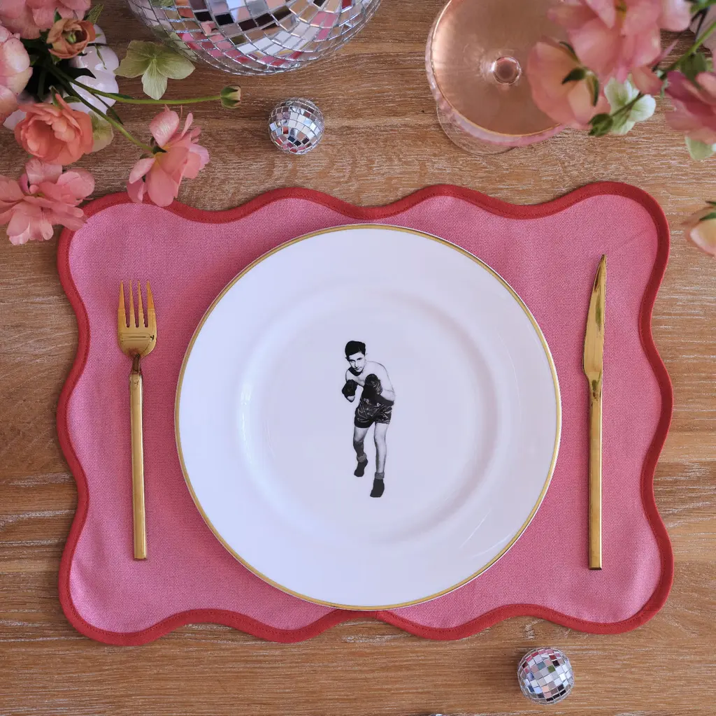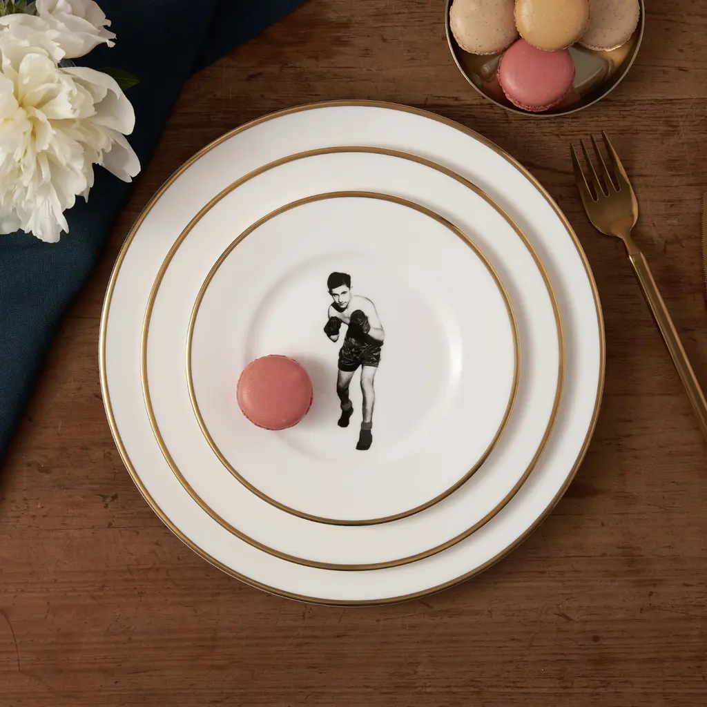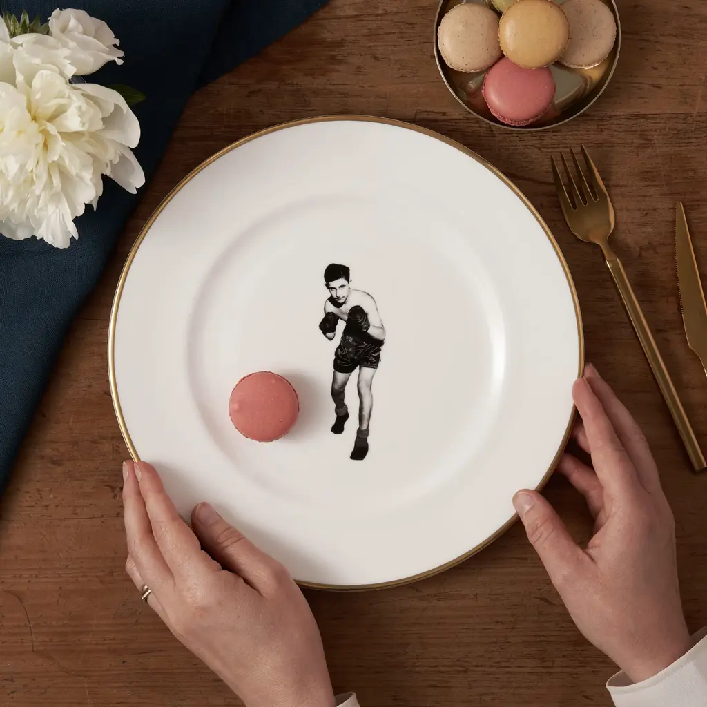 Set the table in unique style with an exquisitely handcrafted fine bone china dinner plate featuring boxing inspired 'Fighting Spirit'.Finished with hand painted 22kt burnished gold trim.Perfect on it's own or mix and match designs from the Melody Rose collections for a contemporary take on traditional fine china.Design also available and in smaller lunch and dessert plate sizes as well as dinner plates with a Forest Green, Raspberry Pink or Cobalt Blue border.The playful design paired with the best of British craftsmanship make this a great gift for foodies, designs lovers and boxing fans.