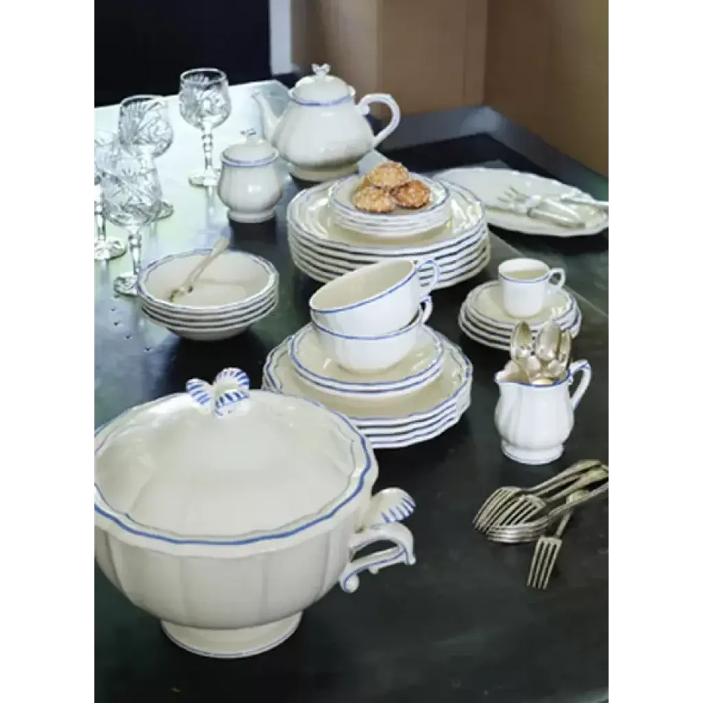 In crisp blue and white, Gien's Filets Bleus service is a timeless classic characterized by a shell border and handpainted lines. Faience earthenware made in France by Gien. Four-piece place setting includes dinner plate, dessert plate, bowl, and mug. Five-piece place setting includes dinner plate, dessert plate, canape plate, US tea cup, and saucer. Located near the Loire Valley castles, the Faïencerie de Gien has been synonymous with prestigious faience tableware and decorative objects since its founding in 1821. Gien pieces are renowned for their warm white clays decorated with traditional motifs reminiscent of the French countryside.