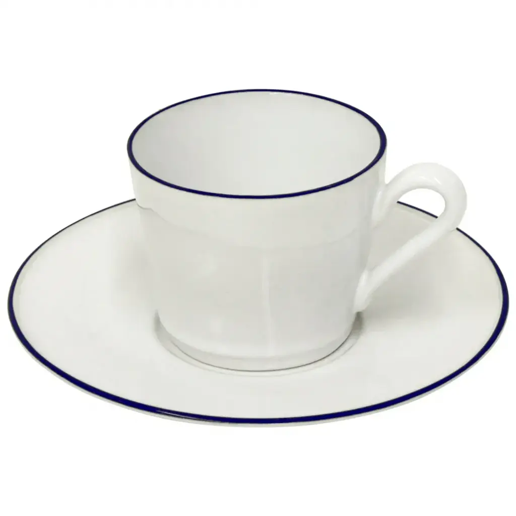Gien's Filets Cobalt service is a timeless classic characterized by a shell border and handpainted lines. Faience earthenware made in France by Gien. Four-piece place setting includes dinner plate, dessert plate, bowl, and mug. Five-piece place setting includes dinner plate, dessert plate, canape plate, US tea cup, and saucer. Located near the Loire Valley castles, the Faïencerie de Gien has been synonymous with prestigious faience tableware and decorative objects since its founding in 1821. Gien pieces are renowned for their warm white clays decorated with traditional motifs reminiscent of the French countryside.