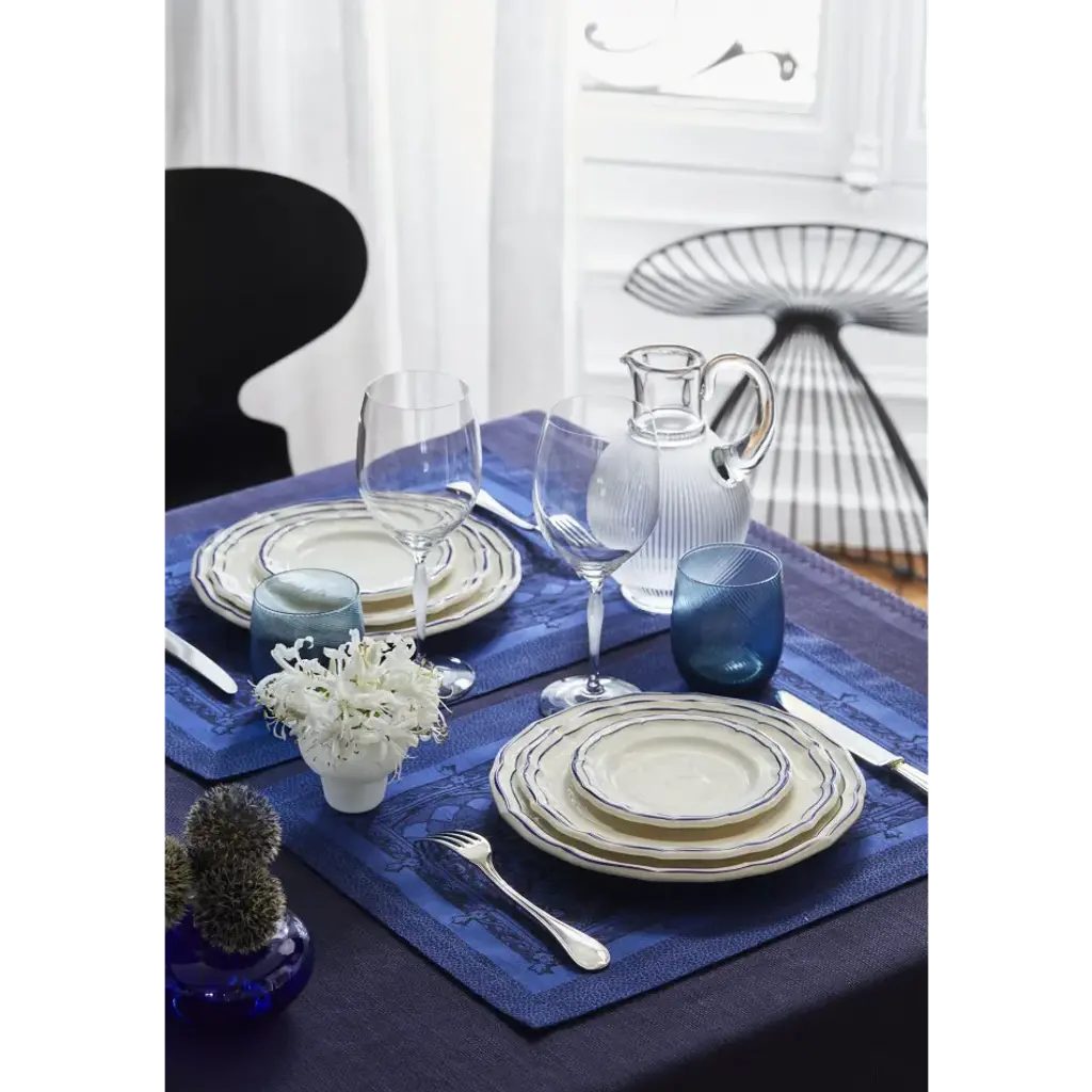 Gien's Filets Cobalt service is a timeless classic characterized by a shell border and handpainted lines. Faience earthenware made in France by Gien. Four-piece place setting includes dinner plate, dessert plate, bowl, and mug. Five-piece place setting includes dinner plate, dessert plate, canape plate, US tea cup, and saucer. Located near the Loire Valley castles, the Faïencerie de Gien has been synonymous with prestigious faience tableware and decorative objects since its founding in 1821. Gien pieces are renowned for their warm white clays decorated with traditional motifs reminiscent of the French countryside.