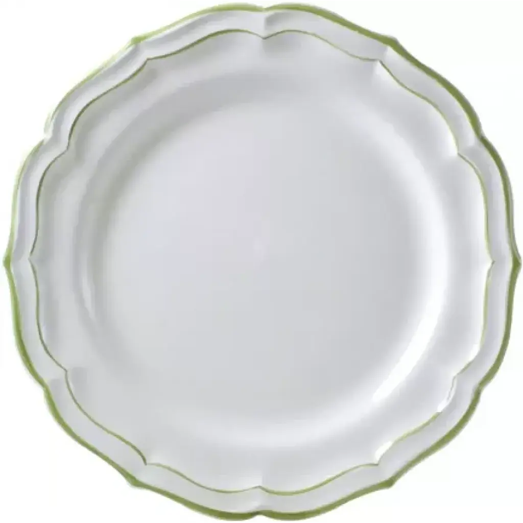 Gien's Filets Verts service is a timeless classic characterized by a shell border and handpainted lines. Faience earthenware made in France by Gien. Four-piece place setting includes dinner plate, dessert plate, bowl, and mug. Five-piece place setting includes dinner plate, dessert plate, canape plate, US tea cup, and saucer. Located near the Loire Valley castles, the Faïencerie de Gien has been synonymous with prestigious faience tableware and decorative objects since its founding in 1821. Gien pieces are renowned for their warm white clays decorated with traditional motifs reminiscent of the French countryside.