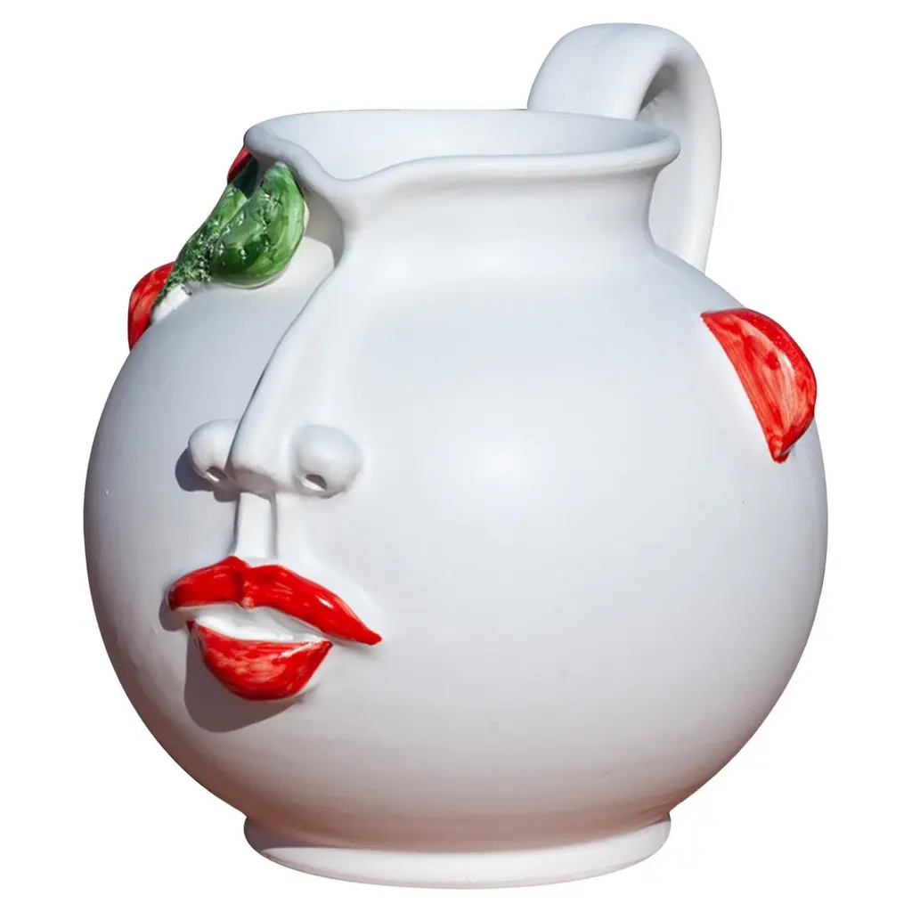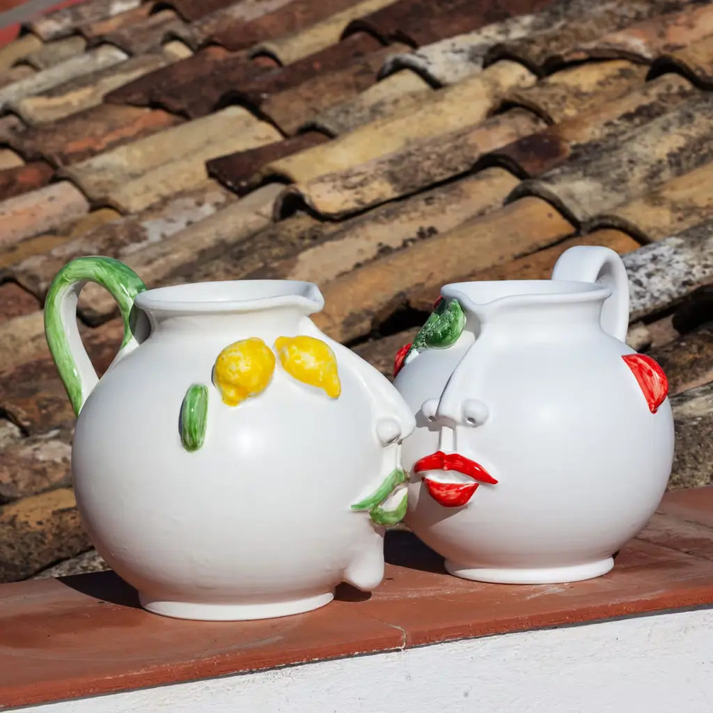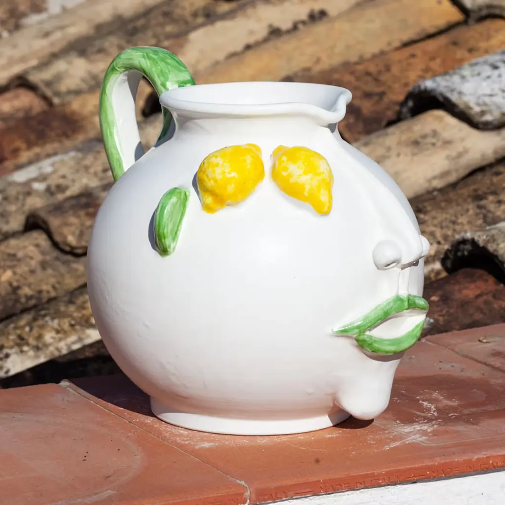 Filomena, a Sicilian female steet vendor of lemons, inspired master ceramist Patrizia Italian to handcraft this stylish anthropomorphic pitcher in ivory-glazed ceramic with a matt finish. The nose and chin are superbly rendered in their dramatic profile, while the fleshy lips, stylized ears, and sinuous handle are accented with green enamel. Half lemons painted in bright yellow also adorn the pitcher's generously bulging body.