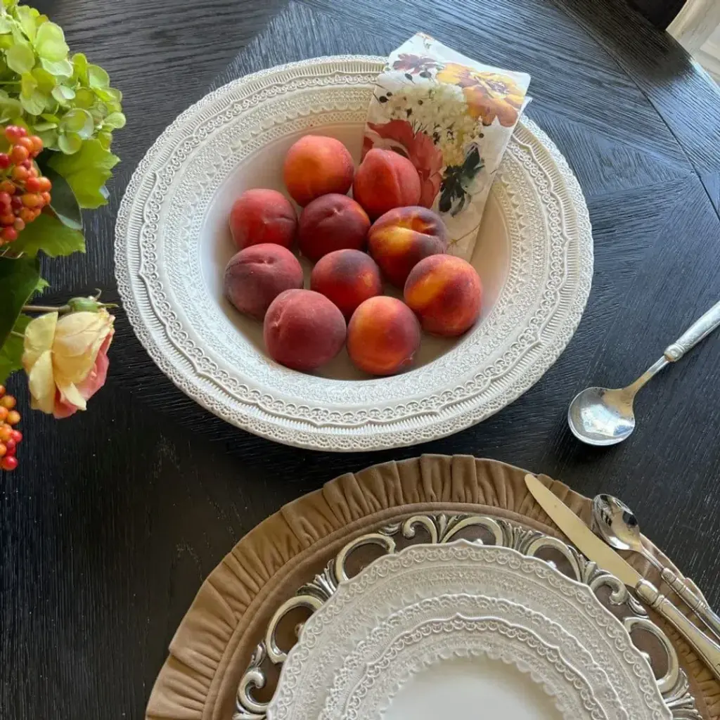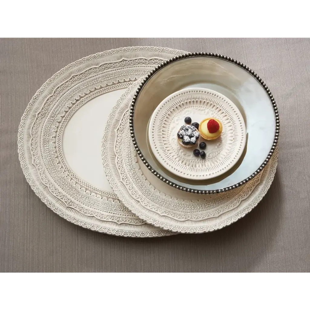 The Finezza Cream Large Serving Bowl adorns a wide, intricate lace design on its border. Pairs beautifully with all of our Finezza pieces. A beautiful serving piece for any table. Italian ceramic, hand made in Italy. Founded in 1997 by Ann Skidmore, Arte Italica is a story of one woman's passion for Italian history, culture, art, and vintage pewter. Today, Arte Italica is one of the leading importers of European tabletop and home accessories products in the United States. Every piece is handmade and designed so that they can easily be mixed and matched to create a timeless, classic, and effortless look.