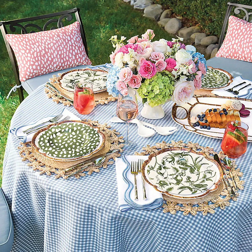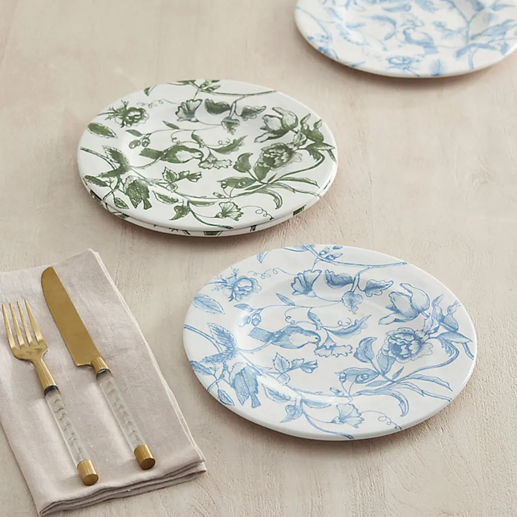 The lovely floral and bird motif was created from an original watercolor design by our gifted artist. Our Fiora Toile Accent Plates are made of heavy-weight, shatterproof melamine, and are ideal for serving snacks, salads, and dessert on the patio, porch, or poolside. These decorative accent plates layer effortlessly with classic white table decor, indoors and out. Fiora Toile Melamine Accent Plate features: