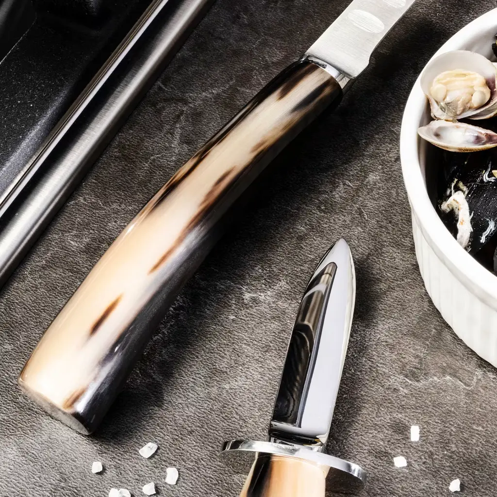 Elevate seafood dining experiences with the Fish and Shellfish Cutlery Set. This exquisite collection features three meticulously crafted utensils: a salmon knife measuring 420 mm, lobster pliers at 220 mm, and an oyster opener at 155 mm. Each piece combines durable stainless steel with elegantly designed natural horn handles, offering both functionality and aesthetic appeal. Ideal for entertaining or enhancing everyday meals, this cutlery set is an essential addition to any sophisticated tabletop setting. Part of the Classic Collection.