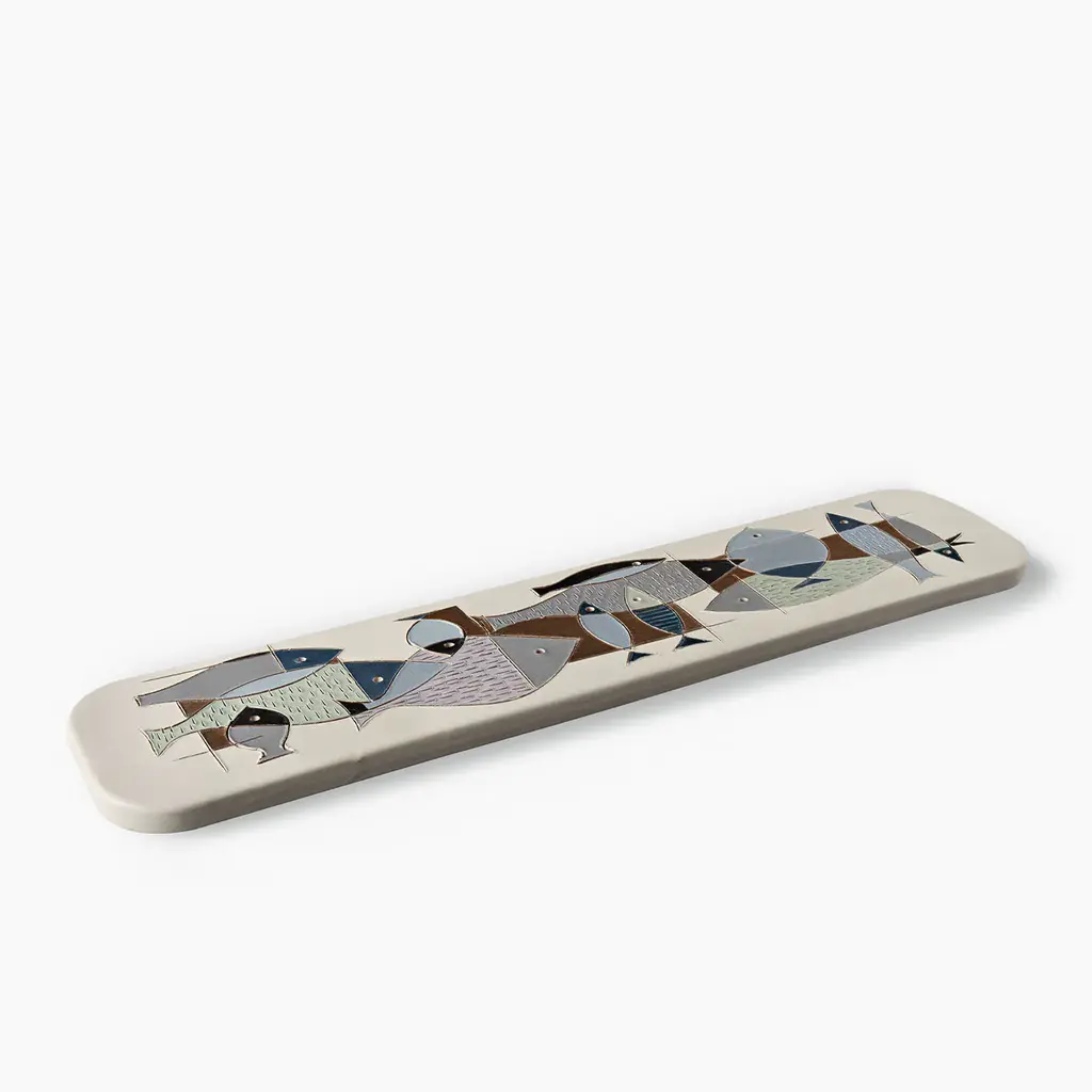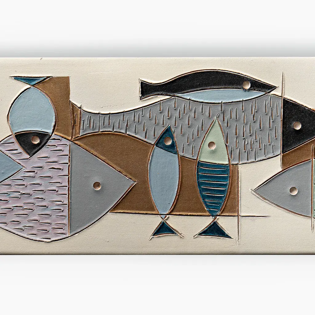 This striking decorative plate in white clay was designed by Aldo Londi in 1959 and is part of a limited edition of 199 pieces. The decorations on the top of the plate are a multitude of colorful fish crossing each other, creating a myriad of different texture combinations for a truly unique design.