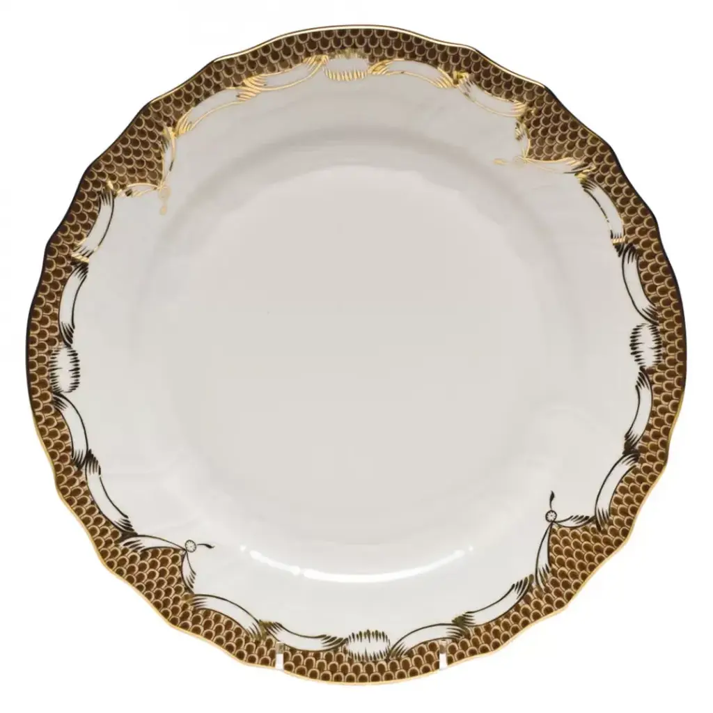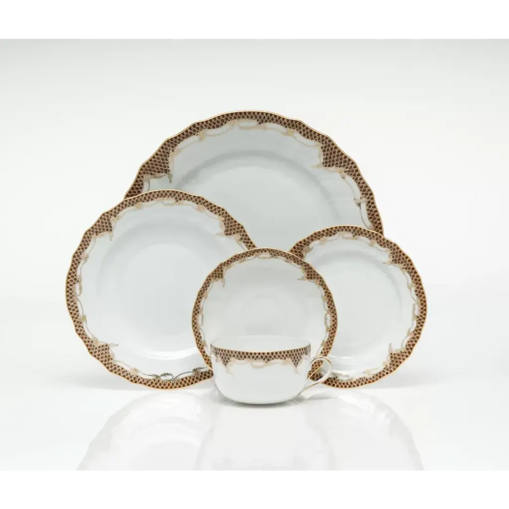 While it has often been used as a complement to Herend's patterns, this dramatic decorative border really comes into its own when it gets top billing. Fish scale is available in multiple shapes in 8 colors: raspberry, rust, brown, gold, two shades of blue and two shades of green. Hand painted in Hungary. Now the biggest porcelain manufactory in Europe, Herend was founded in 1826 to produce earthenware in the small Hungarian village for which it was named. At the time, Hungary was flooded with low-cost pottery, but in 1839, Mor Fischer became the Manufactory’s new owner and he decided to focus on producing dinnerware replacement pieces for Europe’s royal families to complement their valuable porcelain patterns from Germany and the Far East. As his client base grew, Fischer commissioned his artists to begin designing dinnerware patterns of their own. Queen Victoria’s 1851 purchase of a large set for Windsor Castle was a milestone, setting the stage for aristocrats throughout Europe to clamor for Herend in their estates. In the 1850s, Herend added meticulously-crafted figurines to its creations. Herend’s trademark fishnet pattern, which is widely recognized and prized as Herend’s signature design, started in 1858 when an artist who was intrigued with a Chinese plate’s fish scale design painted it onto a rooster figurine to imitate feathers.