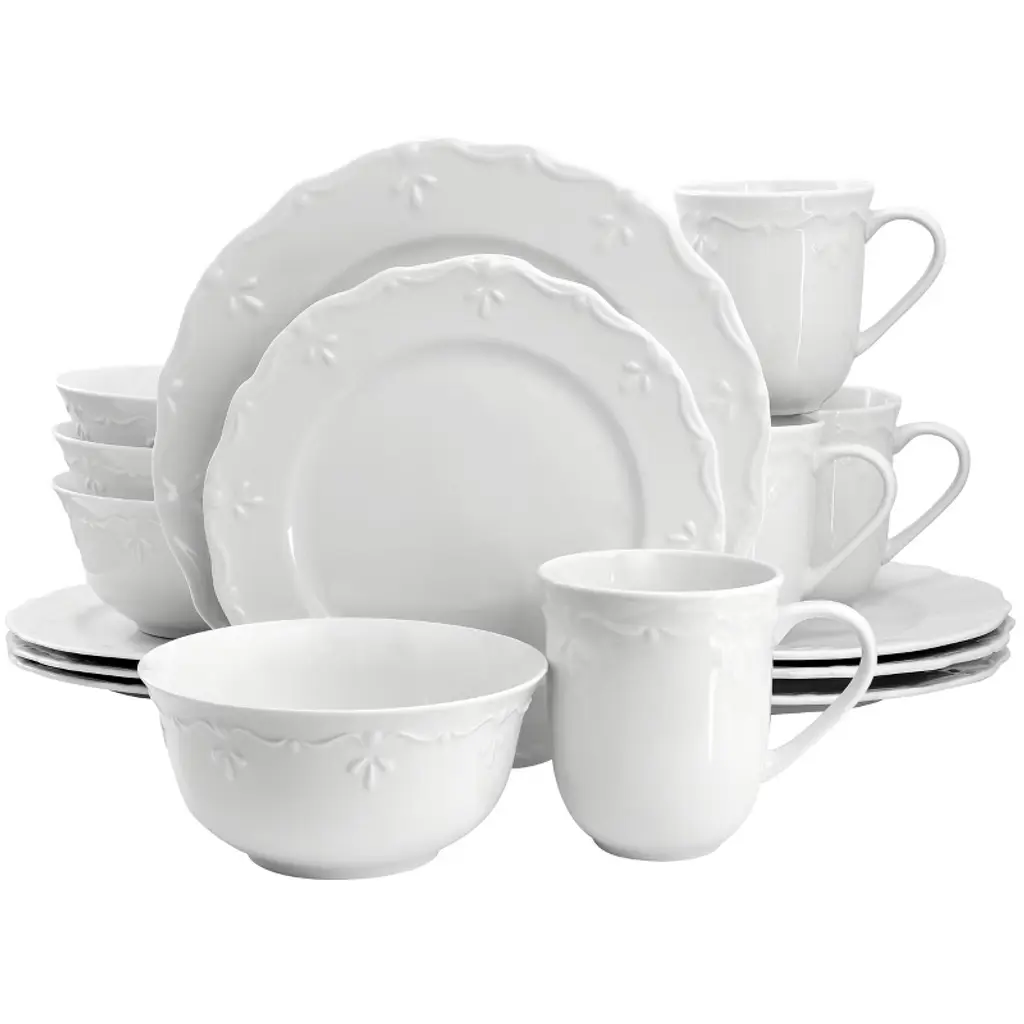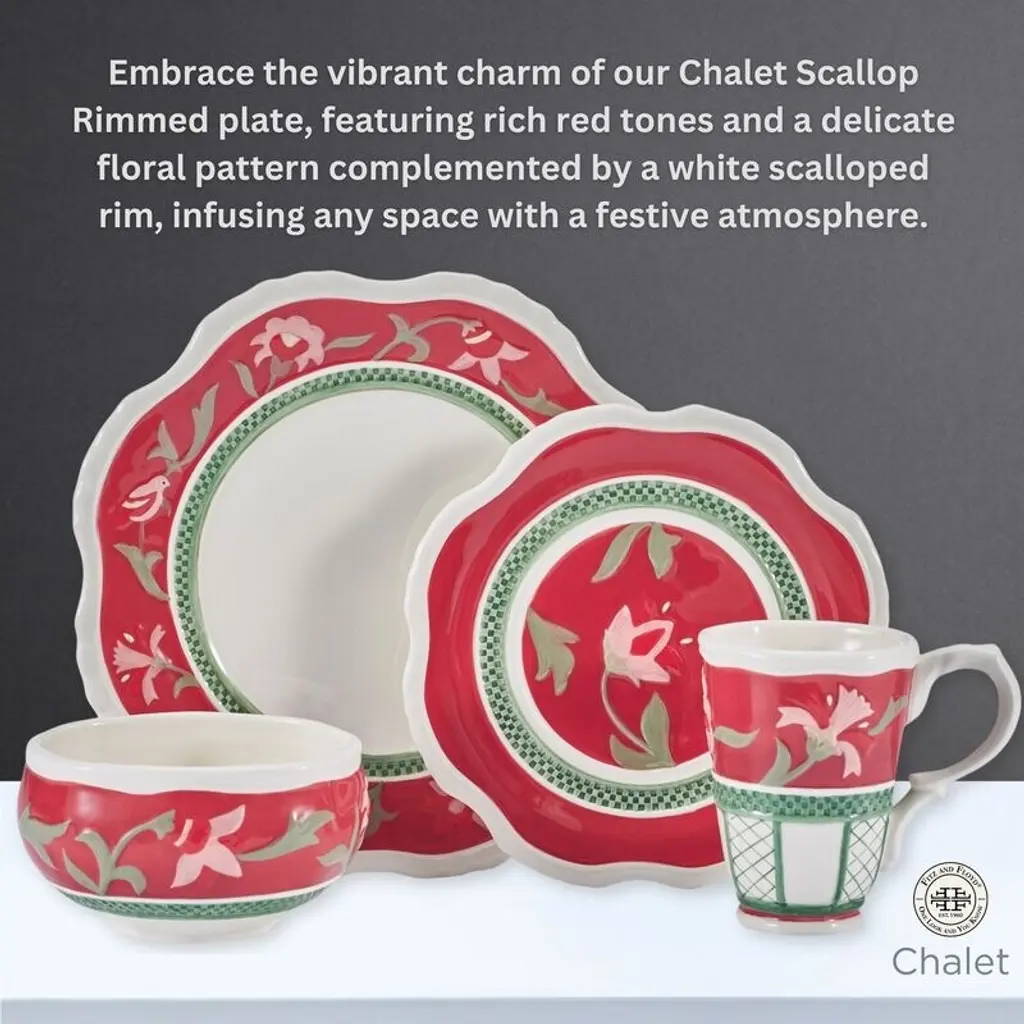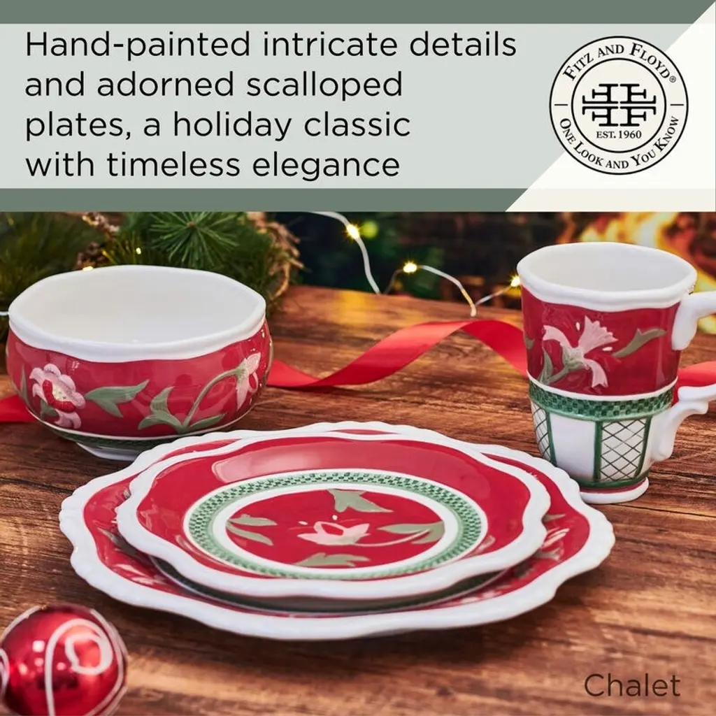 Add a festive, celebratory feel to any occasion, including the holidays, with this Chalet 16-Piece Dinnerware Set by Fitz and Floyd. Crafted of earthenware, this bold and colorful collection is adorned with an abstract floral pattern in a vivid palette of pink, red, green, maroon, and white. The contemporary designs are a unique contrast to the classic look of the scalloped edges. 16-piece set, service for 4, includes 4 each of: 10-3/4 inch diameter by 1-1/8 inch high dinner plate, 8-1/2 inch diameter by 7/8 inches high salad plate, 24-fluid ounce soup/cereal bowl measuring 3 inches tall and 5 inches in diameter, and 14-fluid ounce mug measuring 5-3/4 inches long by 4-3/4 inches wide by 3-1/2 inches deep. Hand-washing recommended to prolong the life of the product.