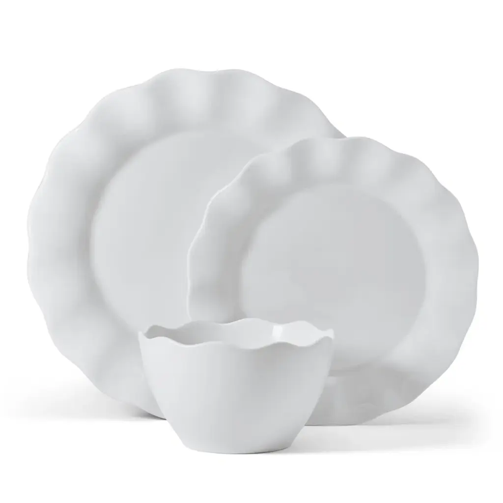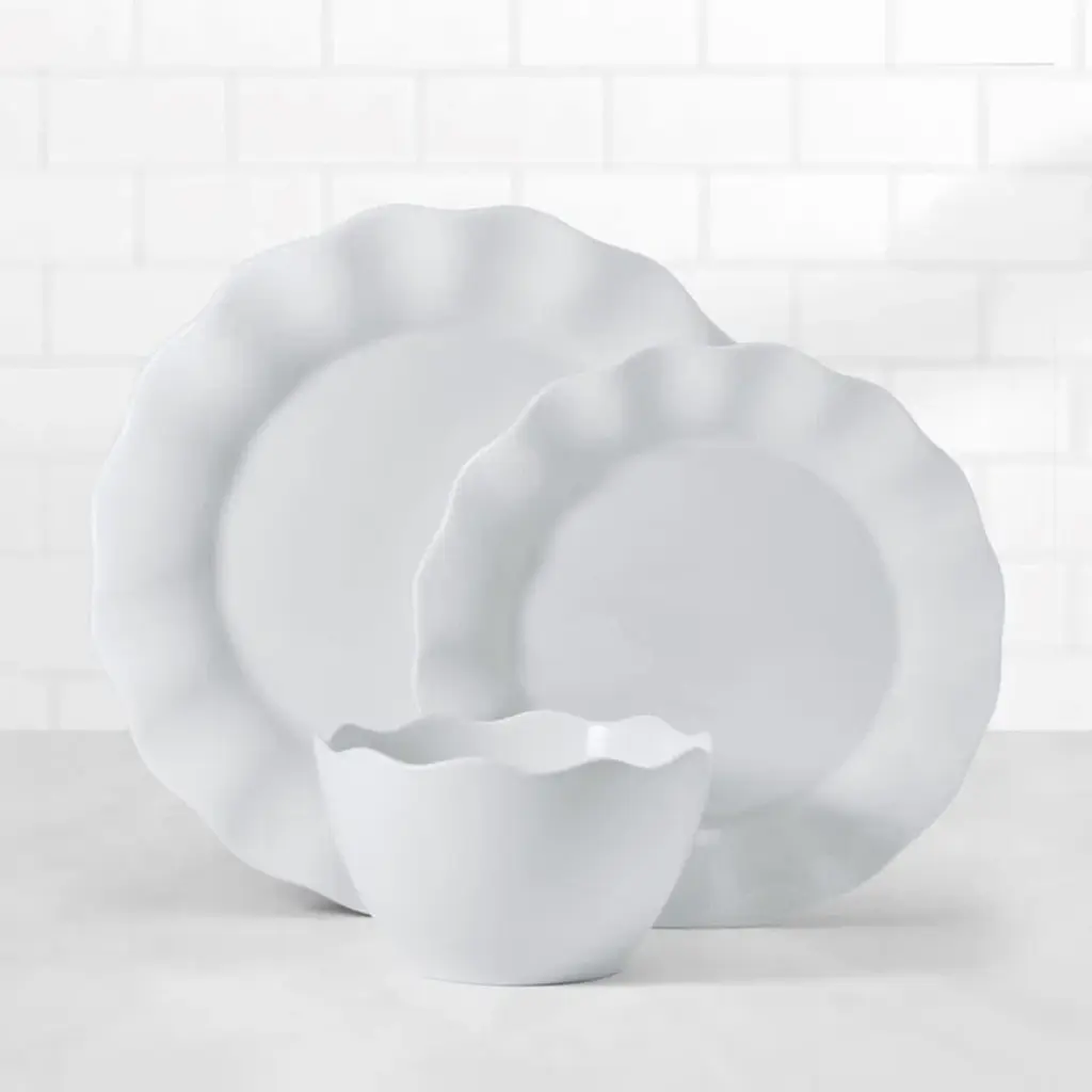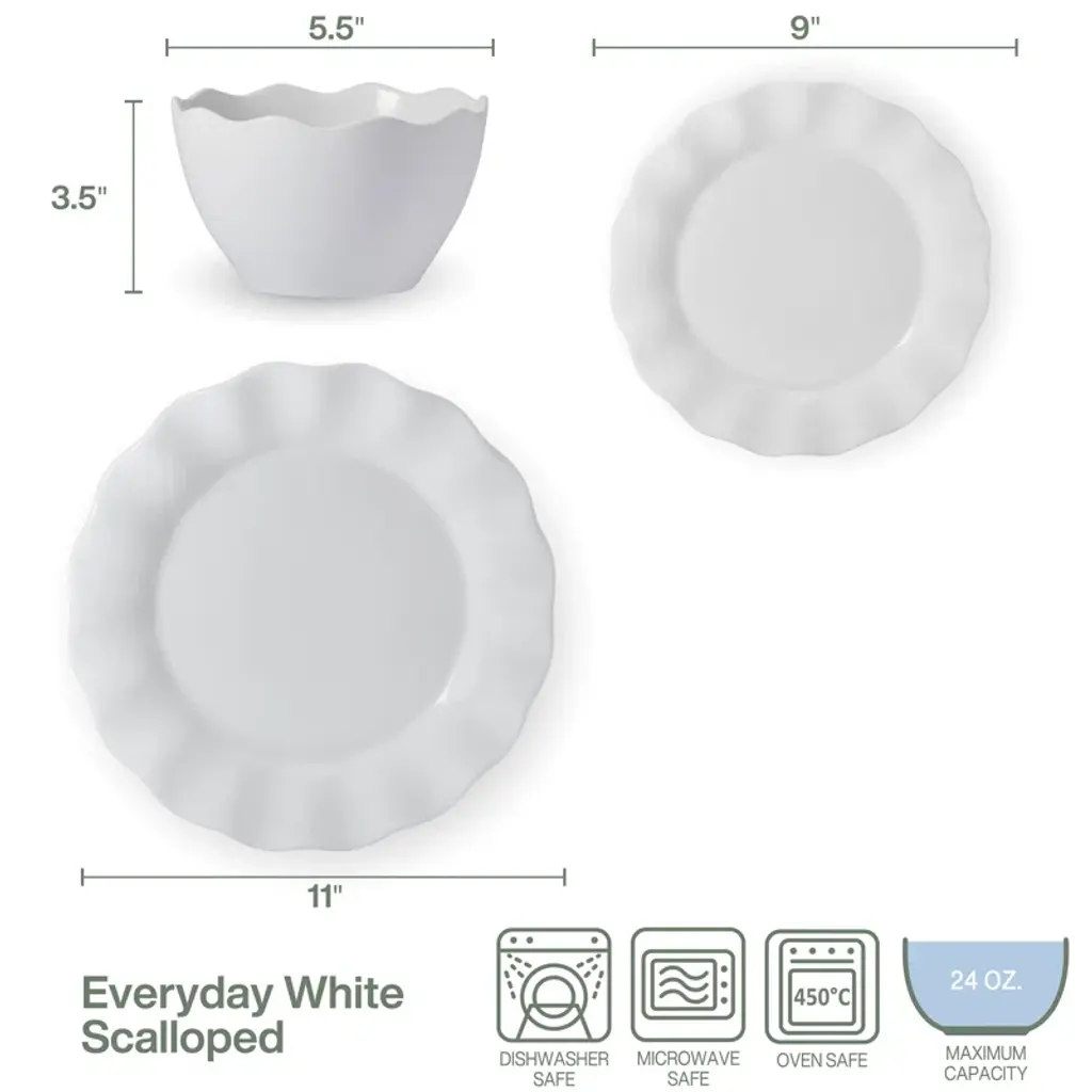 This Everyday White 12-Piece Dinnerware Set by Fitz and Floyd captivates, combining classic scalloped rims with modern curves that add depth and movement to your dining table. Beautifully crafted of crisp white porcelain, this collection elevates the presentation of your everyday place settings and adds a touch of simple sophistication to formal tabletop displays. 12-piece set, service for 4, includes 4 each of: 11-inch diameter by 1-1/4 high dinner plate, 9-inch diameter by 11-inch high salad plate, and 3-1/2 inch high by 5-1/2 inch diameter soup/cereal bowl with a 24-fluid-ounce capacity Microwave, oven, and dishwasher safe.
