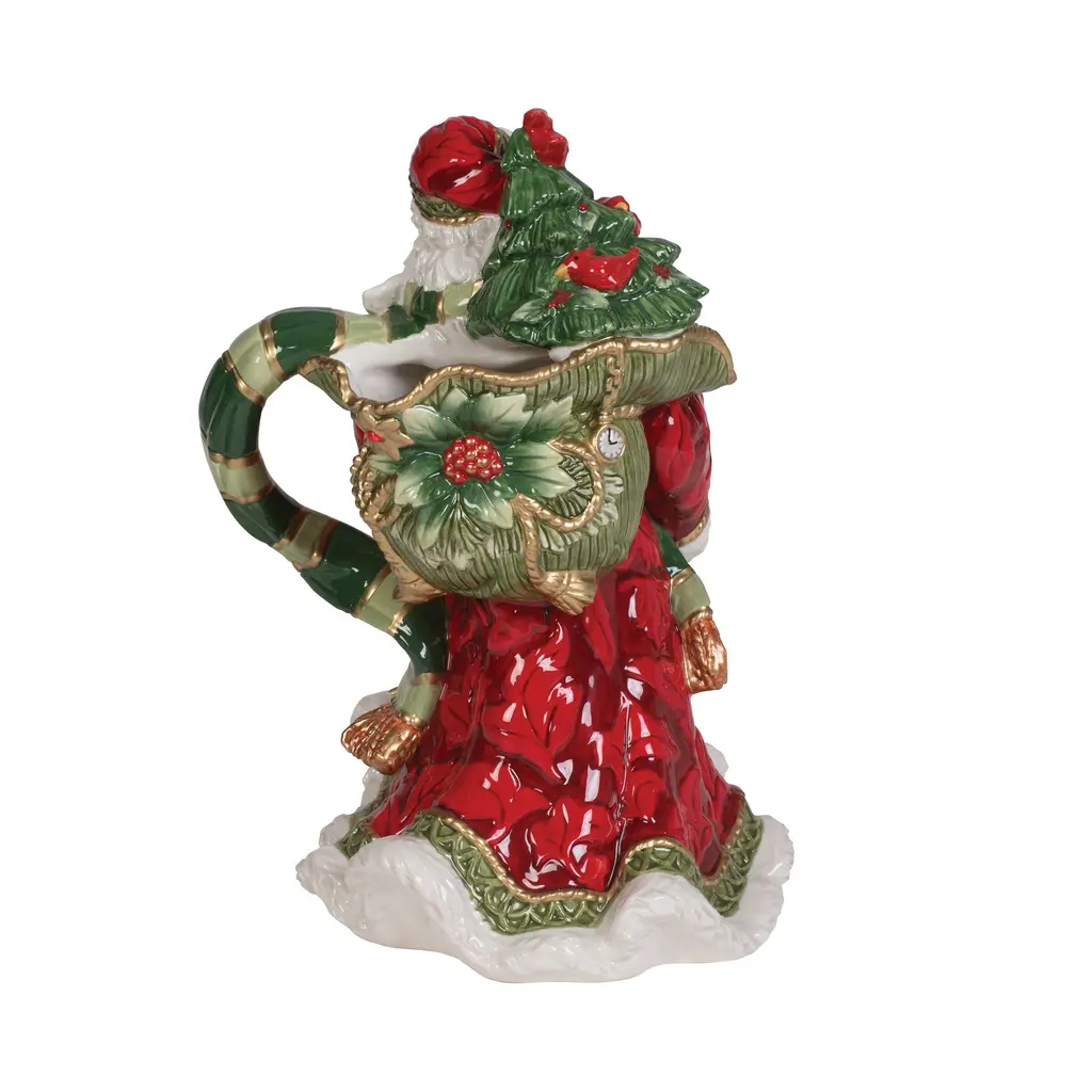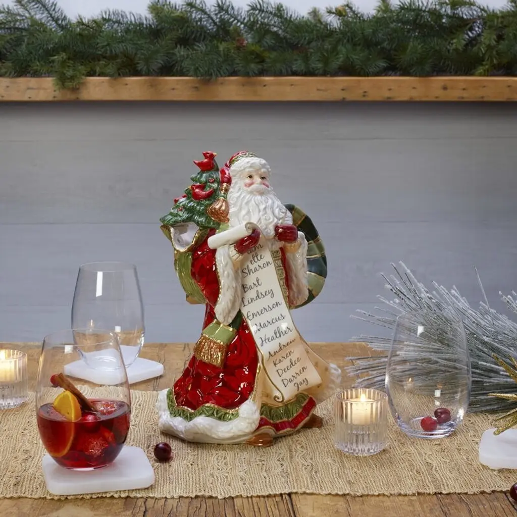 A stunning addition to your annual Christmas festivities this Fitz and Floyd Holiday Home Santa Pitcher is a delightful way to serve beverages during the holidays. Beautifully hand-painted with attention to detail, this lovely earthenware pitcher features Santa Claus all ready to deliver his bag of toys, yet taking a moment to check his list twice. It's perfect for serving cider, egg nog, and other beverages, not to mention for leaving milk with Santa's cookies! Measures 11-3/4 inches tall by 8-1/2 inches long by 7-1/2 inches wide with a 48-fluid ounce capacity. Hand-wash only.