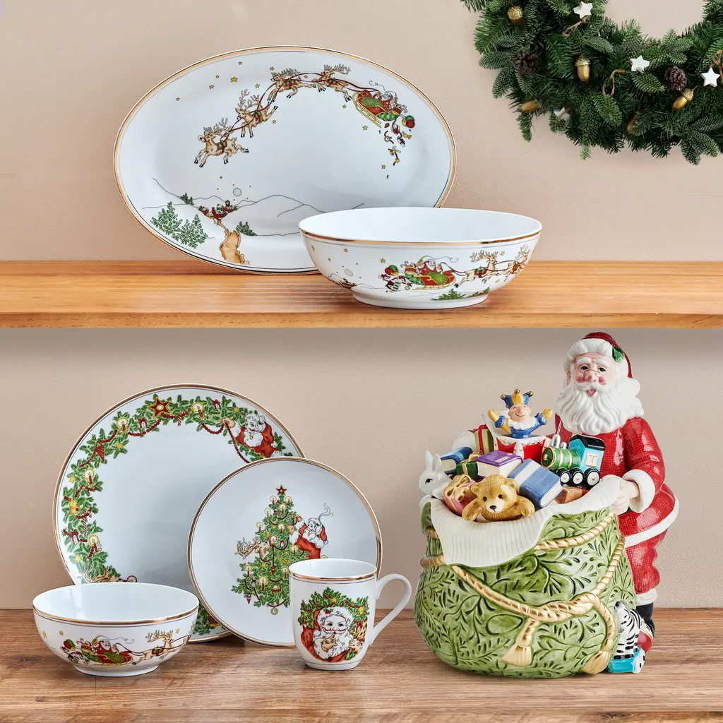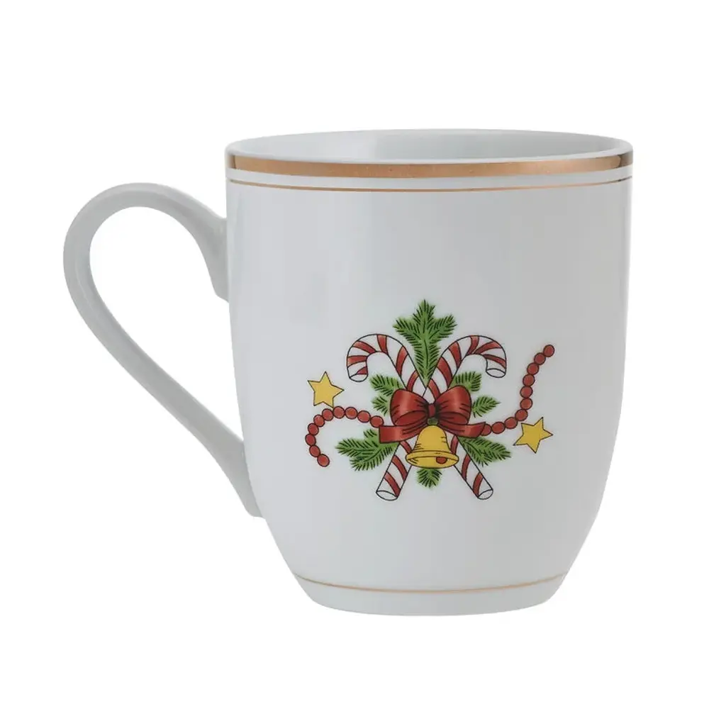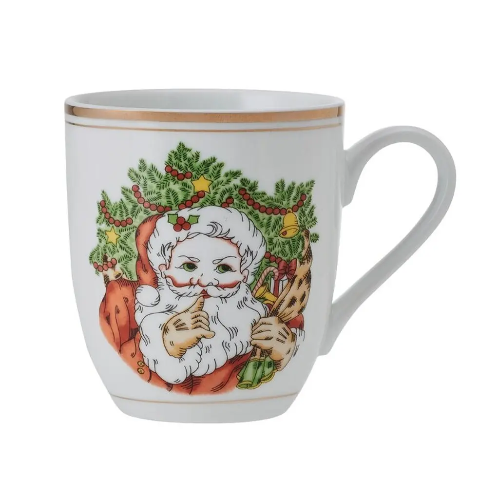 Perfect for serving coffee, tea, hot chocolate and other hot beverages for both large gatherings and everyday dinners with this St. Nicholas Mug Set of 4 by Fitz and Floyd. Featuring scenes of Santa painted in vibrant green and red with lustrous gold accents, the St. Nicholas collection brings the holiday spirit to your kitchen. This stylish set of 4 mugs are beautifully crafted of porcelain and packed in a protective brown corrugated cardboard box. Each mug measures 4-3/4 inches long by 3-3/8 inch diameter by 3-3/4 inches high mug with a 12 fl oz capacity. Hand wash only