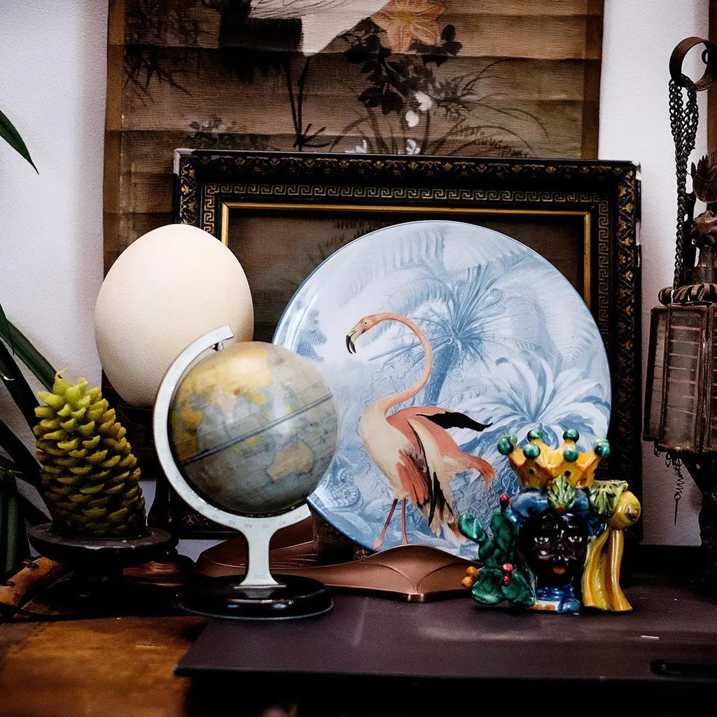This exquisite porcelain plate will be a stunning addition to a dining table or buffet table to serve appetizers during parties. This piece is defined by a dynamic rendition of a flamingo, its colorful pink plumage and assertive stance standing out against the verdant background of palm trees in a complementary blue hue. A stunning decorative object when not in use, this plate can be displayed on a shelf or in a china cabinet.