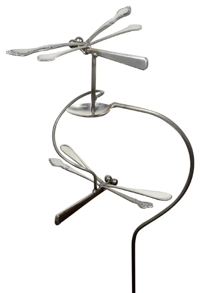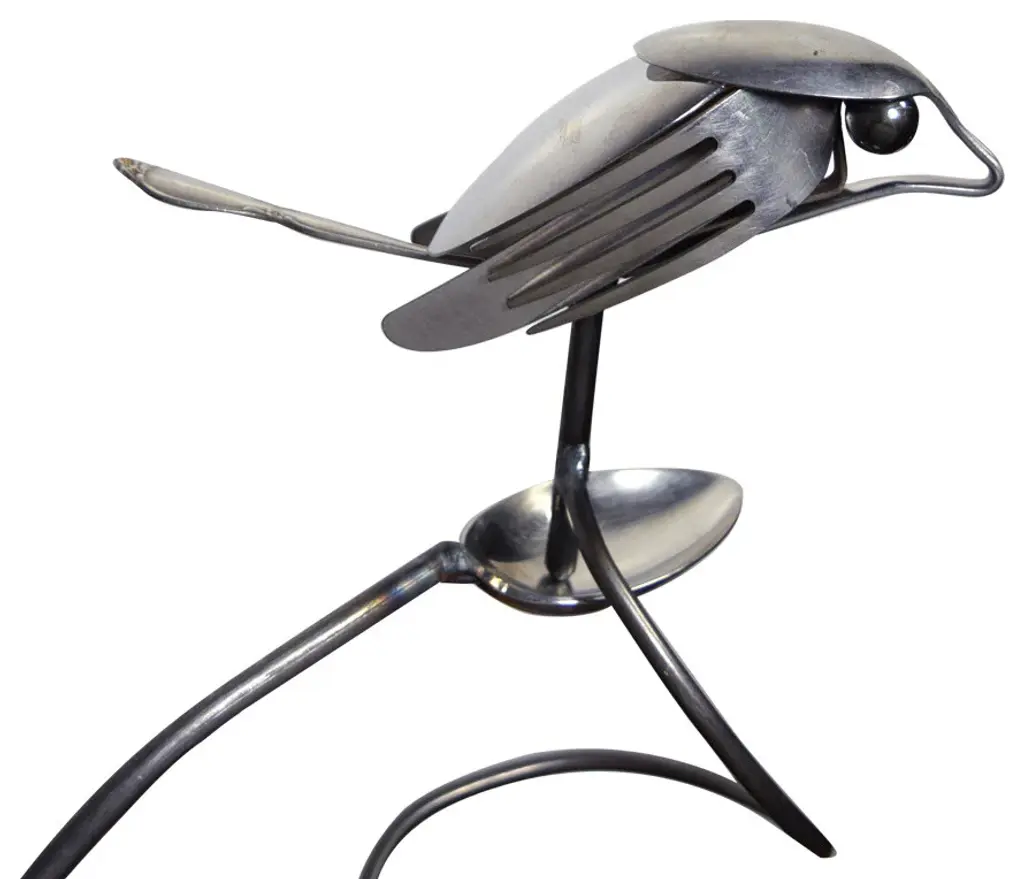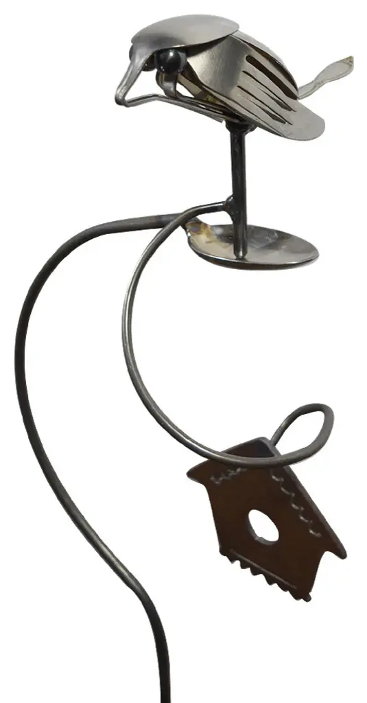 A fusion of industrial intelligence with artistic vision, vintage flatware finds a fabulous new home as an admirable addition to any outdoor area! Constructed by hand, forks, spoons, and knives take shape as a sweet little finch that gently rocks and sways in the wind. With the help of a spiral and sturdy counterweight in the shape of a birdhouse, the imaginative finch balances upon the inside of an outstretched spoon. Although the bird can be picked up, the inventive use of the spoon''s natural bowl shape prevents the finch from from falling off.Flatware finch includes a 35" steel stake that allows the balancing bird to peek above garden plants. Made by hand in the USA. Note: The stake, spiral and counterweight are crafted from raw steel. Once exposed to the outdoors, these elements will rust to create further contrast with the stainless steel flatware bird. Vintage flatware styles will vary slightly.