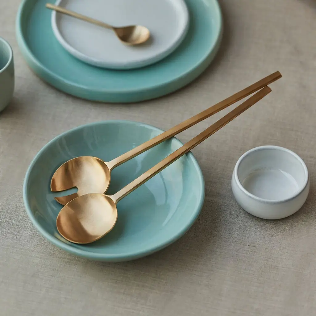 Brass salad servers gleam on the dinner table, whether they're serving a quick weeknight salad or an elegant festive side. Wife-and-husband duo, Shruti and Nishant, started Fleck in the spring of 2019 in pursuit of creating a dream ceramic mug—one in which Shruti could enjoy her chai, and Nishant his coffee. Embracing this utilitarian approach to homewares, they launched an entire line of refined, artisanal goods that are at once beautiful and utterly usable. Think of a glazed, green bowl—evoking the first leaves of spring—for cereal, noodles or soup. Raw brass serving utensils that are just imperfect enough. And a natural-toned pasta plate that looks and feels the opposite of polished—like the sand under your feet, while walking on the beach. Shruti and Nishant work with more than 360 artisans in India, producing a growing range of ready-to-ship and made-to-order homewares, each adhering to Fleck’s commitment to the marriage of function and beauty.