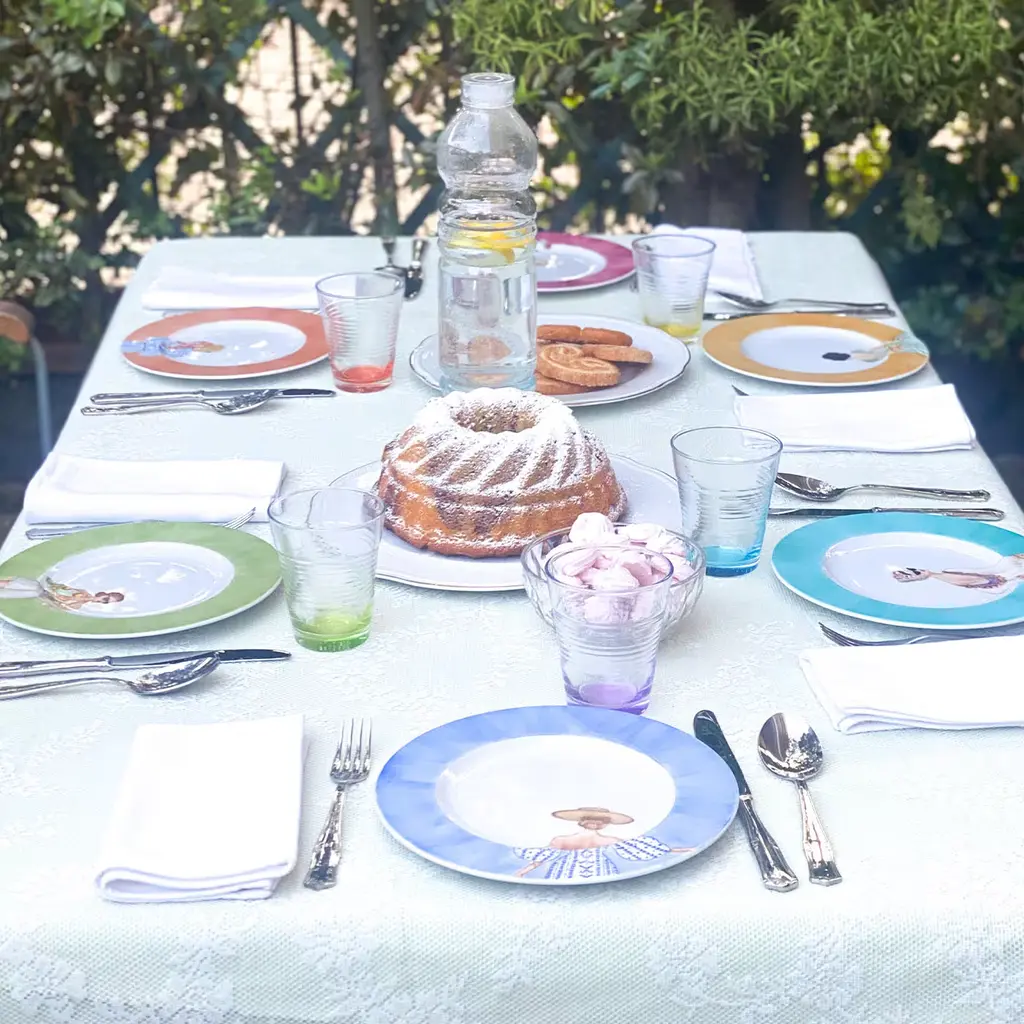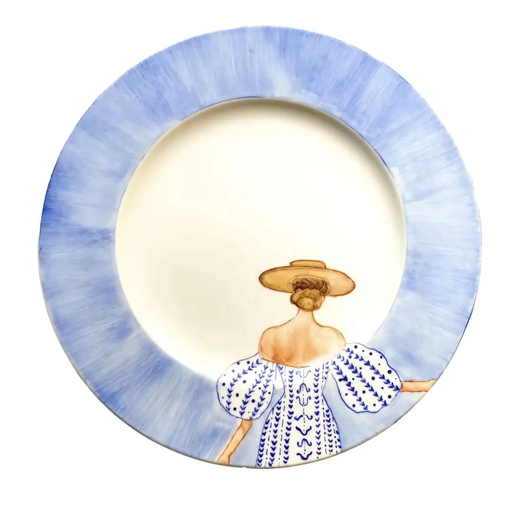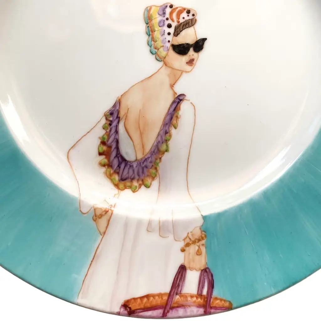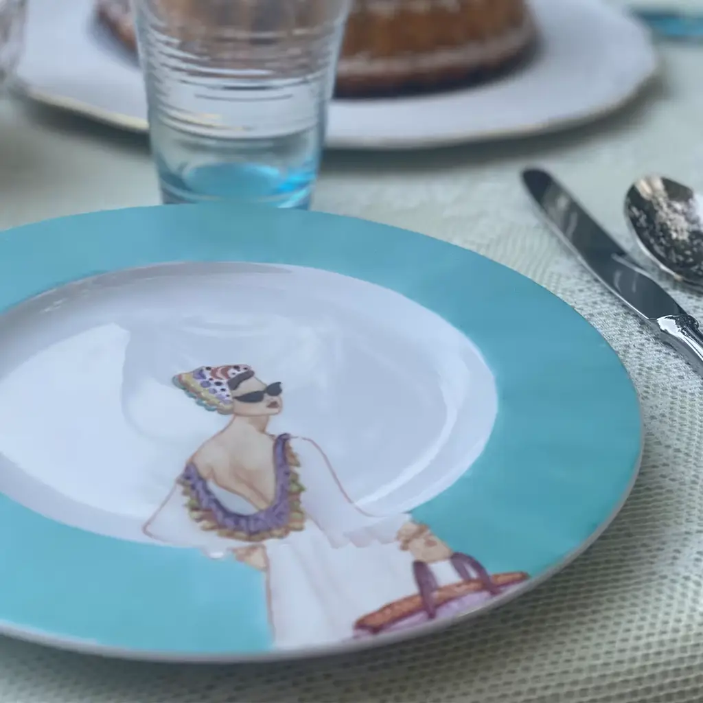 The soft blue rim of this porcelain plate is complemented by a hand-painted figure of a chic woman, dressed in a breezy summer gown and oversized sunglasses. Her casual grace is a nod to the timeless allure of mid-century Ischia. Fashioned from the finest Italian porcelain, this plate is not only a visual delight but also designed for easy care, remaining vibrant and flawless after numerous trips through the dishwasher.