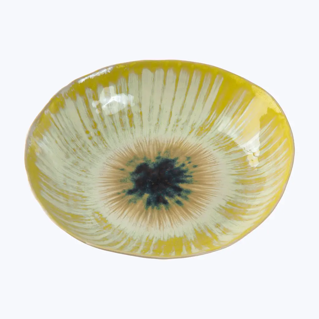 The Flora Serving Bowl is a stunning ceramic plate with a unique glaze pattern. It features a vibrant design resembling an abstract eye or colorful whirlpool. The deep blue center is surrounded by a ring of yellow that transitions into green hues that radiate towards the edges. The dynamic and organic effect is enhanced by a glossy finish. This 9" bowl from Thailand is made of high-quality ceramic that's lead and cadmium free. Experience the beauty and quality of this exquisite dinnerware.