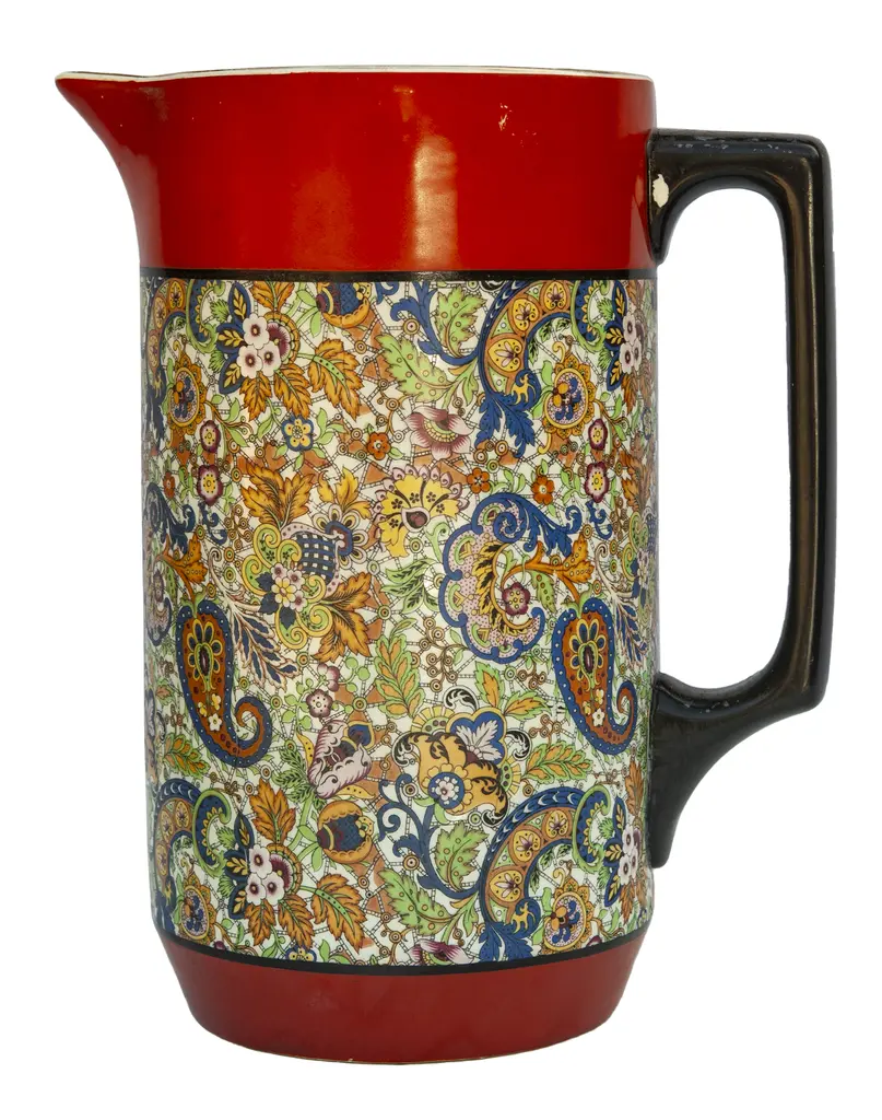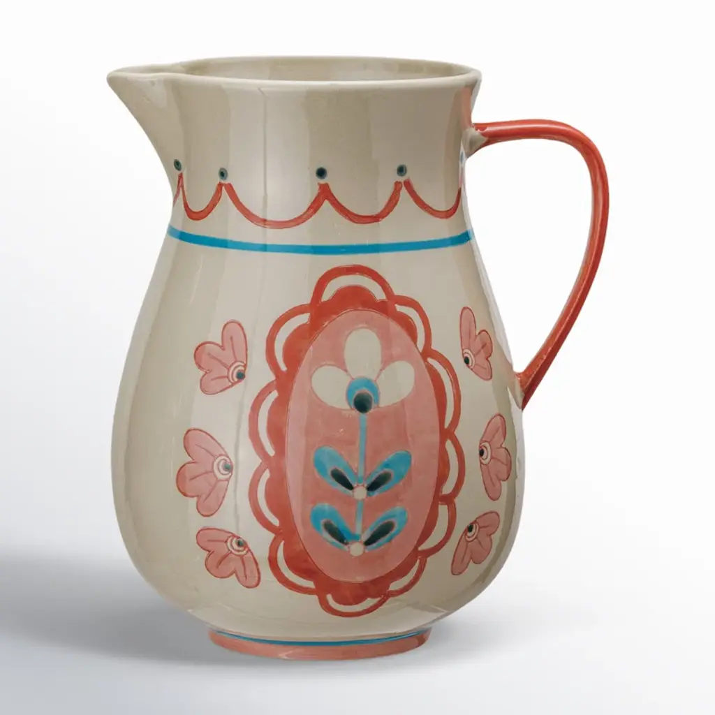 This Stoneware Pitcher is a celebration of craftsmanship and design, featuring a lovely floral pattern that wraps around its surface and a vibrant red handle for a pop of color. The spout is expertly crafted for smooth pouring, while the wide opening allows for easy filling and cleaning. With dimensions of 8.5 inches in length and 9.5 inches in height, it's an ideal vessel for serving various beverages or showcasing fresh flowers. Its multi-hued palette and timeless design make it a versatile piece that complements a variety of decor styles, from the simplicity of Scandinavian to the warmth of Boho to the rustic elegance of French country. This pitcher is not only functional but also adds a touch of elegance to any table setting or room.