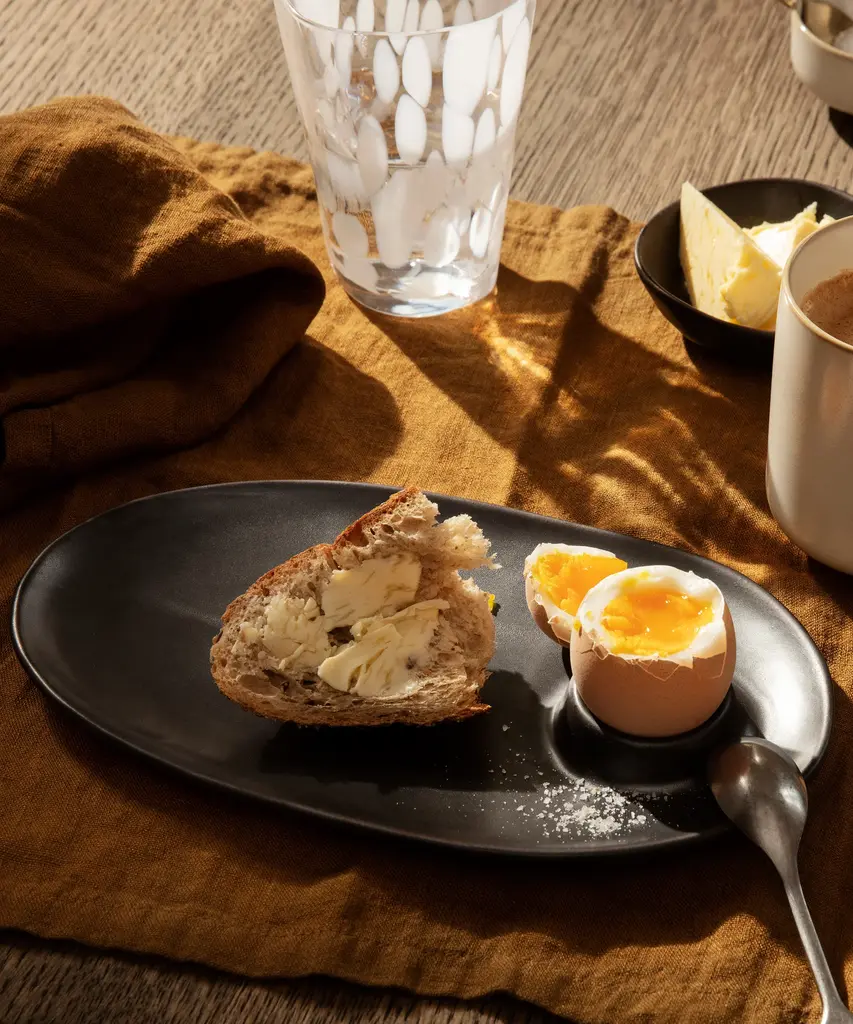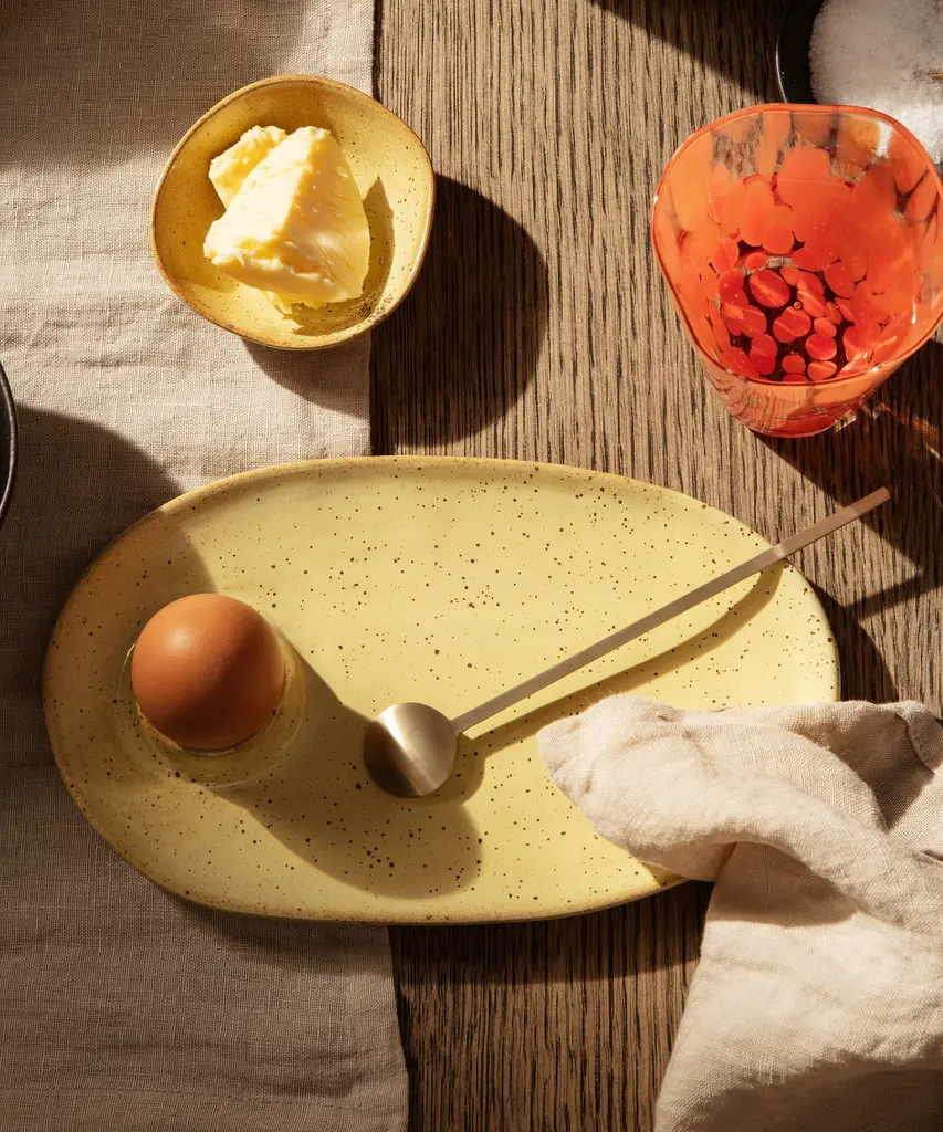 Flow is a series of perfectly imperfect tableware made to modern sensibilities using traditional craftsmanship techniques. All the items are detailed with a semi-matte glaze for a unique expression. Featuring an integrated egg cup, this oval plate is the perfect addition to any breakfast table, with plenty of room for your morning toast as well. The egg cup is indented on the backside, so the plates can be easily stacked when not in use. Produced by the Copenhagen-based studio Ferm Living.