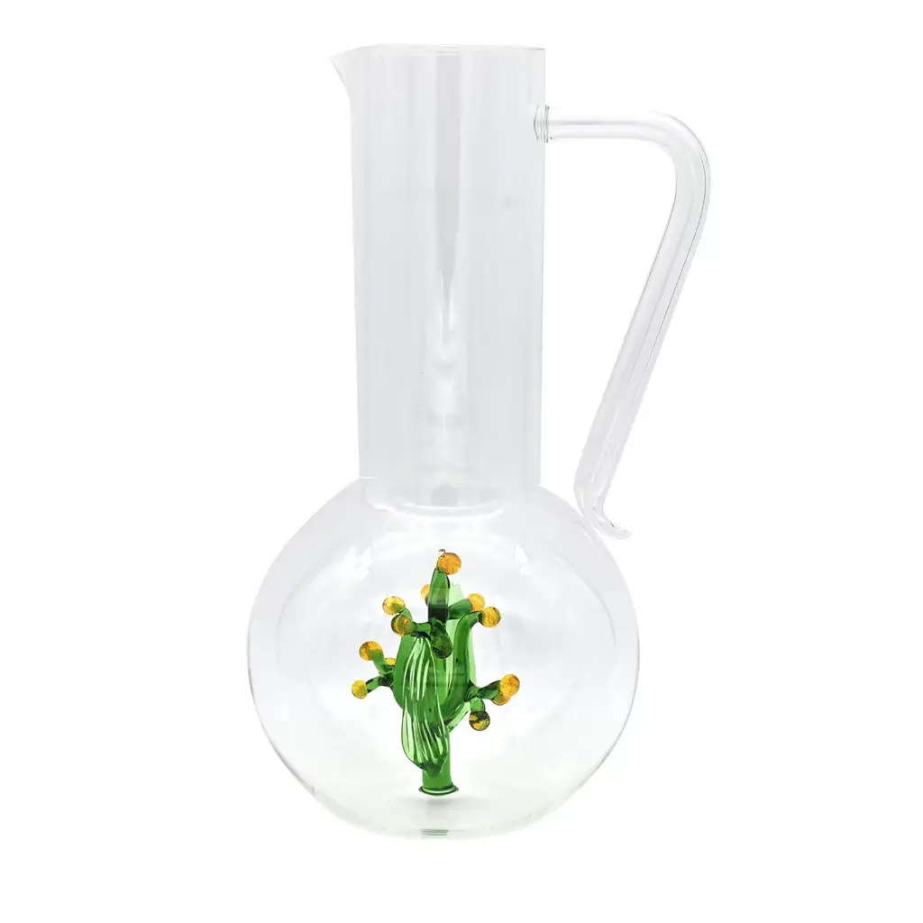 This set of six, highly original glasses and matching jug feature a variety of colored flowering, glass cactuses sprouting from their inner base. This whimsical style will add a creative, joyful touch to the dining table or while serving drinks in the garden during the hot season. Two skilled artisans are needed to produce each piece. Handcrafted in Venice.