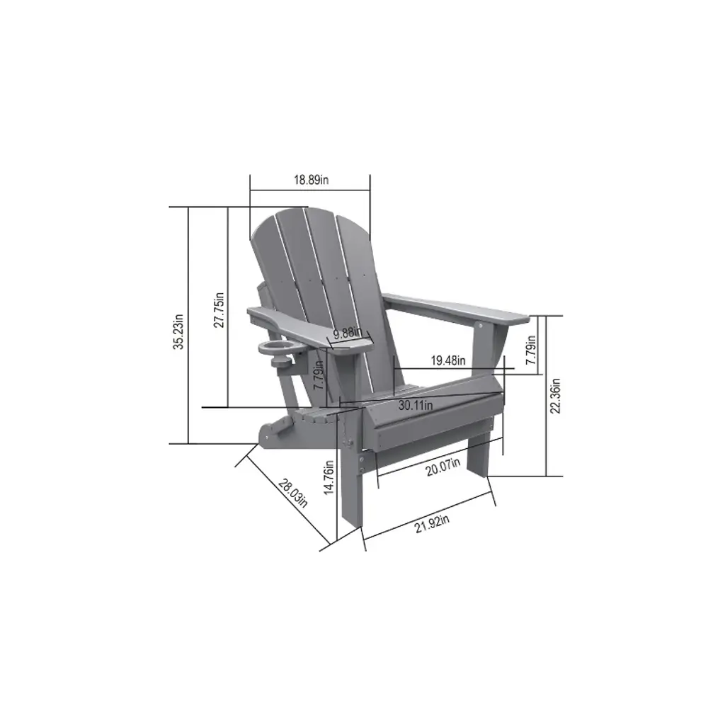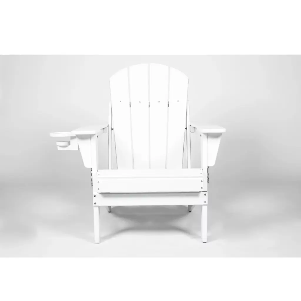 Experience the ultimate in outdoor relaxation with the Folding Adirondack Chair, a perfect blend of comfort, durability, and functionality. Designed with a large seat, tall backrest, and wide armrests, this chair provides a seating solution built for rest, relaxation, and rejuvenation. Whether you're enjoying a quiet moment alone or entertaining guests, this chair offers the perfect spot to unwind. Crafted from virgin high-density polyethylene (hard plastic), this chair is built to last. The textured grain finish not only adds to its aesthetic appeal but also ensures rainwater sheds easily, keeping the chair dry and comfortable. Designed to withstand harsh weather conditions, this chair resists denting, cracking, peeling, and rotting, making it suitable for all-season use. The integrated cup holder adds a convenient touch, allowing you to keep your beverages close at hand while you relax. This thoughtful feature enhances your outdoor experience, ensuring you have everything you need within reach. The folding design makes this Adirondack chair easy to store, freeing up space when not in use. Perfect for homes with limited storage areas, this chair offers both functionality and convenience. Whether you're storing it during the off-season or simply making room for other activities, the folding design ensures hassle-free storage. Assembly is quick and easy with this chair. Partial assembly is required, with only a few steps needed to tighten screws and splice parts according to the included manual. The hassle-free setup allows you to start enjoying your new chair in no time.