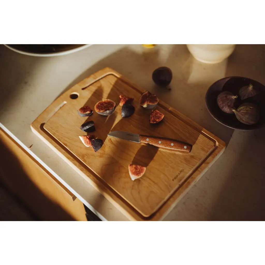Fiskars' Folken cook's knife is a versatile kitchen companion, featuring a 2.76 in (7 cm) blade that makes it ideal for chopping and slicing root vegetables as well as other firm fruits and vegetables. The blade is made from stainless steel and finished with the uncompromising quality Fiskars is known for. The maple wood handle sits comfortably in the hand while giving each Folken knife a unique, natural look. Fiskars' Folken kitchen collection is a tribute to traditional cooking and long-lasting materials. With its timeless design and durable structure, Folken kitchen tools are made to bring joy to cooking year after year – and from one generation to the next.