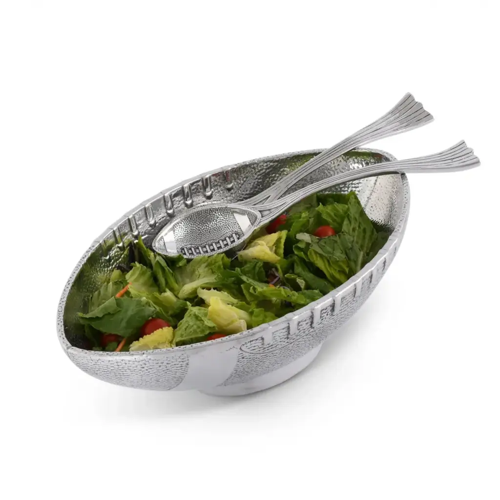 Prepare to be the host with the most with our durable football server bowl. Noted for its versatility, it doubles as an Arthur Court football design serving bowl for parties and a football-themed salad bowl adding a spirited touch to any gathering. Made with sturdy materials and detailed craftsmanship, this serving bowl withstands regular use while maintaining its immaculate look. The football design injects a fun element to your parties, making it a conversational piece while serving its purpose flawlessly. Its size and depth make it perfect for any salad or dish that you wish to serve. Enjoy a combination of durability, functionality, and style with our football server bowl.
