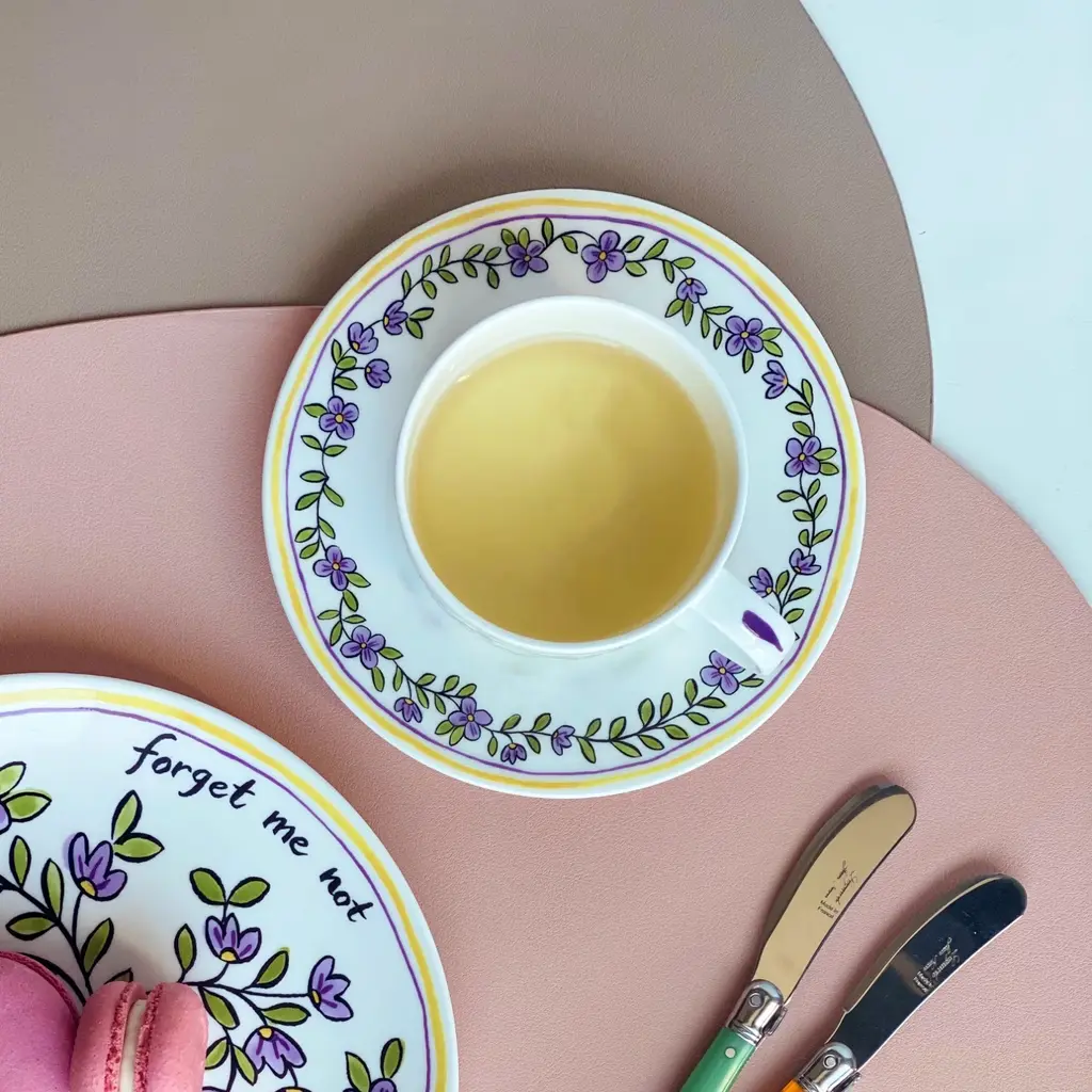 The Forget Me Not Collection by Twig New York in collaboration with Molly Hatch. Celebrating the love between two individuals, inspired by the Forget Me Not plant and represented on Fine White Bone China. The interesting use of borders and of mixing fully adorned and partially adorned pieces creates a collection that is both appealing and interesting. With a textured feel and designs on the bottom surfaces as well, the Forget Me Not Collection conveys a feeling of being valuable, just like the relationships in our lives.Ideal for Tea or CoffeeOne cup, one saucer per boxFine Bone China with hand applied decalCup: 3.5 in. x 2.25 in., Saucer: 6.25 in. diameterDishwasher & Microwave safeForget Me Not Collection