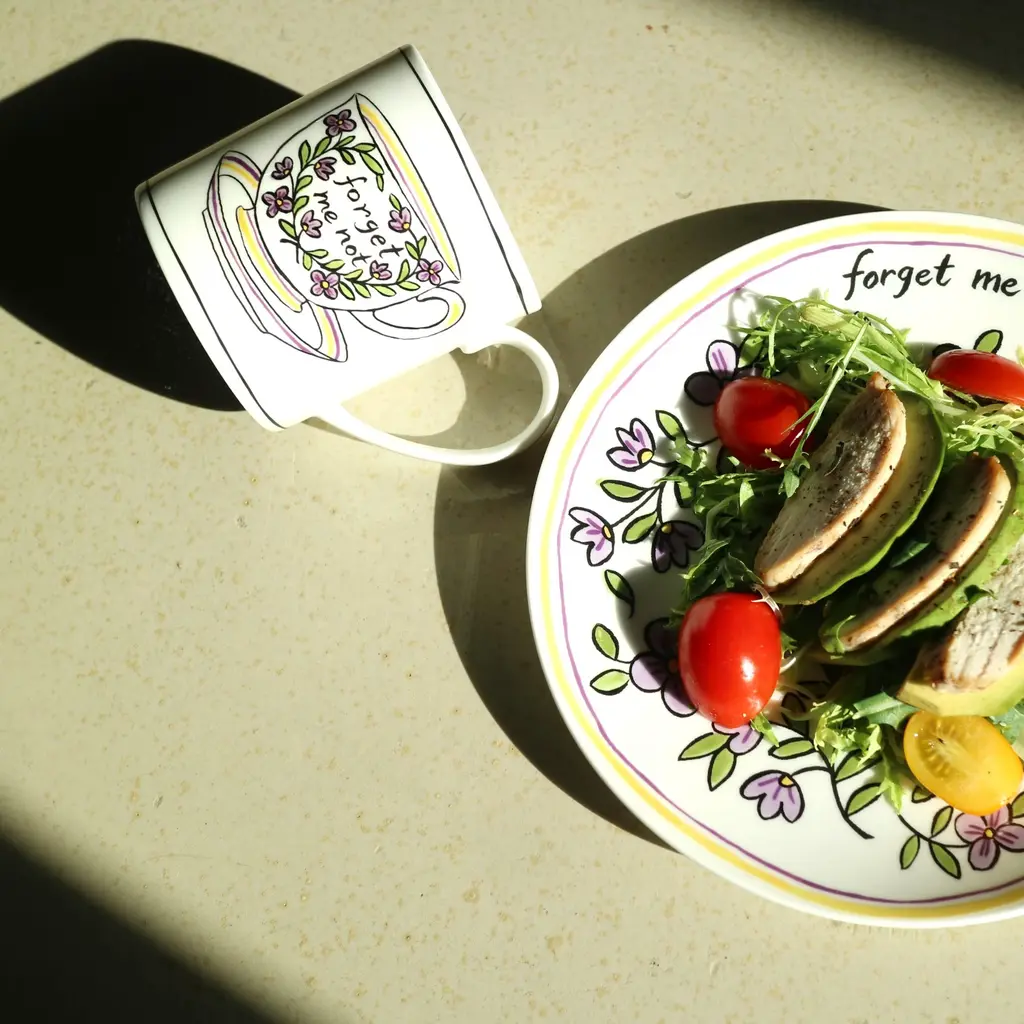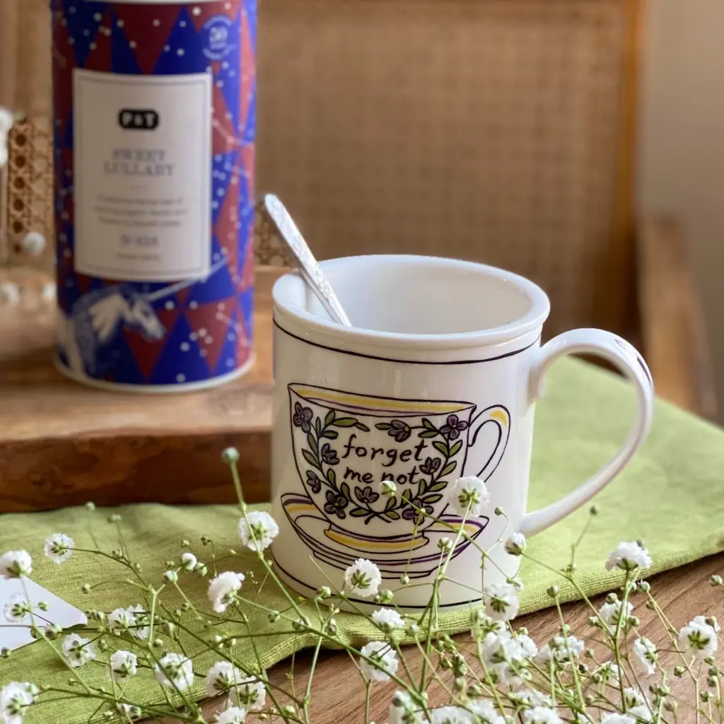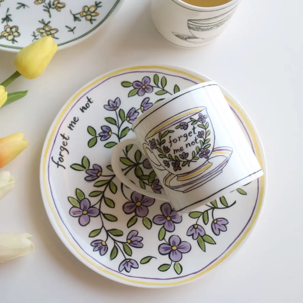 The Forget Me Not Collection by Twig New York in collaboration with Molly Hatch. Celebrating the love between two individuals, inspired by the Forget Me Not plant and represented on Fine White Bone China. The interesting use of borders and of mixing fully adorned and partially adorned pieces creates a collection that is both appealing and interesting. With a textured feel and designs on the bottom surfaces as well, the Forget Me Not Collection conveys a feeling of being valuable, just like the relationships in our lives.Ideal for coffee and tea / beveragesOne mug per boxFine Bone China with hand applied decalForget Me Not Collection