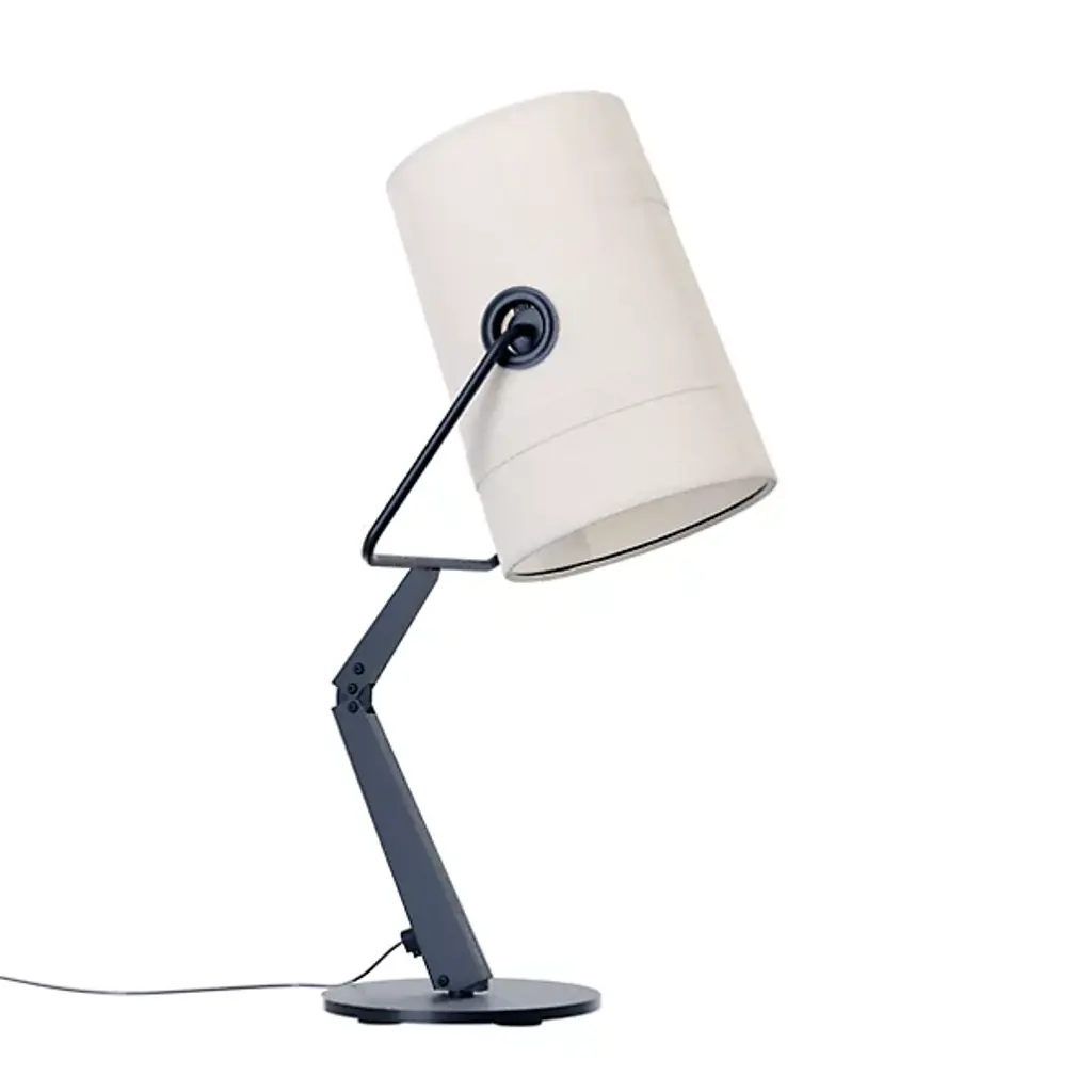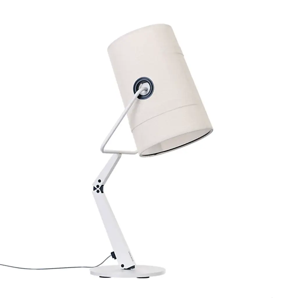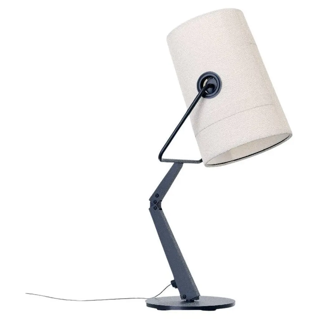 Illuminate a workspace with the elevated design of the Fork Desk Lamp by Diesel Living with LODES. A rounded metal base steadies its slender, jointed body as it rises to a cylindrical linen-cotton diffuser with visible stitching accents. When illuminated, its sewn seams are visible, much like a camping tent when lit from within. It easily adjusts 360 degrees via gunmetal-colored eyelets that bring a mechanical contrast to its soft fabric shade.