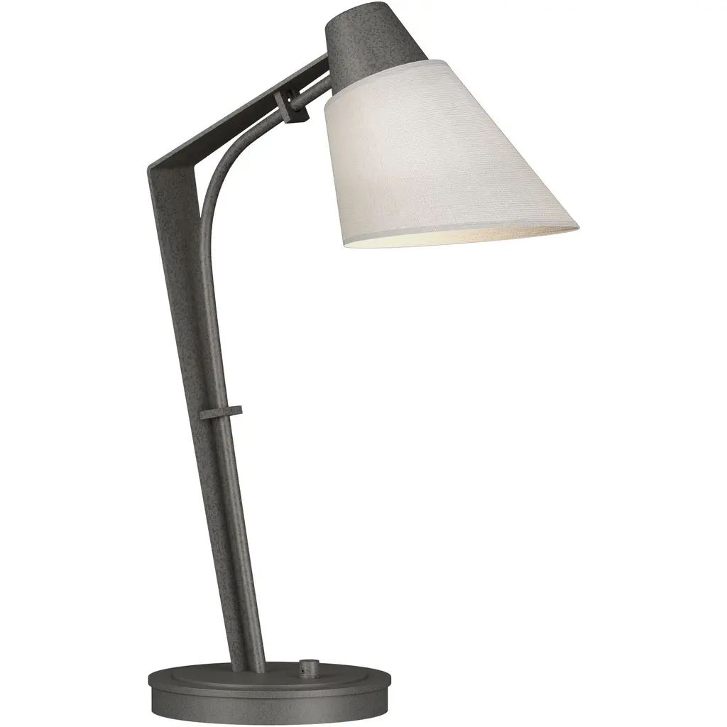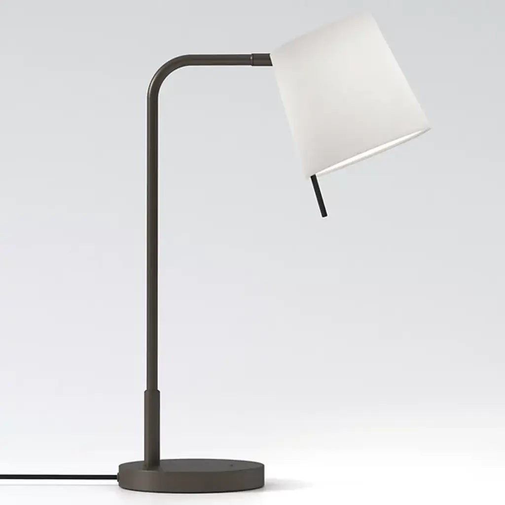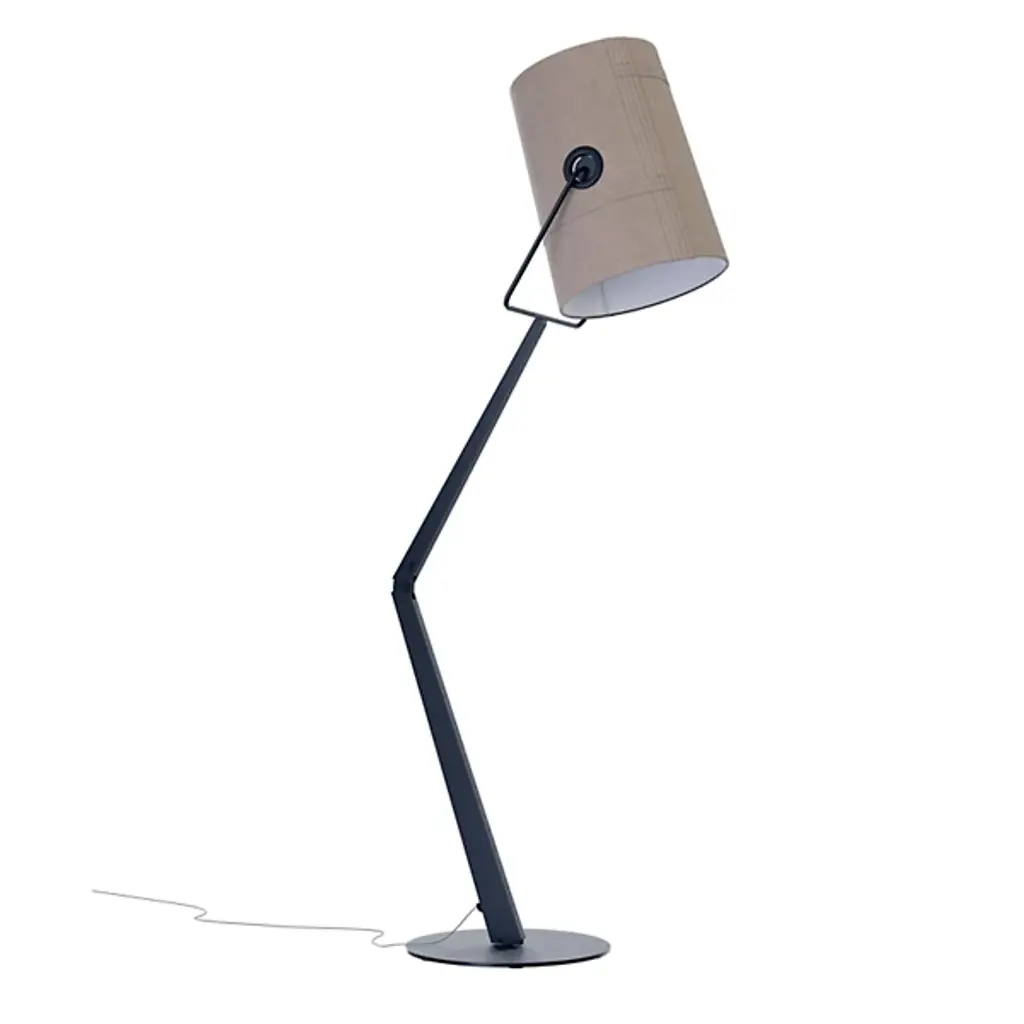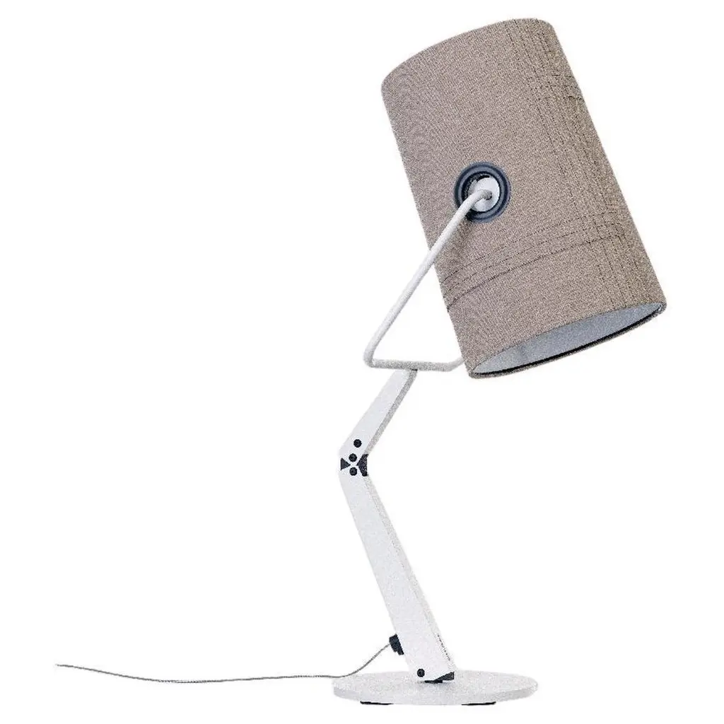 Illuminate a workspace with the elevated design of the Fork Desk Lamp by Diesel Living with LODES. A rounded metal base steadies its slender, jointed body as it rises to a cylindrical linen-cotton diffuser with visible stitching accents. When illuminated, its sewn seams are visible, much like a camping tent when lit from within. It easily adjusts 360 degrees via gunmetal-colored eyelets that bring a mechanical contrast to its soft fabric shade.
