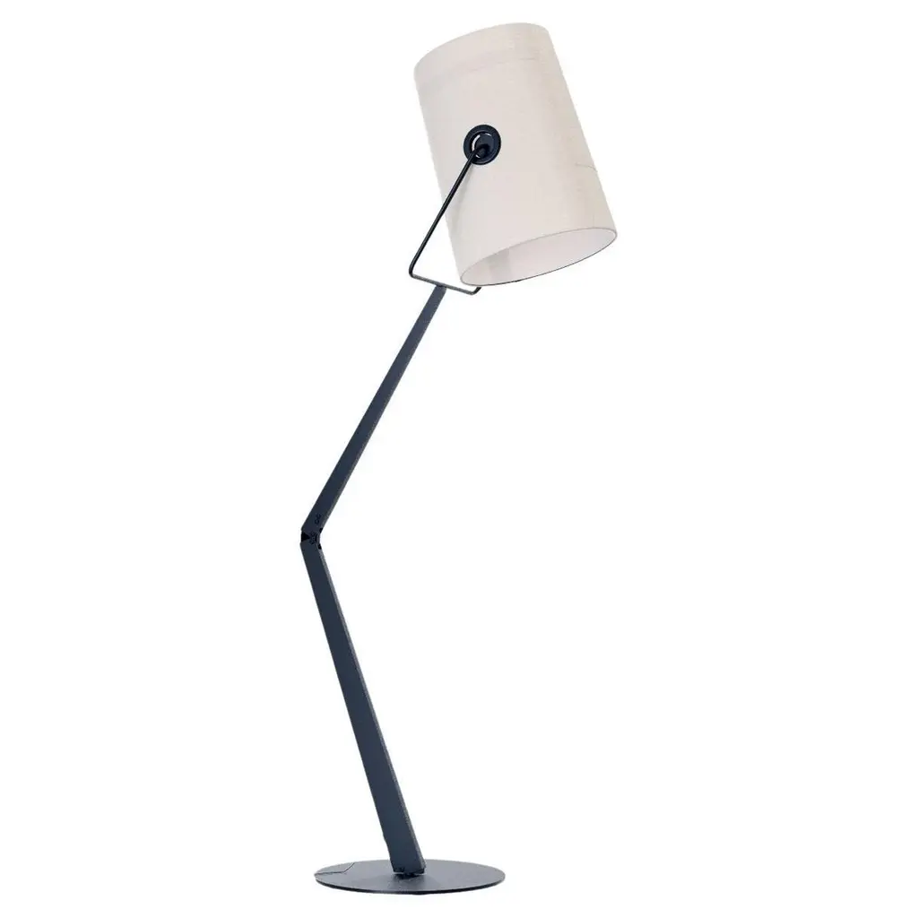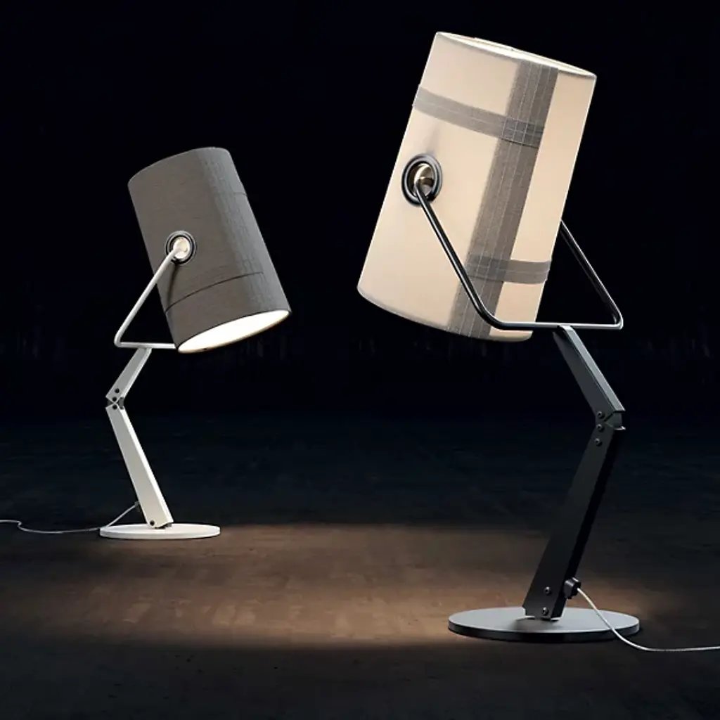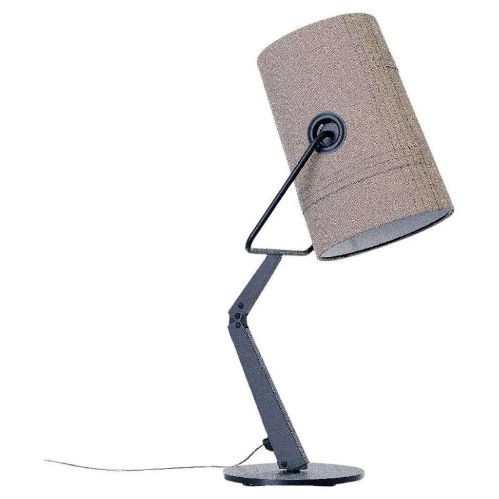 Illuminate a workspace with the elevated design of the Fork Desk Lamp by Diesel Living with LODES. A rounded metal base steadies its slender, jointed body as it rises to a cylindrical linen-cotton diffuser with visible stitching accents. When illuminated, its sewn seams are visible, much like a camping tent when lit from within. It easily adjusts 360 degrees via gunmetal-colored eyelets that bring a mechanical contrast to its soft fabric shade.