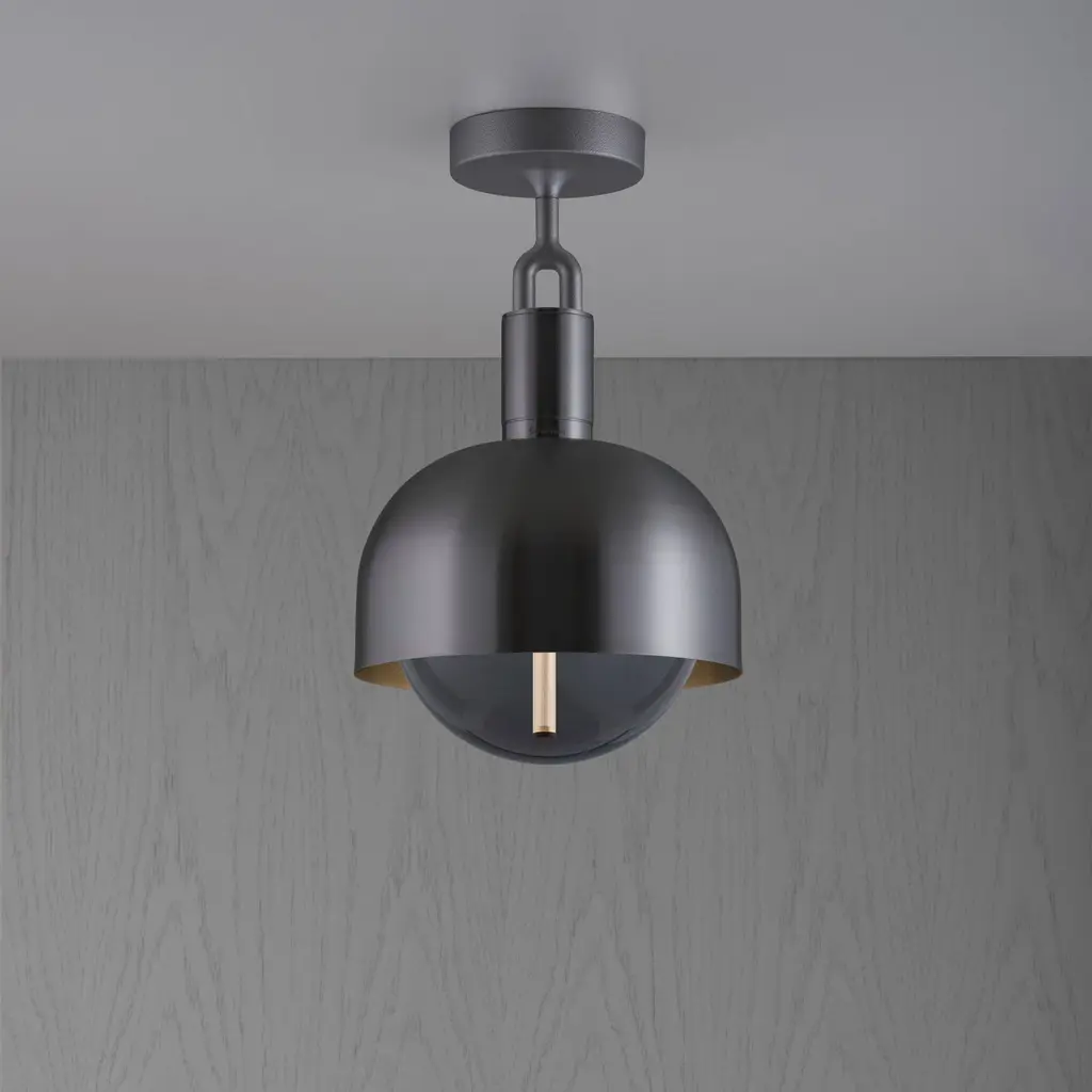 Enhance indoor ambiance with the sleek, considered character of the Forked Dome Semi-Flushmount from Buster + Punch. Descending from a circular canopy along a slender stem, it sets a small fork detail above a diamond-cut and knurl-accented cylinder housing, set above a smooth band embossed with the Buster + Punch logo. A hand-spun steel shade extends around a Forked-specific Buster bulb, contrasting its linear accents with the smooth shade texture and casting a mix of potent downlight accented by sparkles of soft uplight through vents set into the shade’s top.