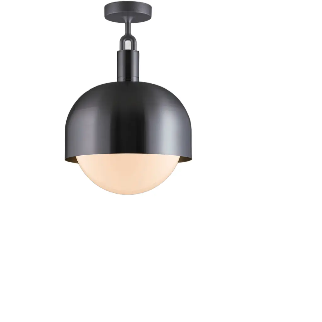 A ceiling light and shade, combining machined, hand-spun and cast solid metal, all refined by hand. It features our cast forked detailing and signature diamond-cut linear knurling. The light comes complete with a handblown opal glass globe and Forked-specific dimmable Buster Bulb, casting a functional ambient light in this configuration.