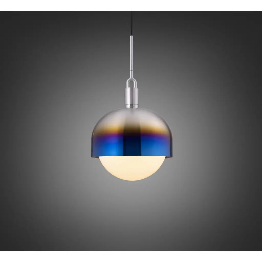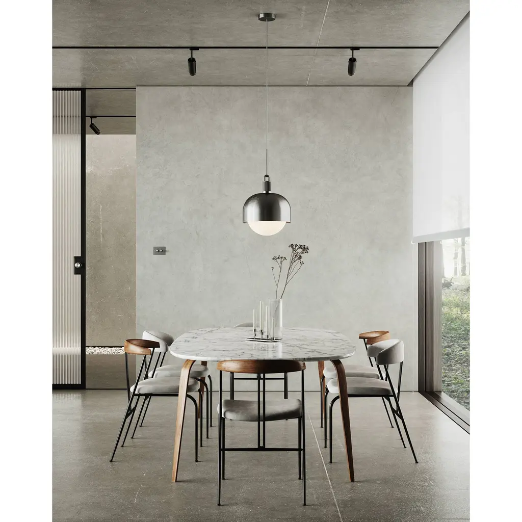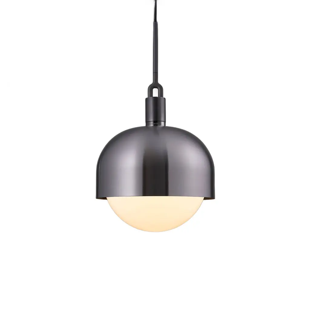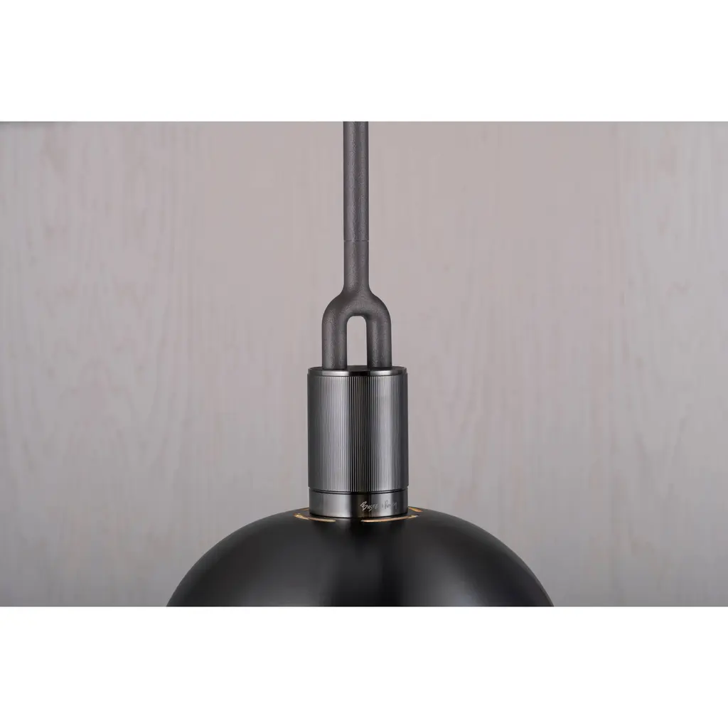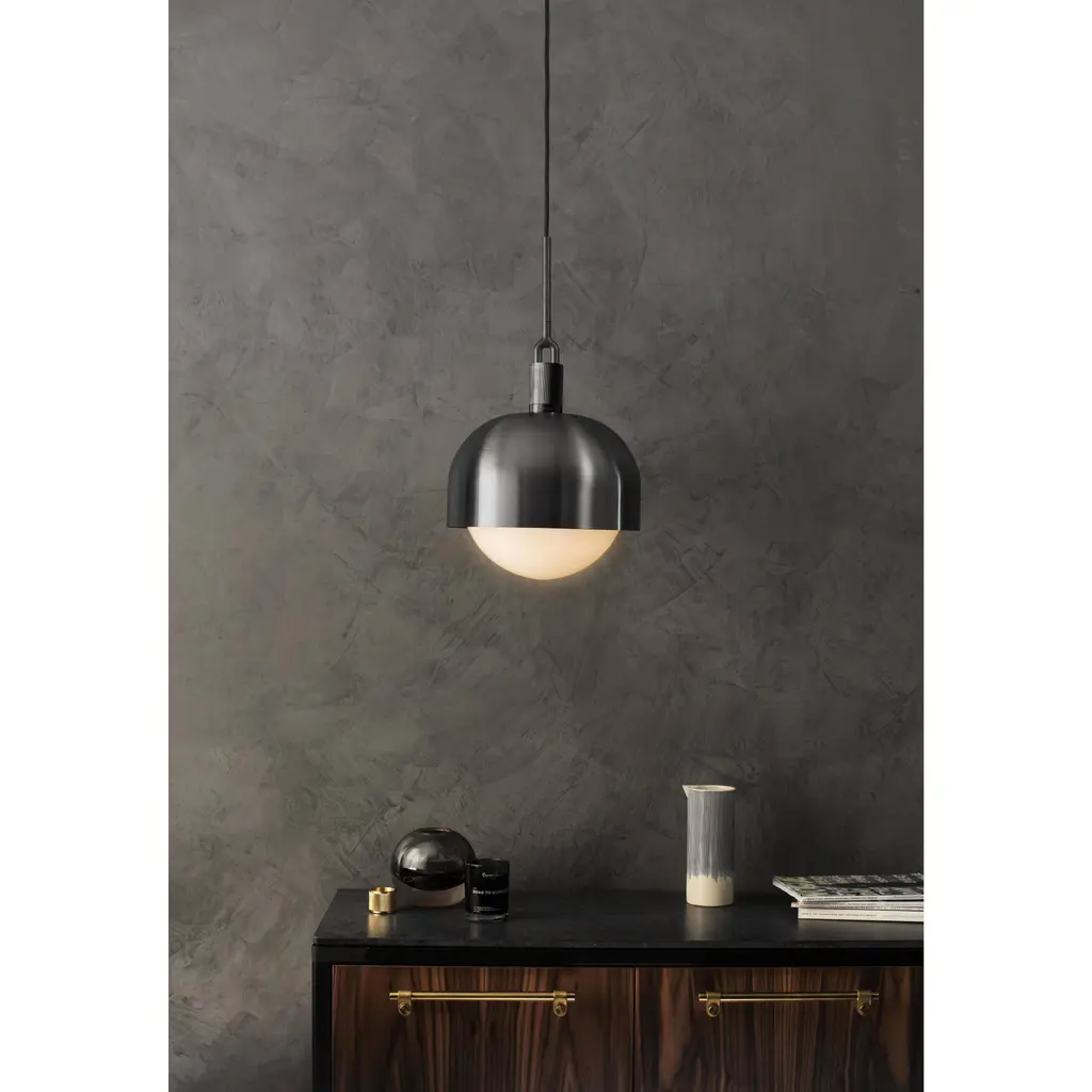 A light pendant and shade, combining machined, hand-spun and cast solid metal, all refined by hand. It features our cast forked detailing and signature diamond-cut linear knurling. The light comes complete with a handblown opal glass globe and Forked-specific dimmable Buster Bulb, casting a functional ambient light in this configuration.
