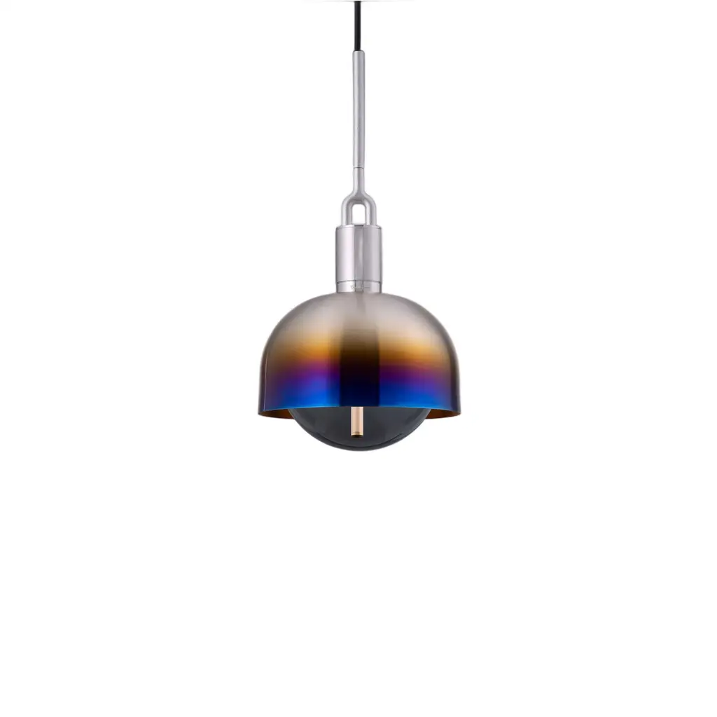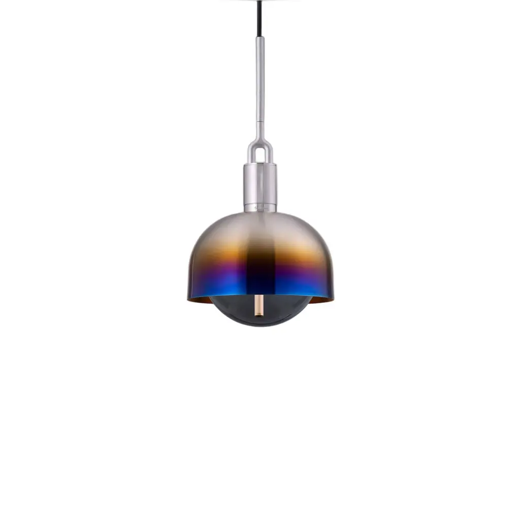 A light pendant and shade, combining machined, hand-spun and cast solid metal, all refined by hand. It features our cast forked detailing and signature diamond-cut linear knurling. The light comes complete with a handblown smoked glass globe and Forked-specific dimmable Buster Bulb, casting a soft decorative glow in this configuration.
