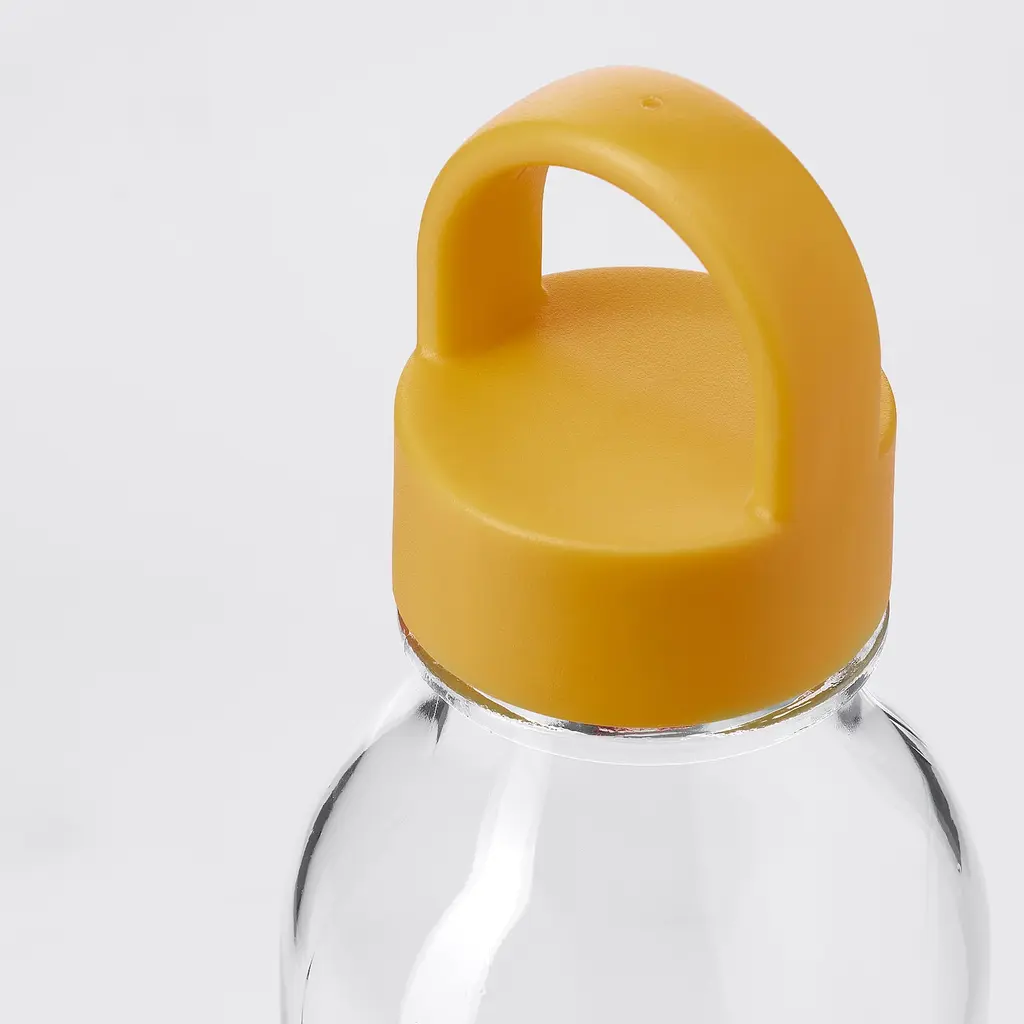 FORMSKÖN Water bottle - clear glass/yellow 17 oz. Perfect for your favorite cold or hot beverage when you’re on the go. Ready to use again and again! FORMSKÖN bottle is made of borosilicate glass which is strong, durable and withstands high temperatures.