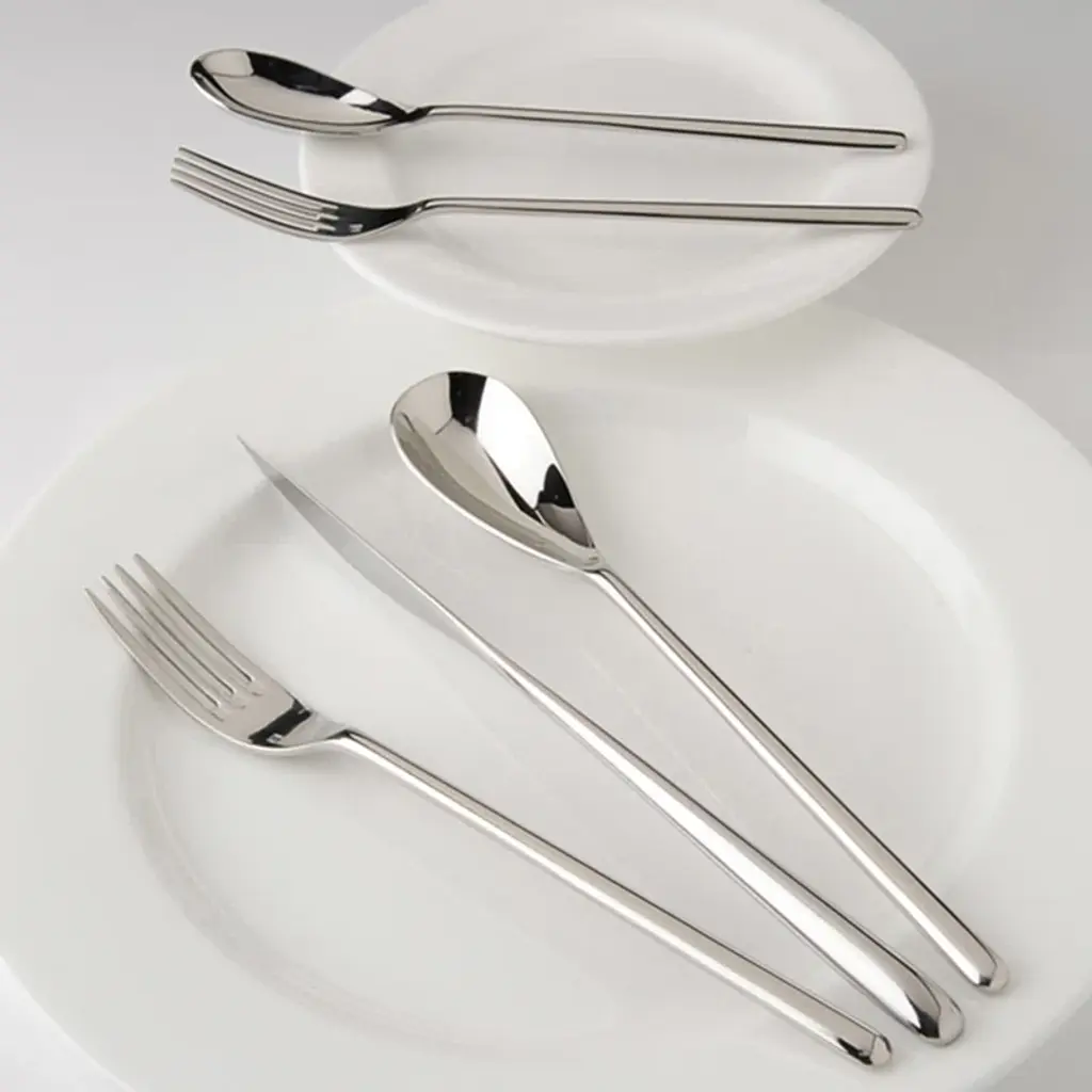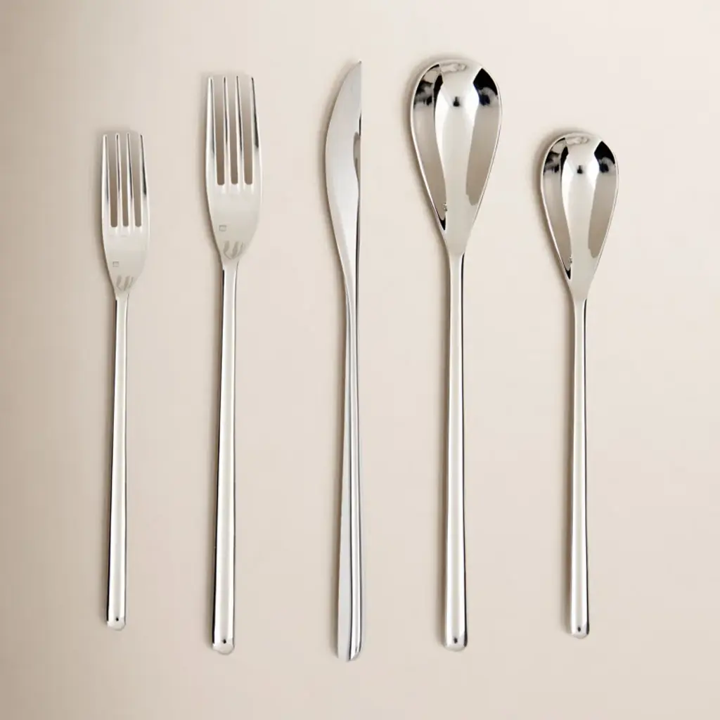 Delicately sculpted for an elegant feel, this modern design delights the eye and adds flair to your table. This flatware embodies a passion for design combined with a commitment to the finest materials. Made from heavy-gauge 18/10 stainless steel (the heaviest gauge used for tableware), each implement provides a comfortable heft and balance in your hand. The set contains a salad/dessert fork, table fork, table knife, dessert/oval soup spoon, and tea/coffee spoon.