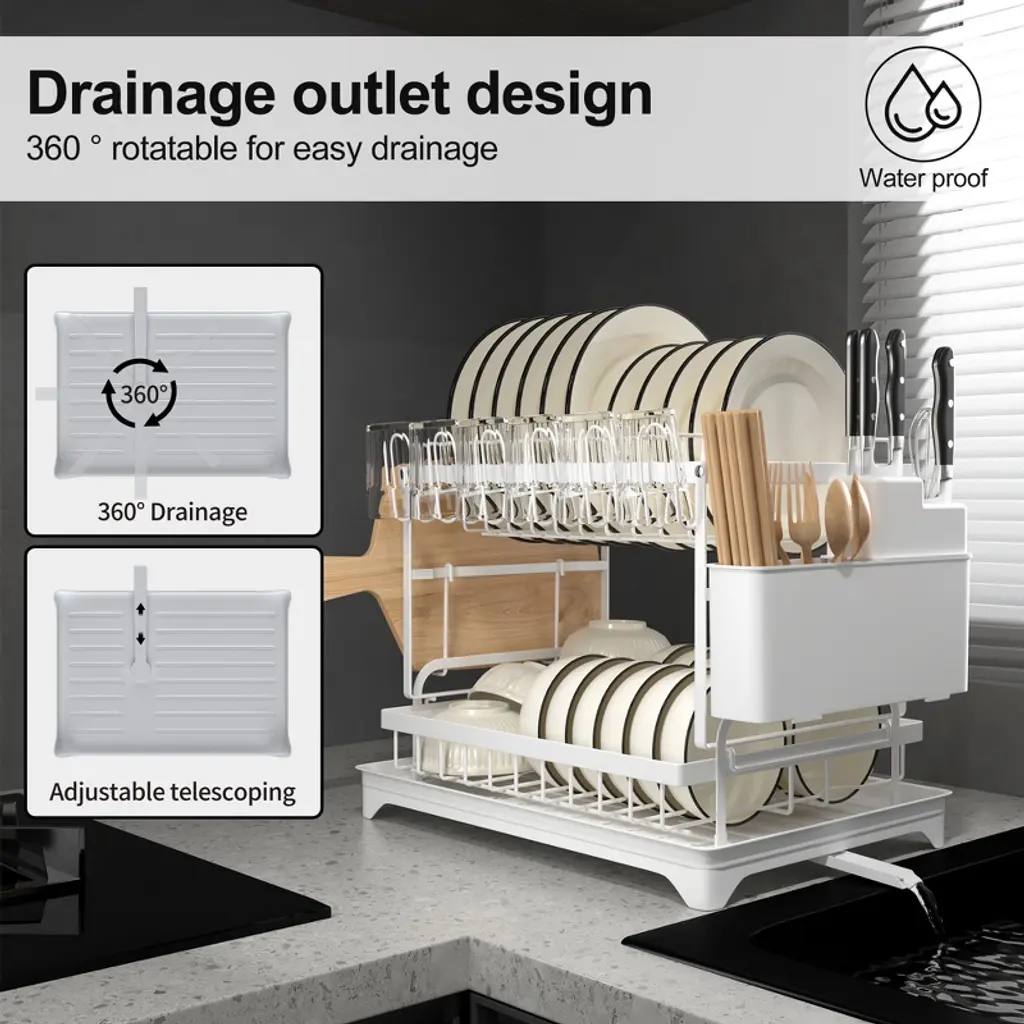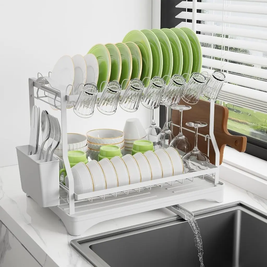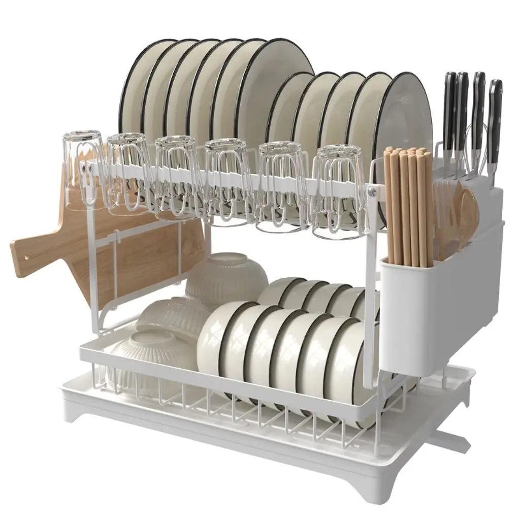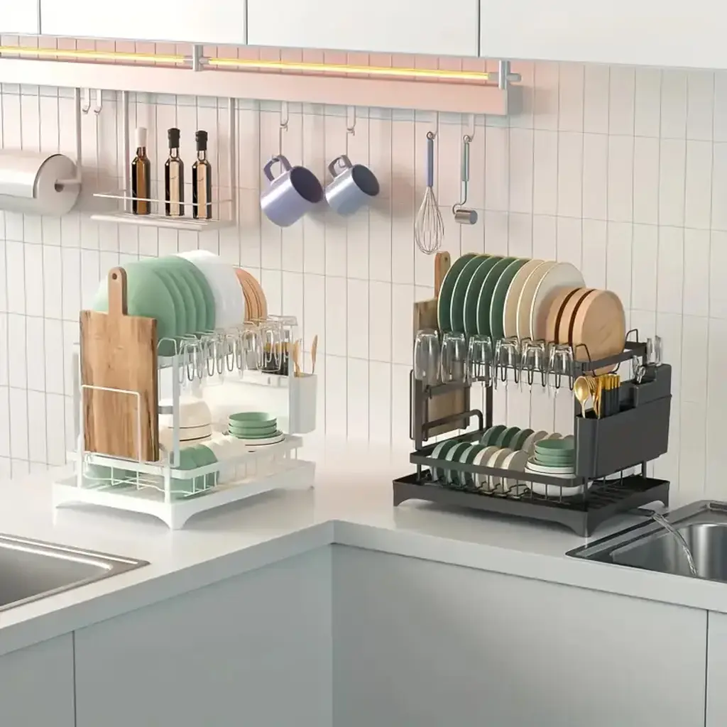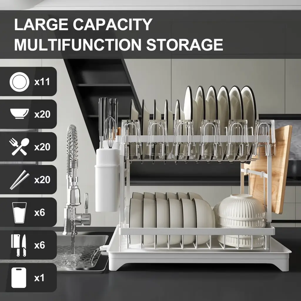 Dish Drying Rack is a super solution for your kitchen. This black dish rack is made with heavy-duty steel, capable of holding tons of dishes and utensils. Equipped with a Utensil Holder, Cutting Board Holder, and Cup Holder, compartments can be arranged to suit your needs. With the plastic draining tray, your counter will be from the drips of the drying dishes, so no wasting paper towels on clean up after you've put your dishes away.