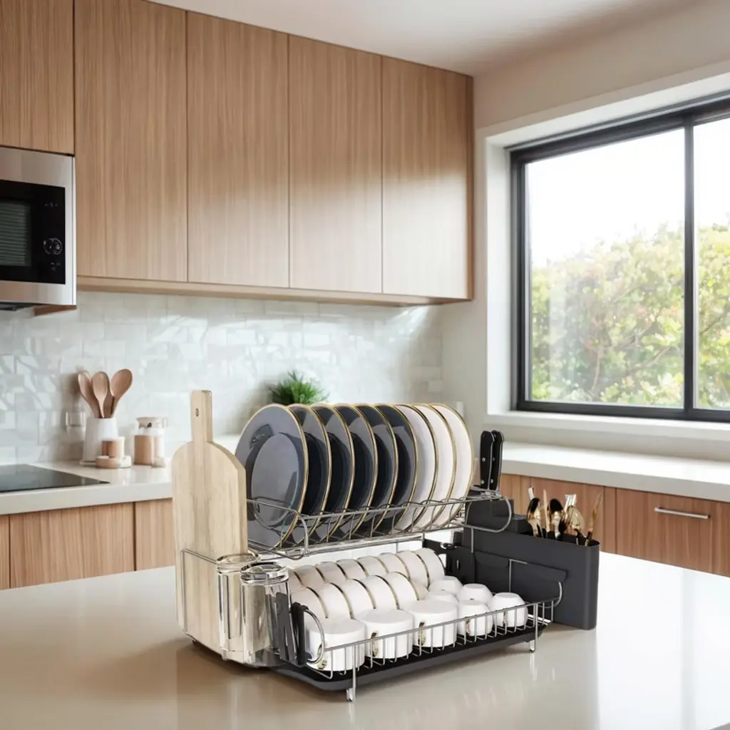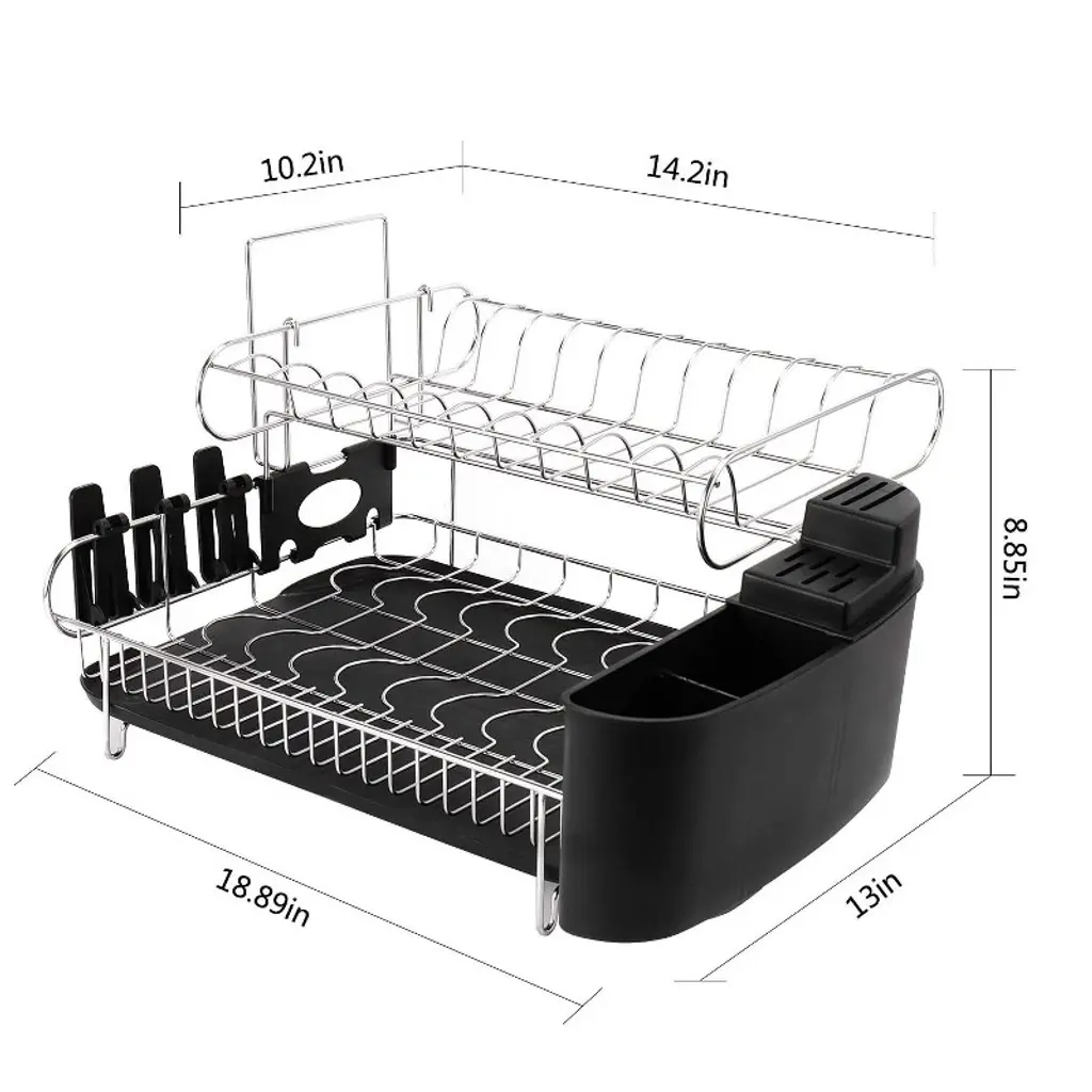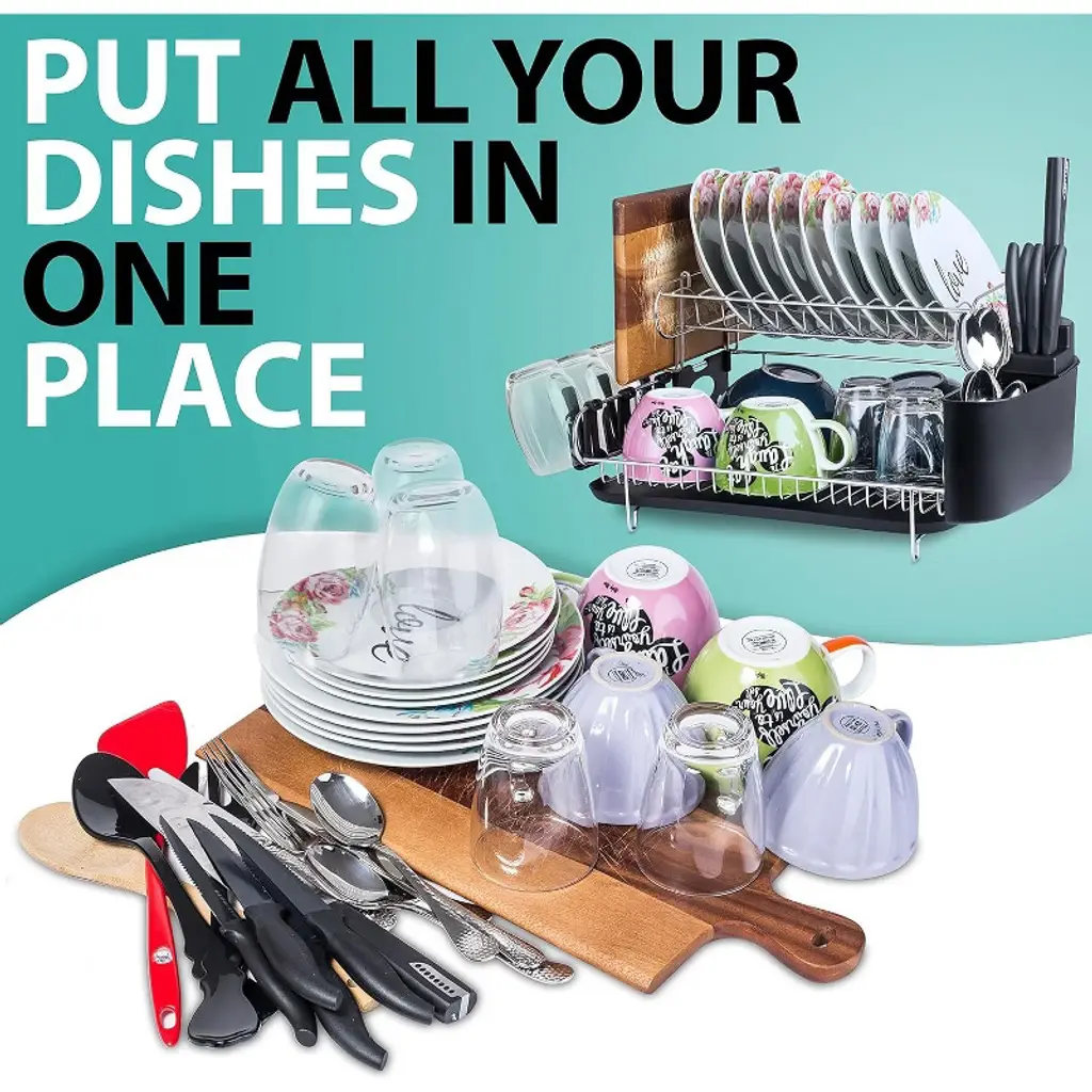 The 2 Tier Dish Drying Rack is a practical and stylish addition to any kitchen. Made from heavy-duty metal, it is built to last. The rack includes utensil holders, cup holders, knife holders, and a chopping board holder, giving you flexible storage for all your dishes and kitchen tools. Designed with two tiers, this compact dish rack saves valuable counter space while offering a capacity. Plates, bowls, cups, and cutlery can be stored separately, allowing air to circulate and items to dry quickly. The sturdy frame is supported by non-slip rubber feet that keep it steady and protect your worktop from scratches. Every part can be removed and cleaned easily, making it simple to maintain hygiene in your kitchen. Dimensions: 18.89'' x 13'' x 8.85''. Perfect for small kitchens or busy households, this dish drying rack combines durability, function, and convenience. It helps keep your kitchen organized, tidy, and efficient while providing a reliable solution for everyday dish storage.