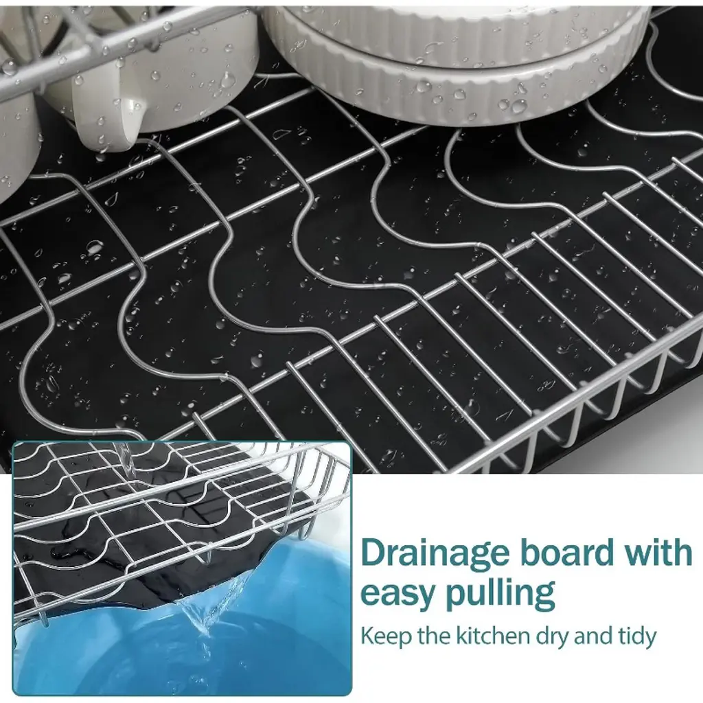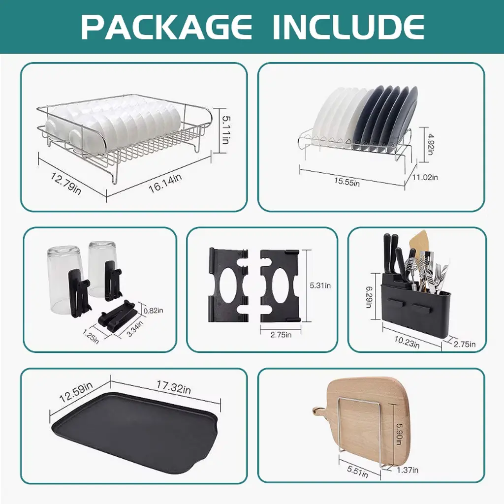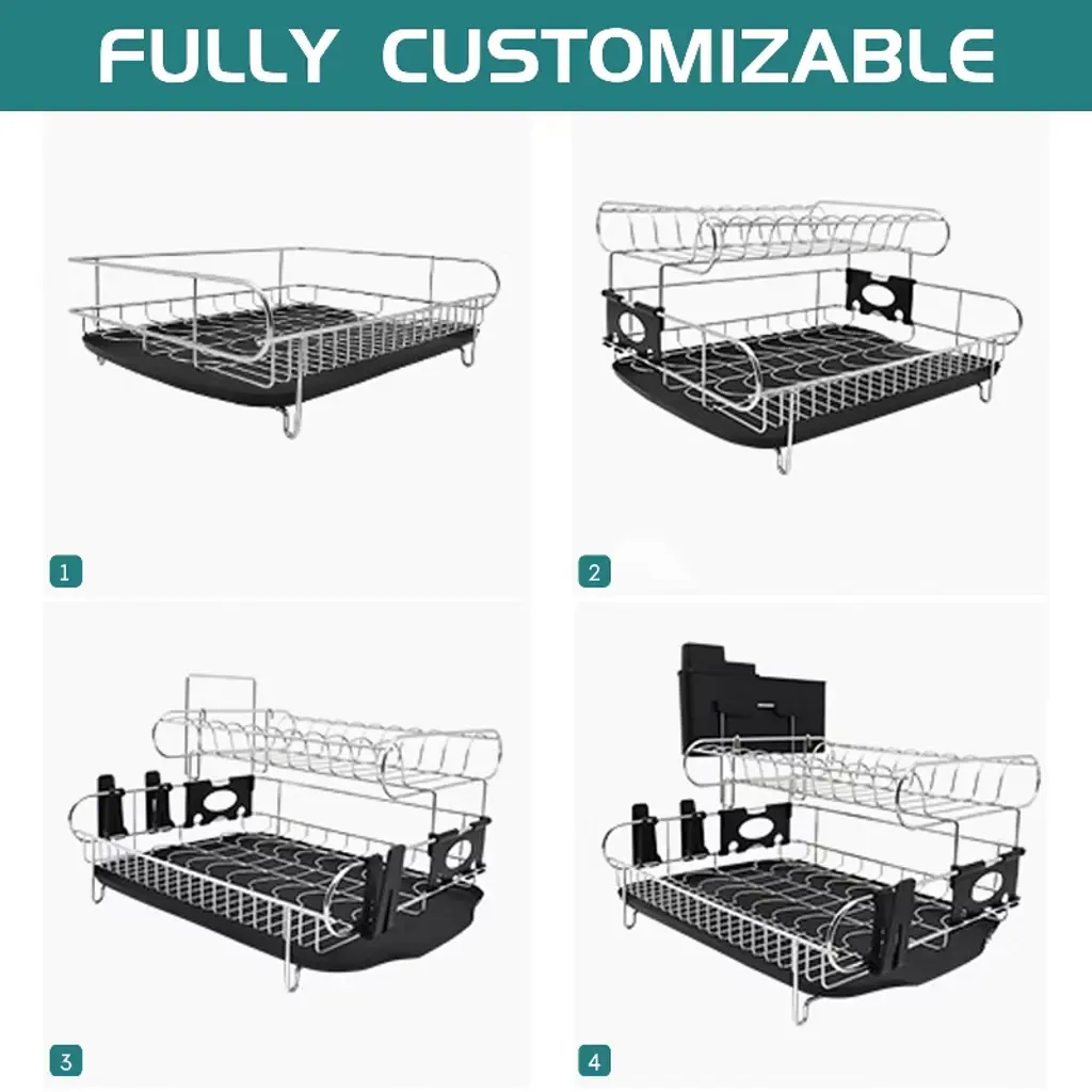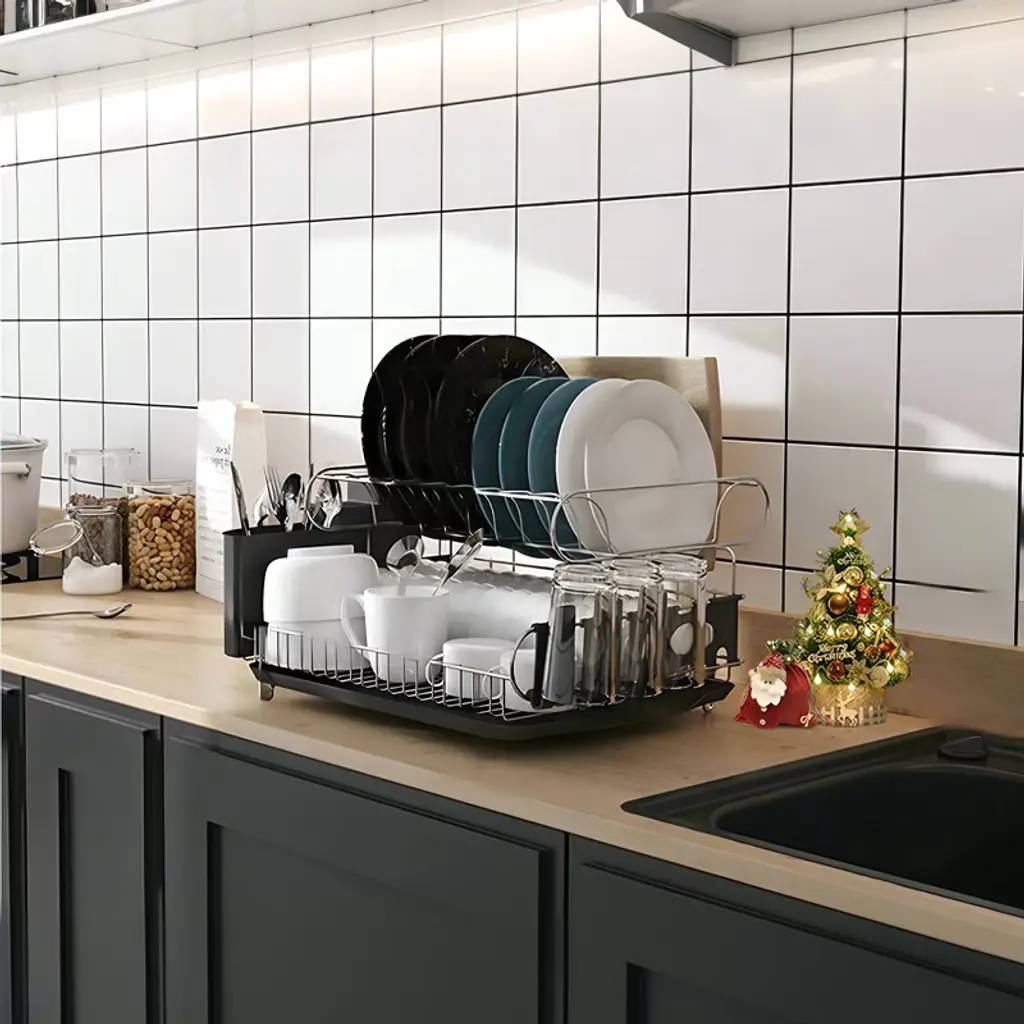 The 2 Tier Dish Drying Rack is a practical and stylish addition to any kitchen. Made from heavy-duty metal, it is built to last. The rack includes utensil holders, cup holders, knife holders, and a chopping board holder, giving you flexible storage for all your dishes and kitchen tools. Designed with two tiers, this compact dish rack saves valuable counter space while offering a capacity. Plates, bowls, cups, and cutlery can be stored separately, allowing air to circulate and items to dry quickly. The sturdy frame is supported by non-slip rubber feet that keep it steady and protect your worktop from scratches. Every part can be removed and cleaned easily, making it simple to maintain hygiene in your kitchen. Dimensions: 18.89'' x 13'' x 8.85''. Perfect for small kitchens or busy households, this dish drying rack combines durability, function, and convenience. It helps keep your kitchen organized, tidy, and efficient while providing a reliable solution for everyday dish storage.