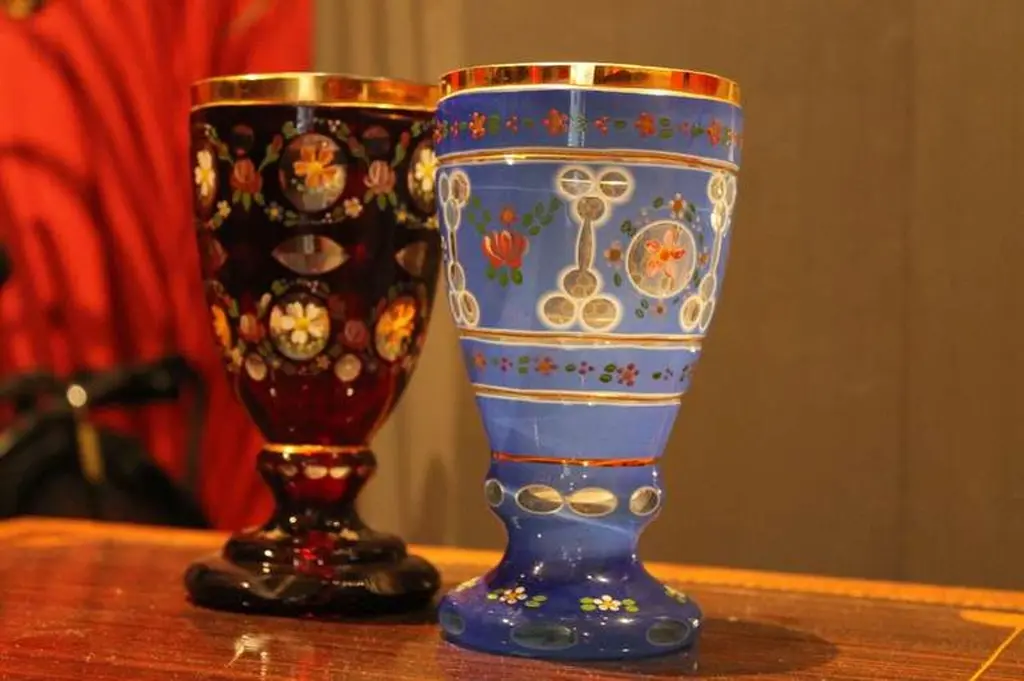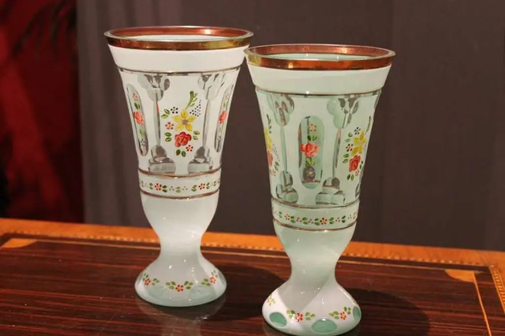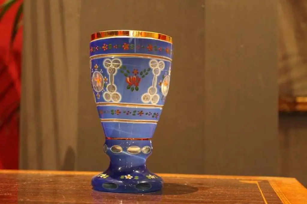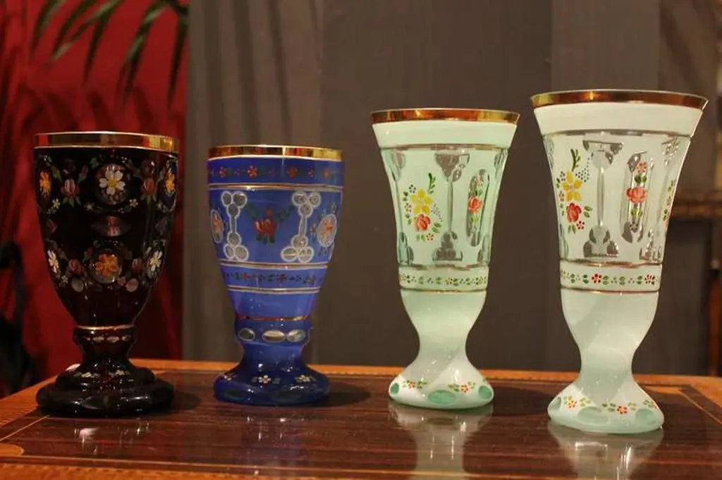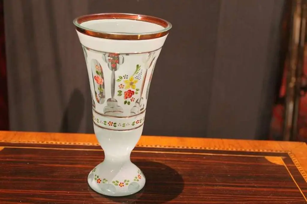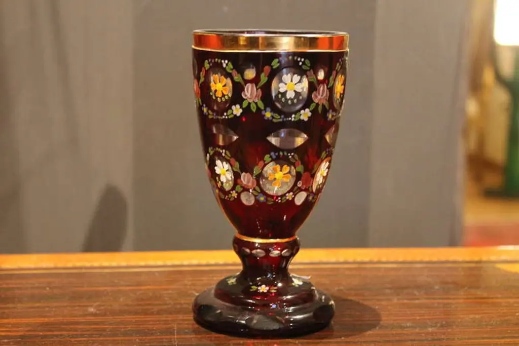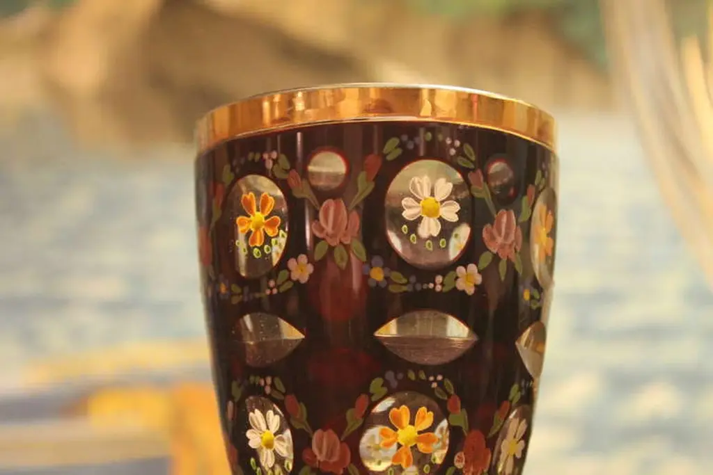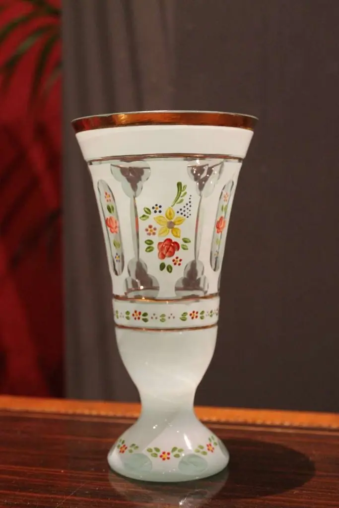 Indulge in the captivating elegance of these early 20th century Bohemian cut crystal glasses, each adorned with stunning hand-painted floral motifs in vivid colors.Crafted with exceptional skill, these glasses showcase the unparalleled artistry of Bohemian glassmaking. The intricate patterns and vivid hues, ranging from lush greens to vibrant reds and blues, transform each piece into a true work of art.Meticulously cut and polished, the crystal refracts light in mesmerizing ways, creating a sense of depth and movement within the designs. The delicate yet sturdy construction ensures lasting durability, allowing you to enjoy these treasures for years to come.Available individually or as a set of four, these glasses would make a captivating addition to any refined home. Use them to serve your finest beverages, or display them as decorative objets d'art, showcasing your appreciation for timeless Bohemian craftsmanship.Measurements:- Height: 19 cm- Diameter: 10 cmPrice: IS per glass