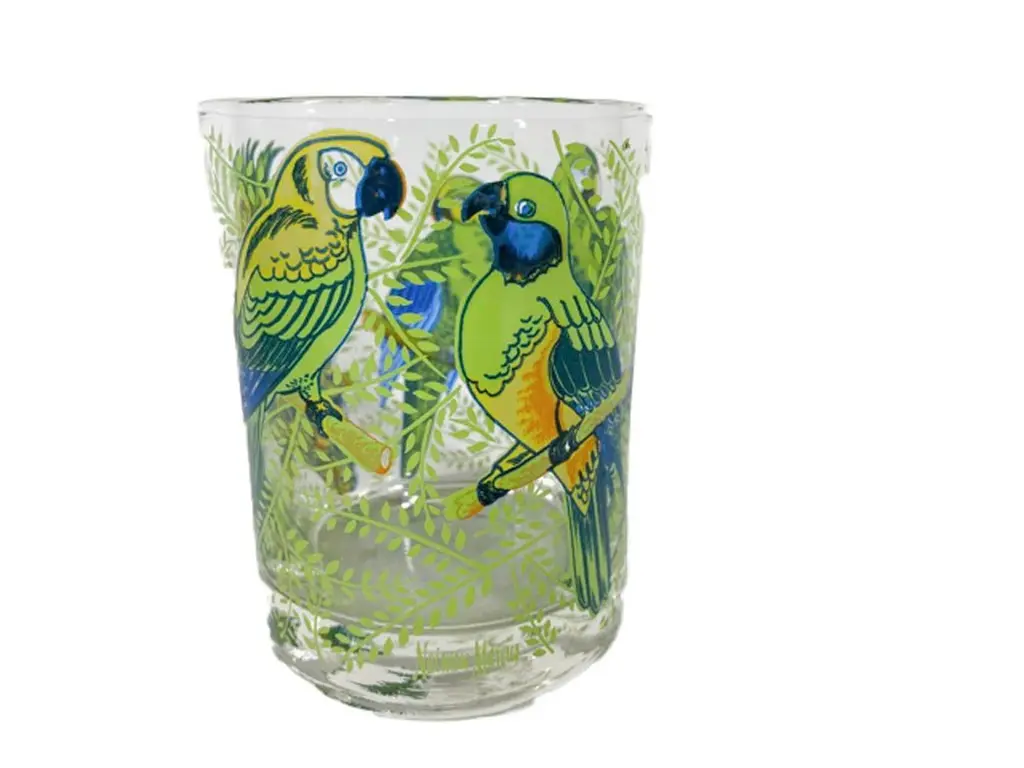 Four large vintage rocks glasses with brightly colored parrots sitting among leafy branched. Private labeled for Neiman Marcus and likely made by Cera Glass.