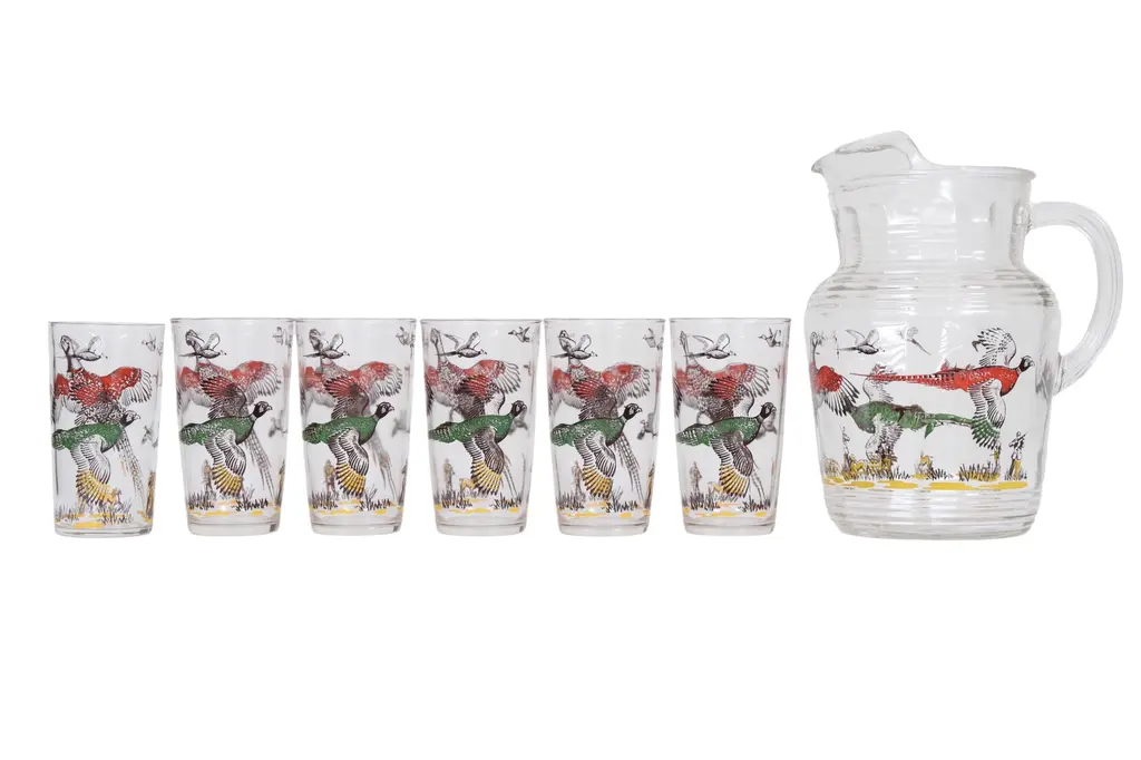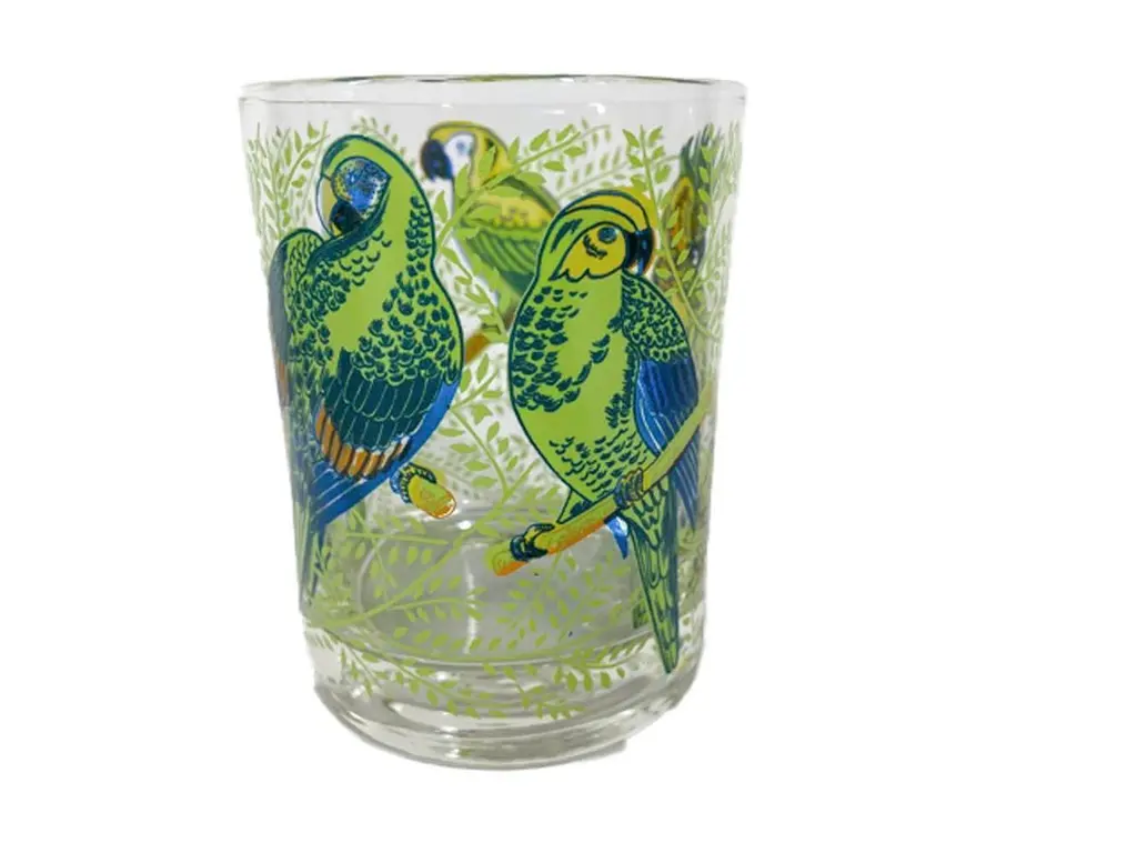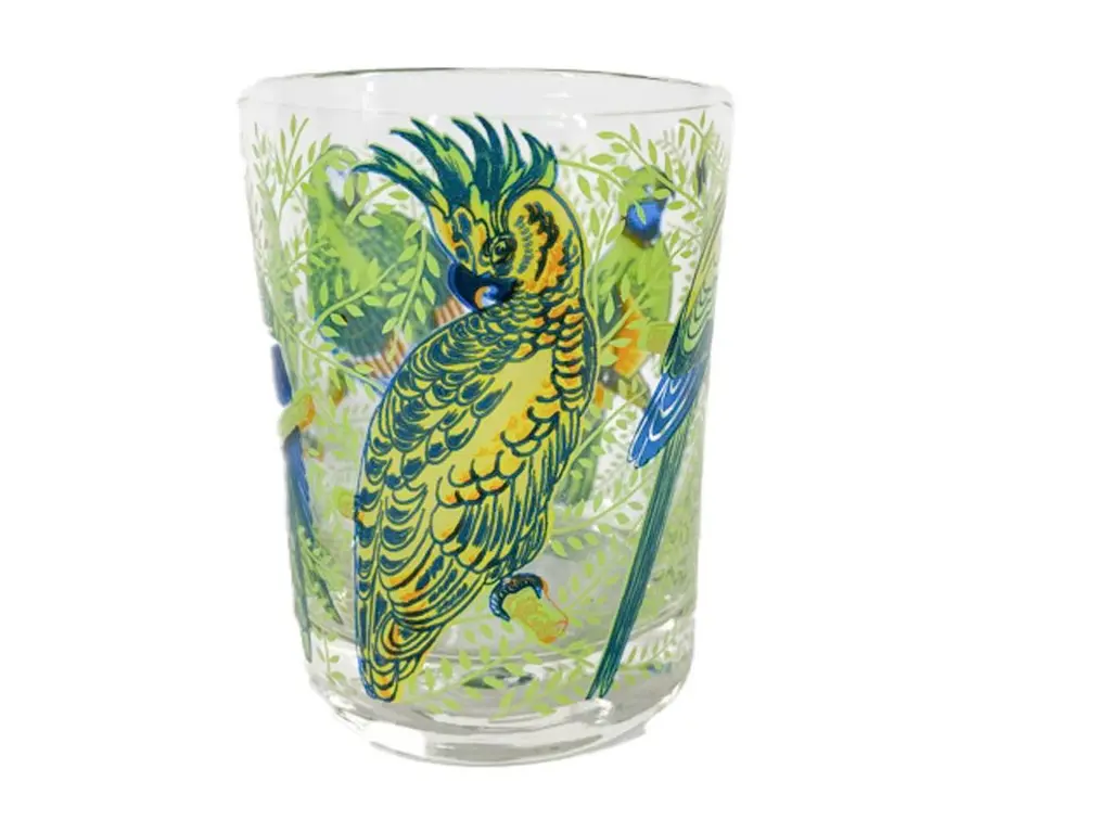 Four Vintage Neiman-Marcus Rocks Glasses With Parrots Among Leafy Branchers