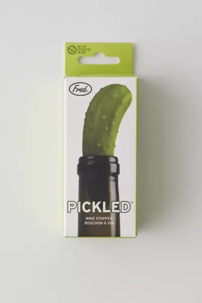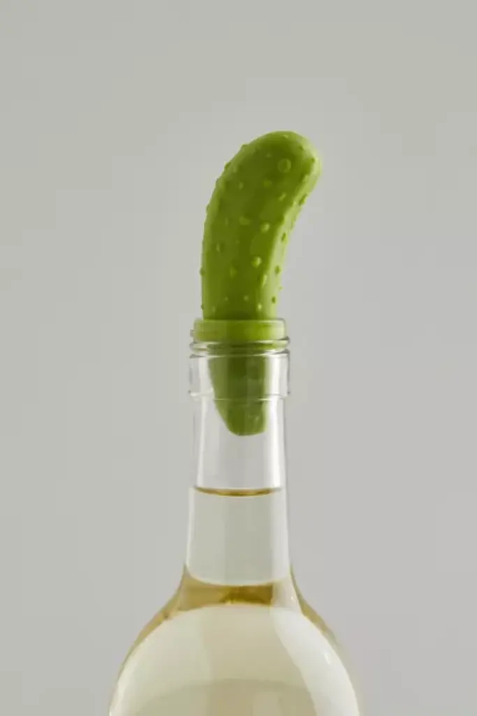 Keep your bottled beverages crisp with this kitschy bottle stopper shaped like a green pickle. Perfect for keeping your beverages fresh for days. **Features** \- Pickle-shaped bottle stopper \- Crafted from silicone to keep your bottled beverages fresh \- Easy to clean - just pop it in the dishwasher **Content + Care** \- Silicone \- Food safe \- Dishwasher safe \- Not microwave or oven safe \- Imported **Size** \- Dimensions: 4"l x 1.85"w x 1.85"h
