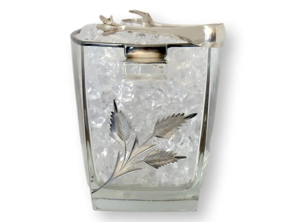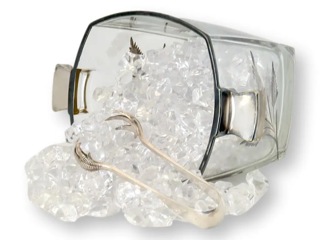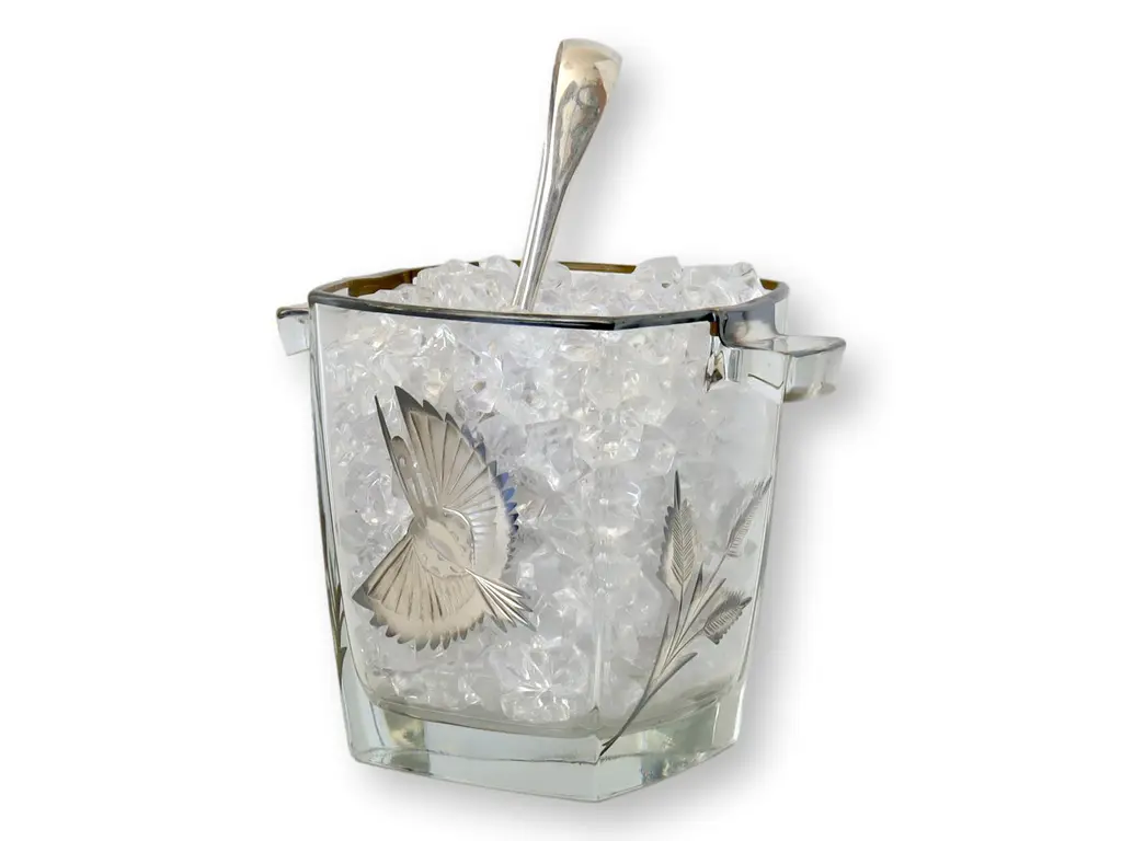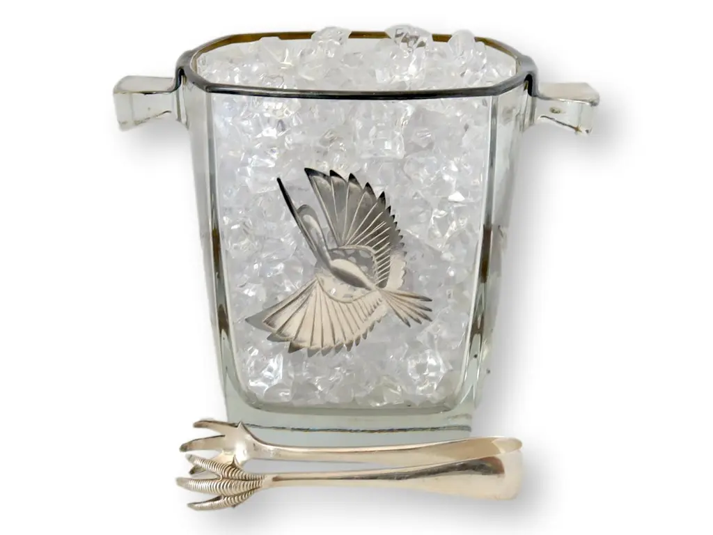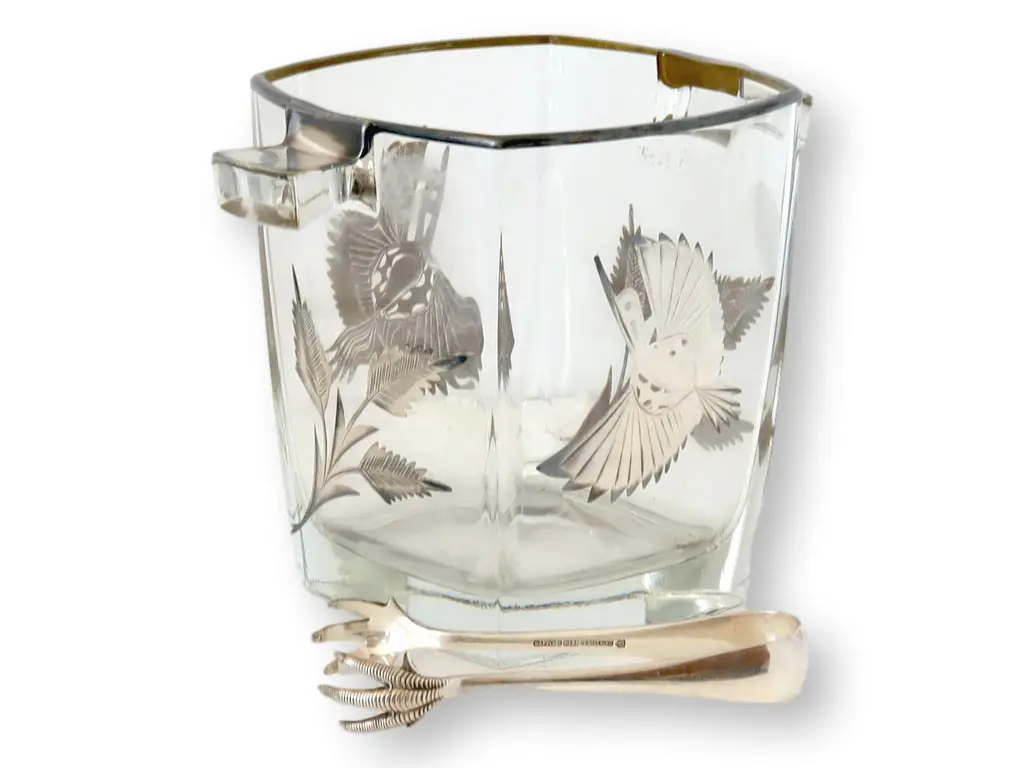 Art Deco French ice bucket, adorned with a striking heavy silver overlay bird pattern. This piece exudes the glamour and sophistication of the Art Deco era. Additionally, it comes complete with English Mappin and Webb ice tongs, enhancing your cocktail service with both style and functionality. Dimensions: ice bucket, 7.25"L x 5.25"W x 5.5:H; tongs, 5"L x 2.25"W x .75"H. Mappin & Webb tongs; ice bucket stamped France.