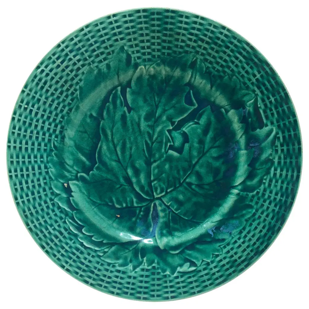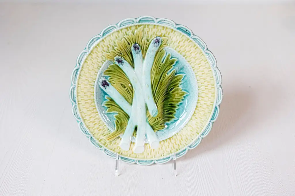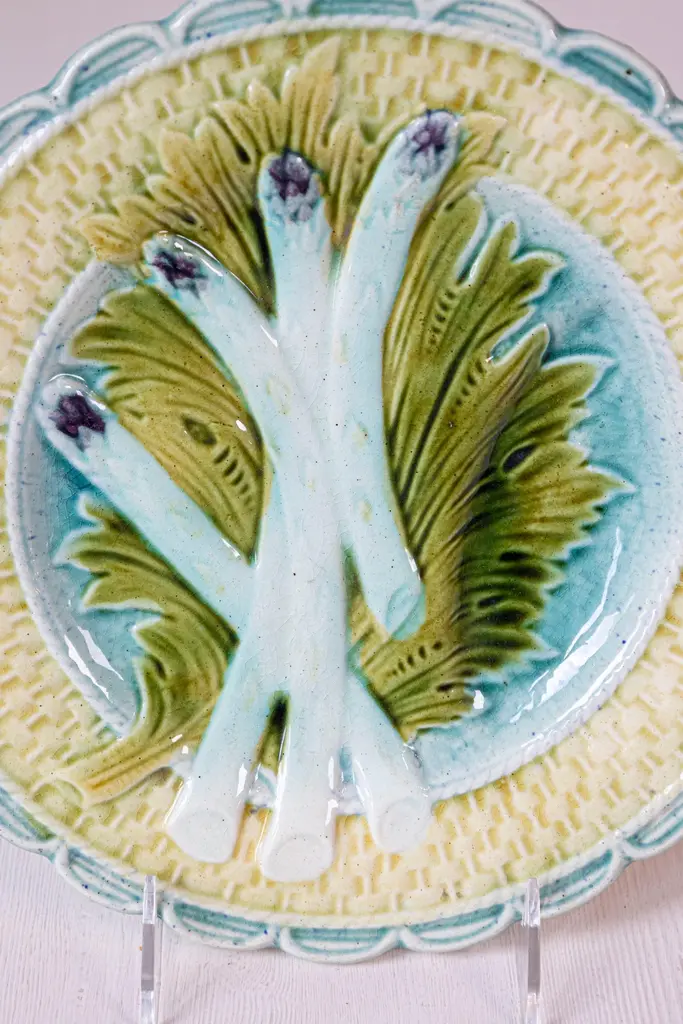 A French Napoleon III period majolica asparagus plate from the mid-19th century, with scalloped edge, turquoise and chartreuse style tones. We currently have three plates available, priced and sold individually. Created in France at the beginning of the reign of Emperor Napoleon III, each of these three majolica plates features four asparagus with purple heads, resting on a luscious green leaf. A turquoise scalloped edge surrounds a chartreuse toned wicker style ring. With their elegant decor, these French majolica plates circa 1850 will bring a fresh touch of elegance to any home decor. They are priced $295 each and have each a slightly different hue.