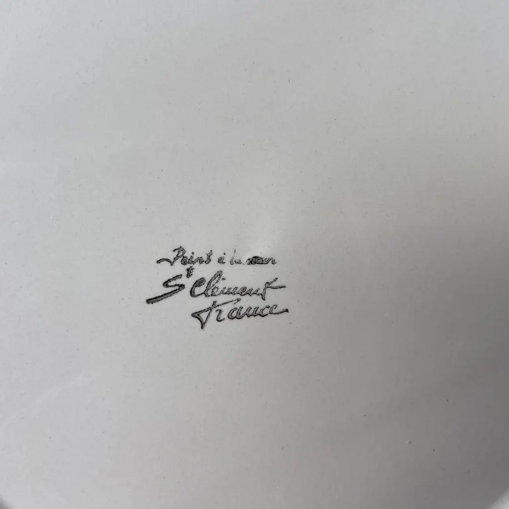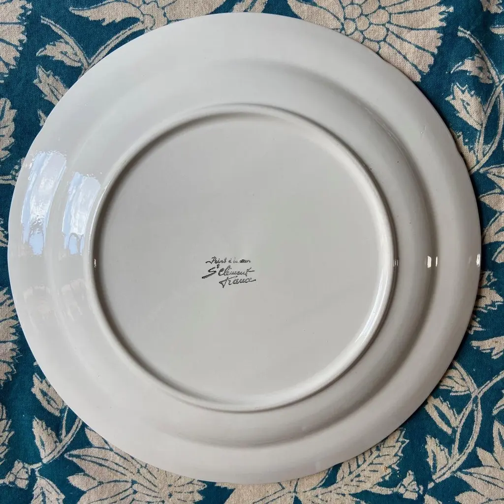 Superb French Asparagus Art Nouveau plates.Colors are vibrant, and the three asparagus spears have puple tips. Saint Clément's mark stamped at the underside. Circa 1920.