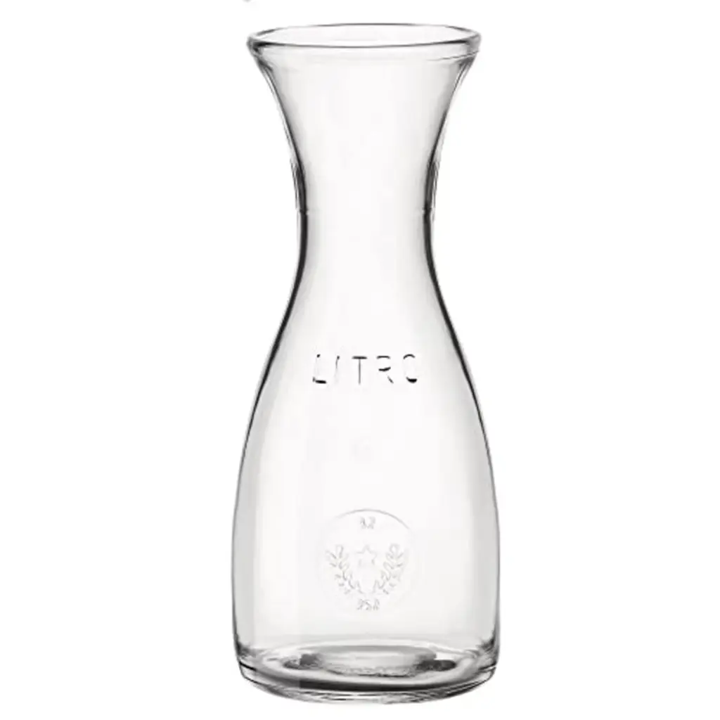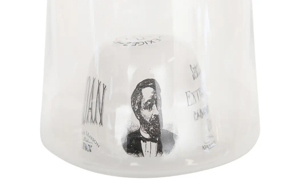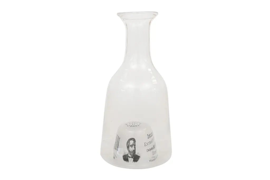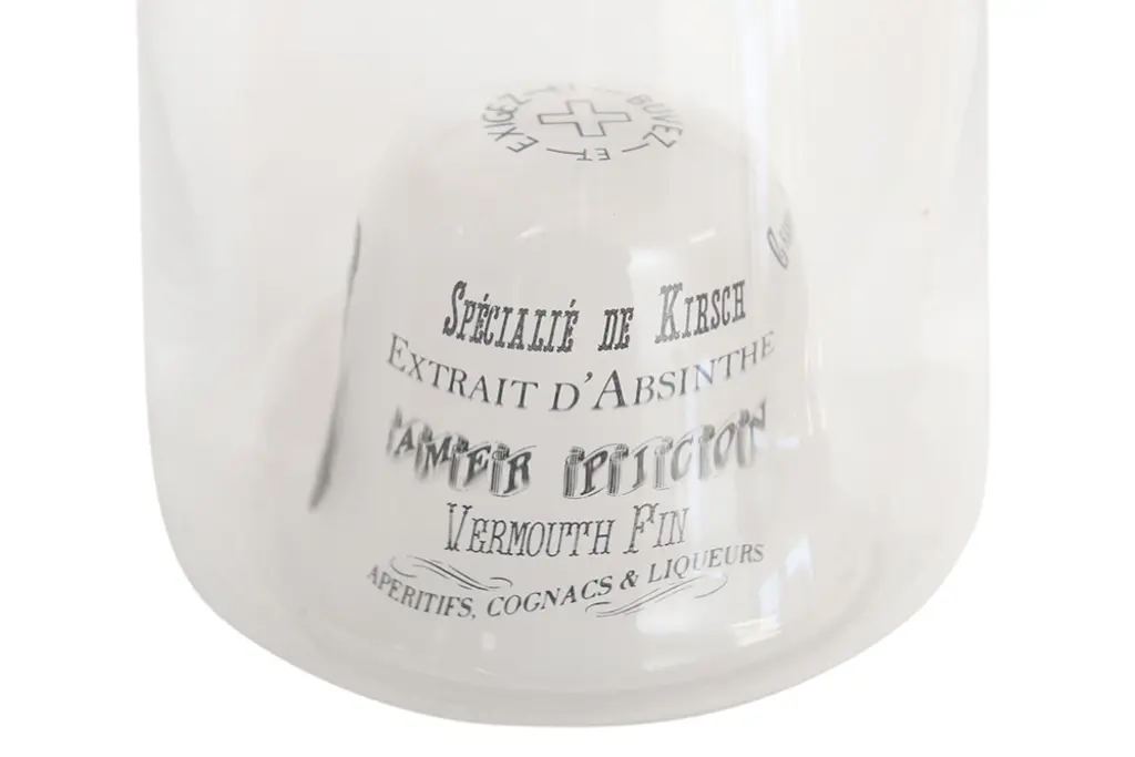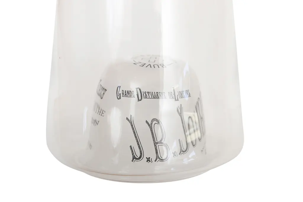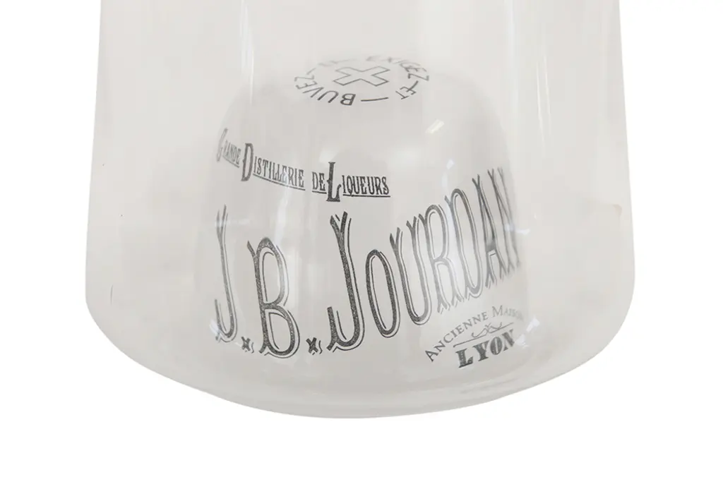 A French bistro glass carafe with punt. Print reads ���Grand Distillery de Liqueurs J.B Jourdain����� and "Specialie de Kirsch, Extrait d����Absinthe, Amer Picon, Vermouth Fin Aperitifs, Cognacs & Liqueurs". On the other side is a black and white portrait of J.B Jourdain.