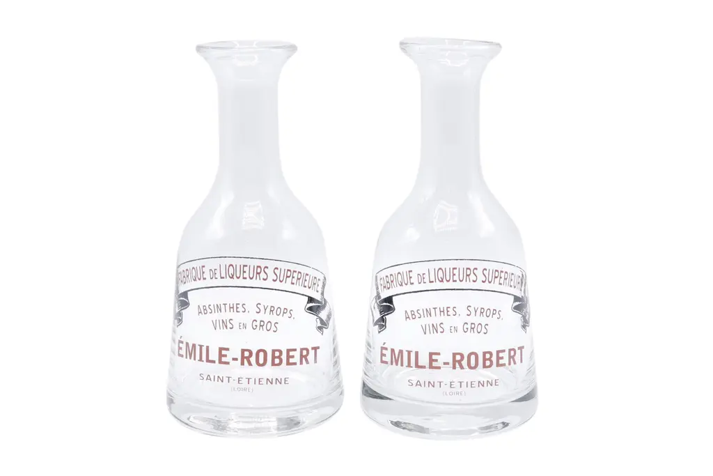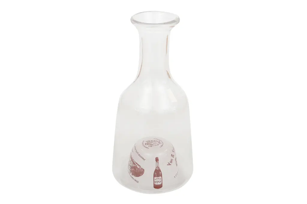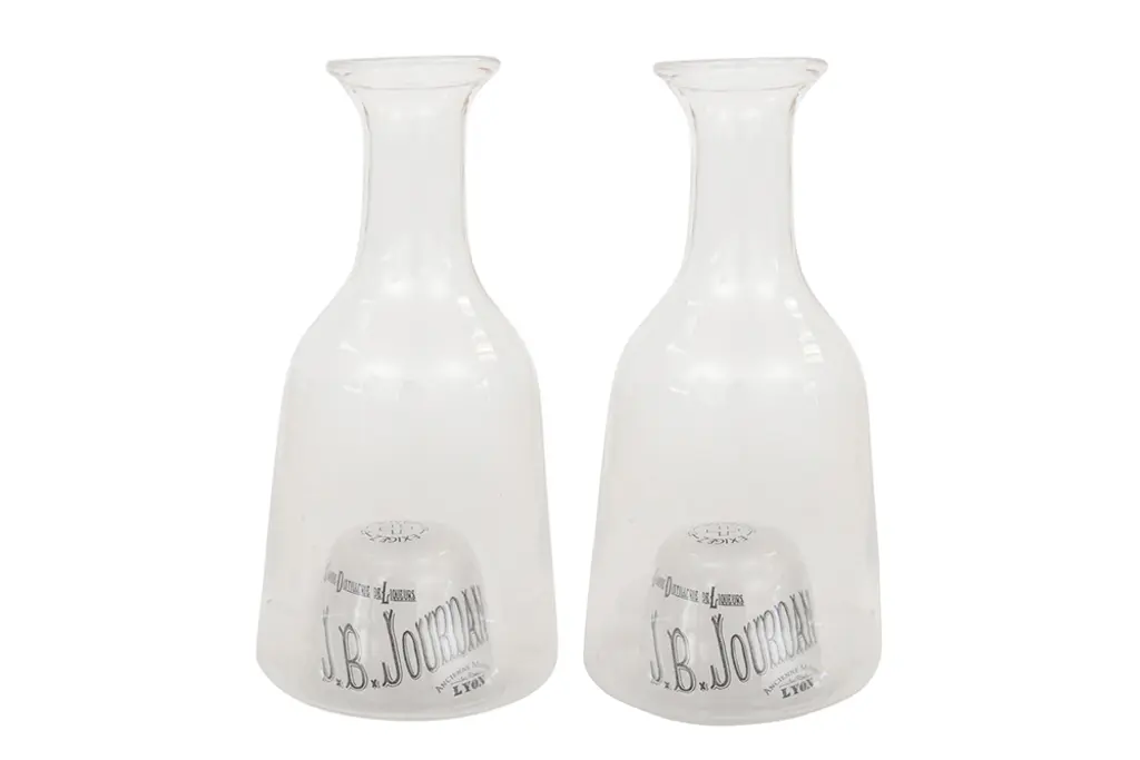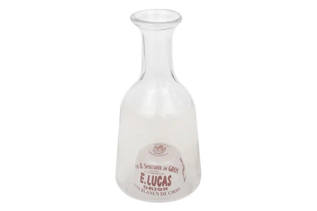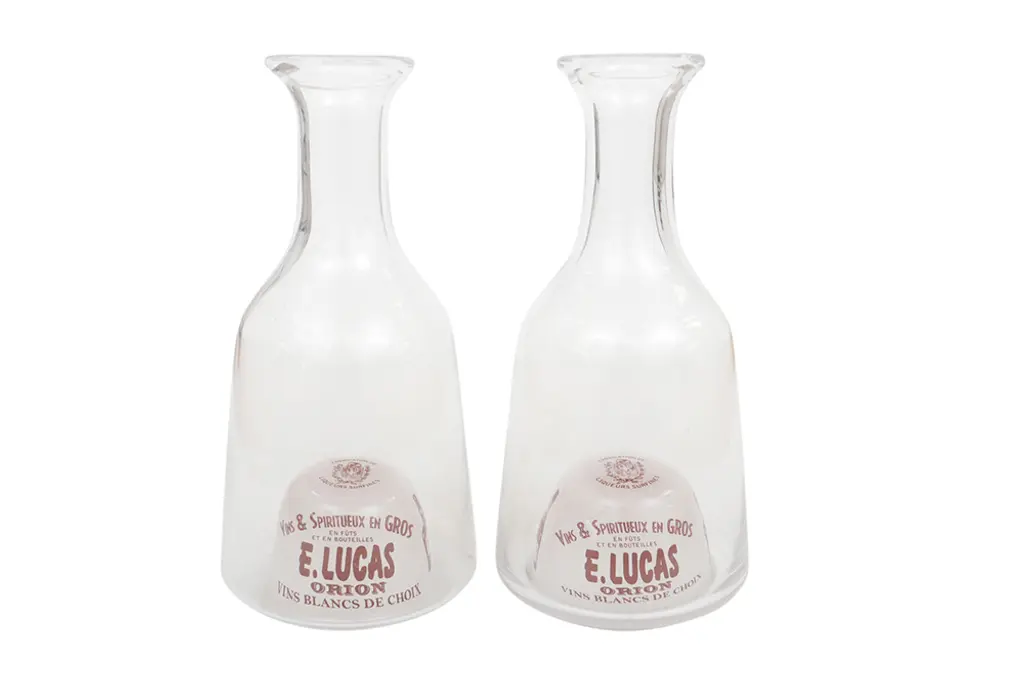 A pair of French bistro glass carafes with punts. Print reads in red on the front ���Vins & Spiriteuex en GROS, en Futs et en Bouteilles E.LUCAS Orion Vins Blancs de Choix". On the other side is an image of a factory framed with "Installation Toute Moderne France Vielles Eaux-de-Vie des Meilleurs Crus". The punt is printed with "Fabrication de Liqueurs Surfines" around a depiction of a wooden shield carved with a cross, topped in a hat and framed with a wreath. Dimensions per carafe.